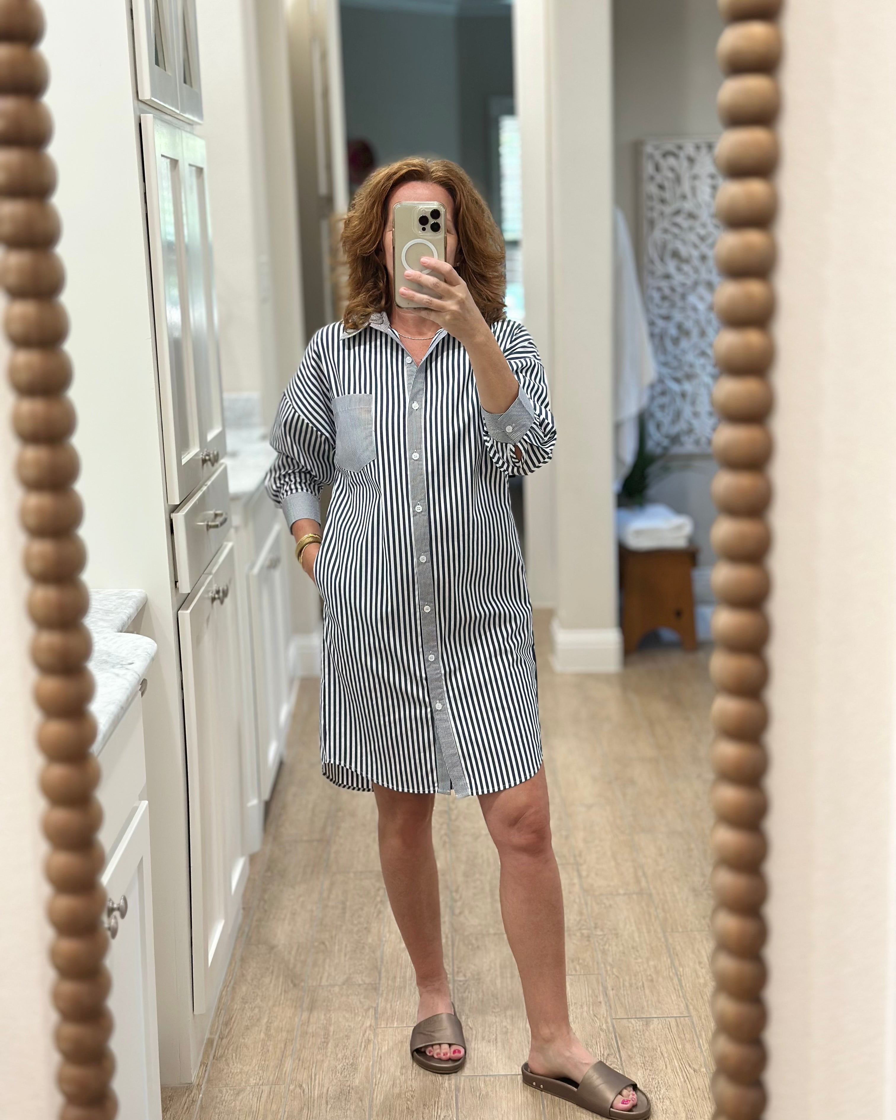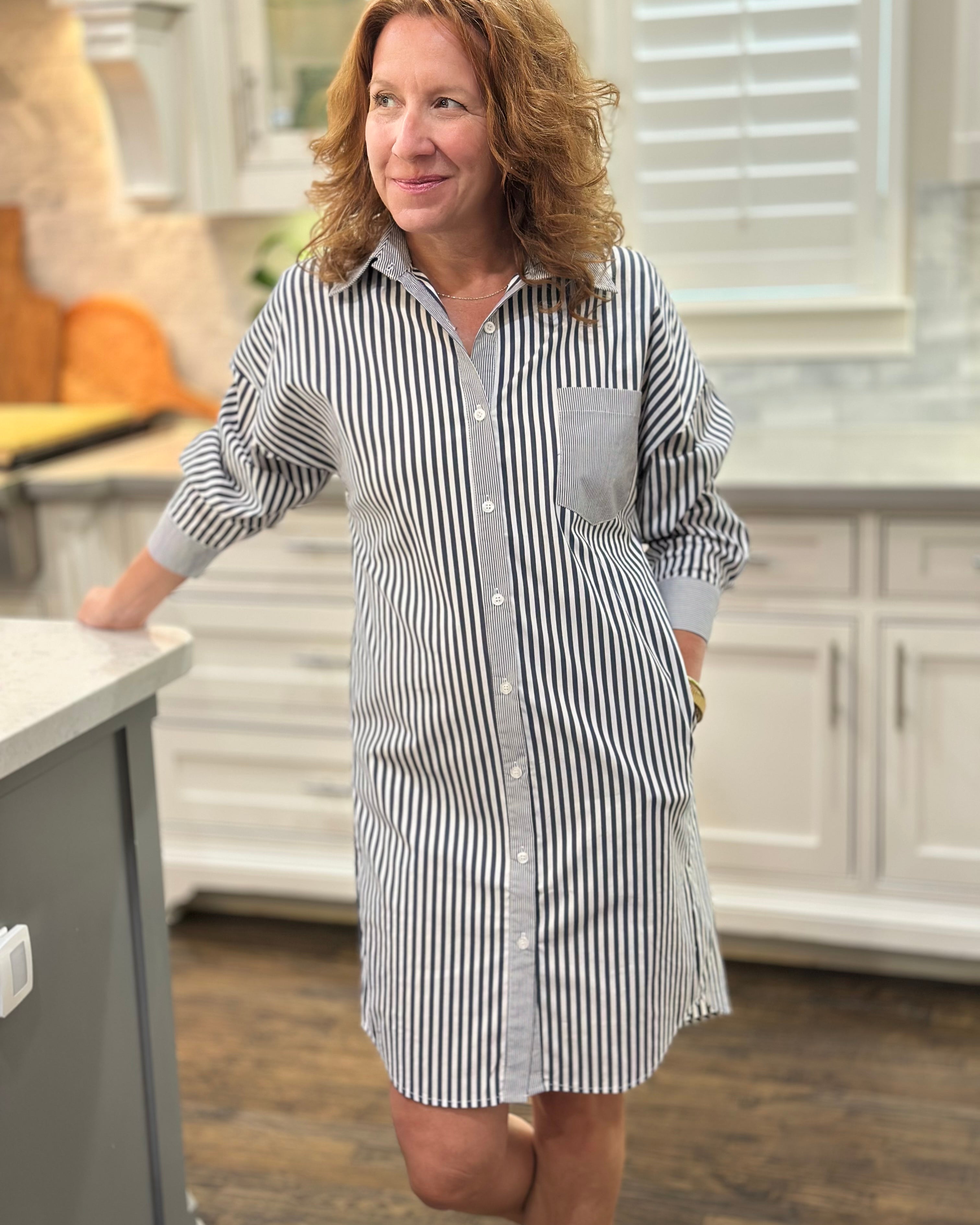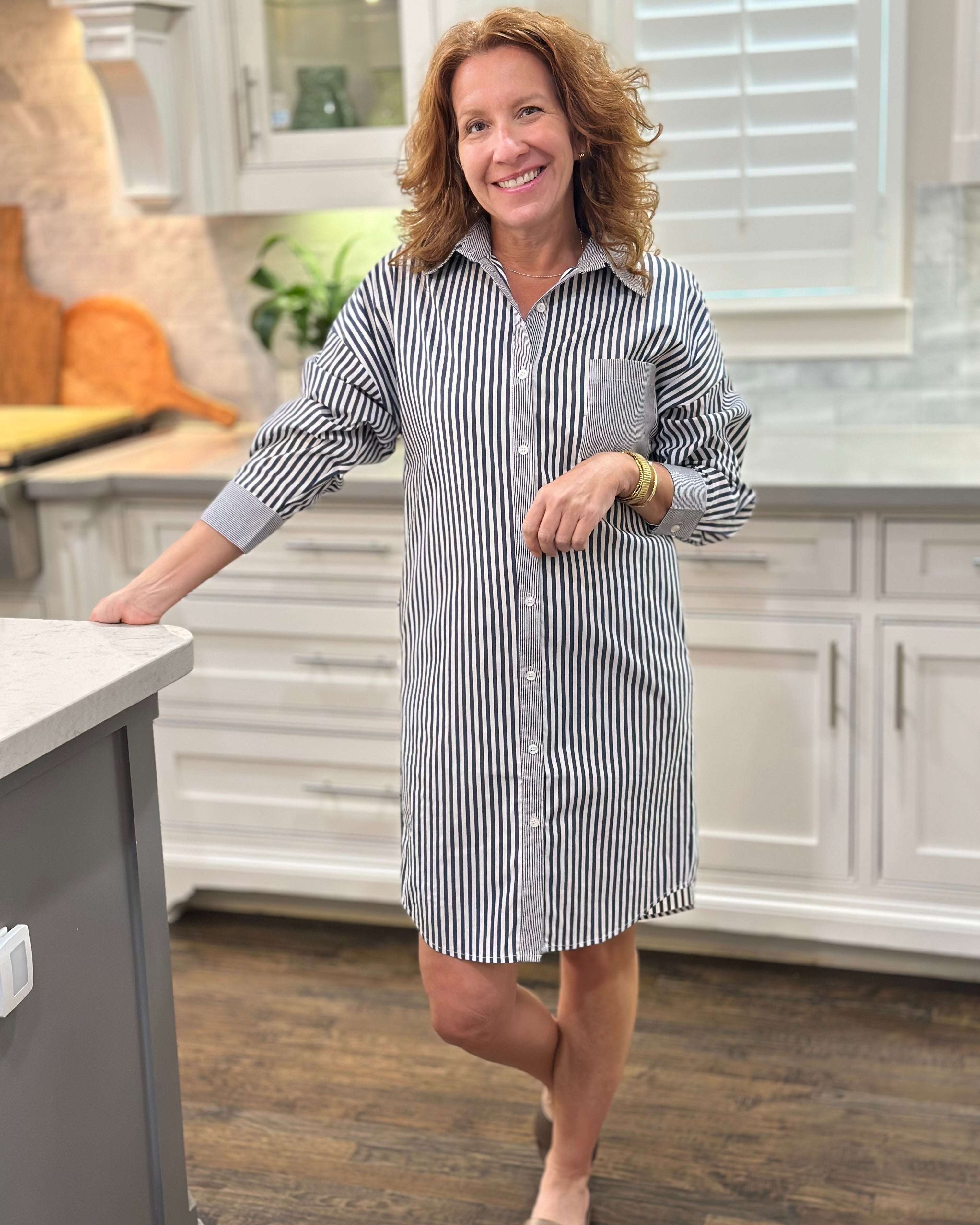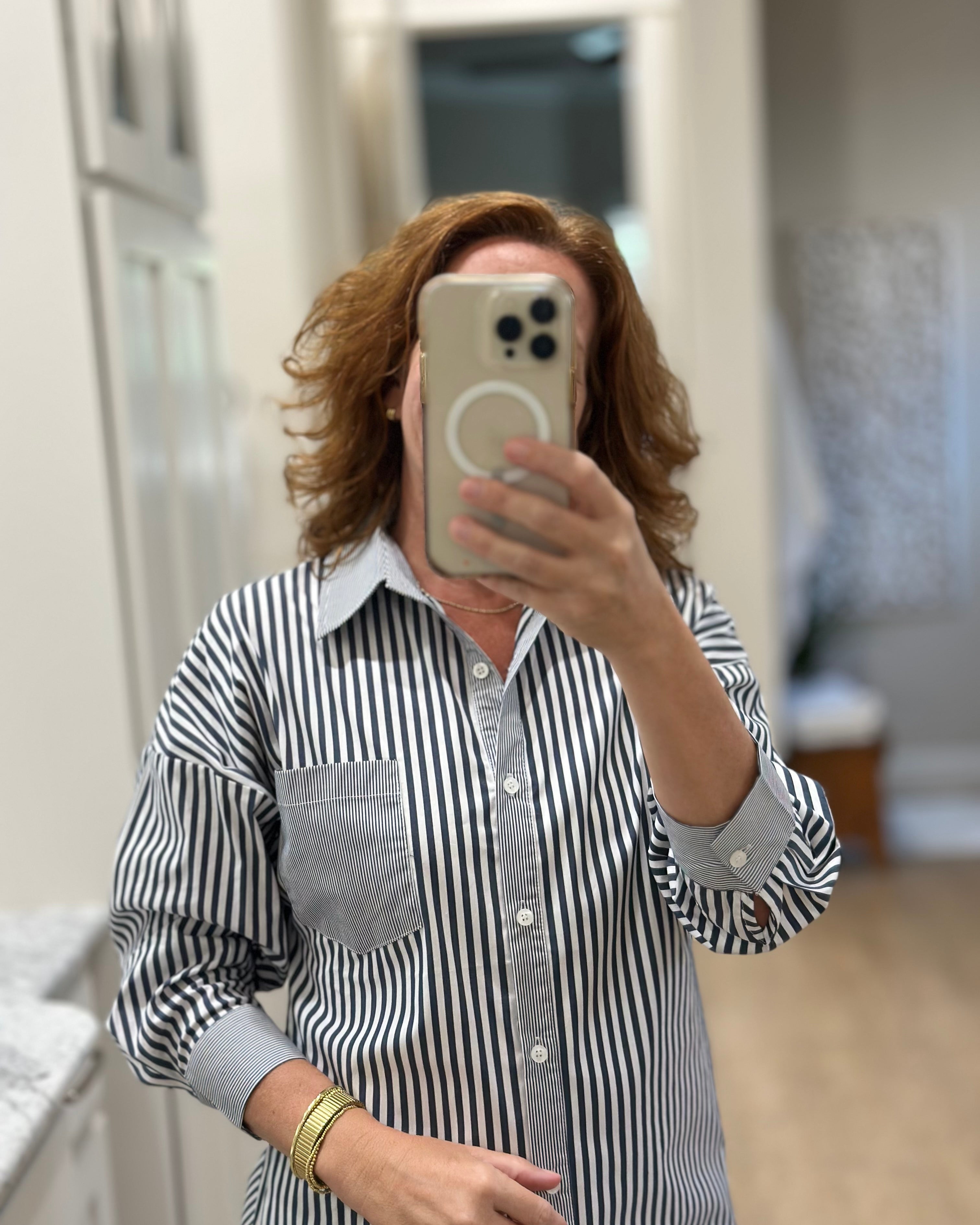 I loved shopping with CAS; the blouse can be worn with a suit or jeans. The ruffle adds a feminine touch while maintaining a professional stripe, which I love!