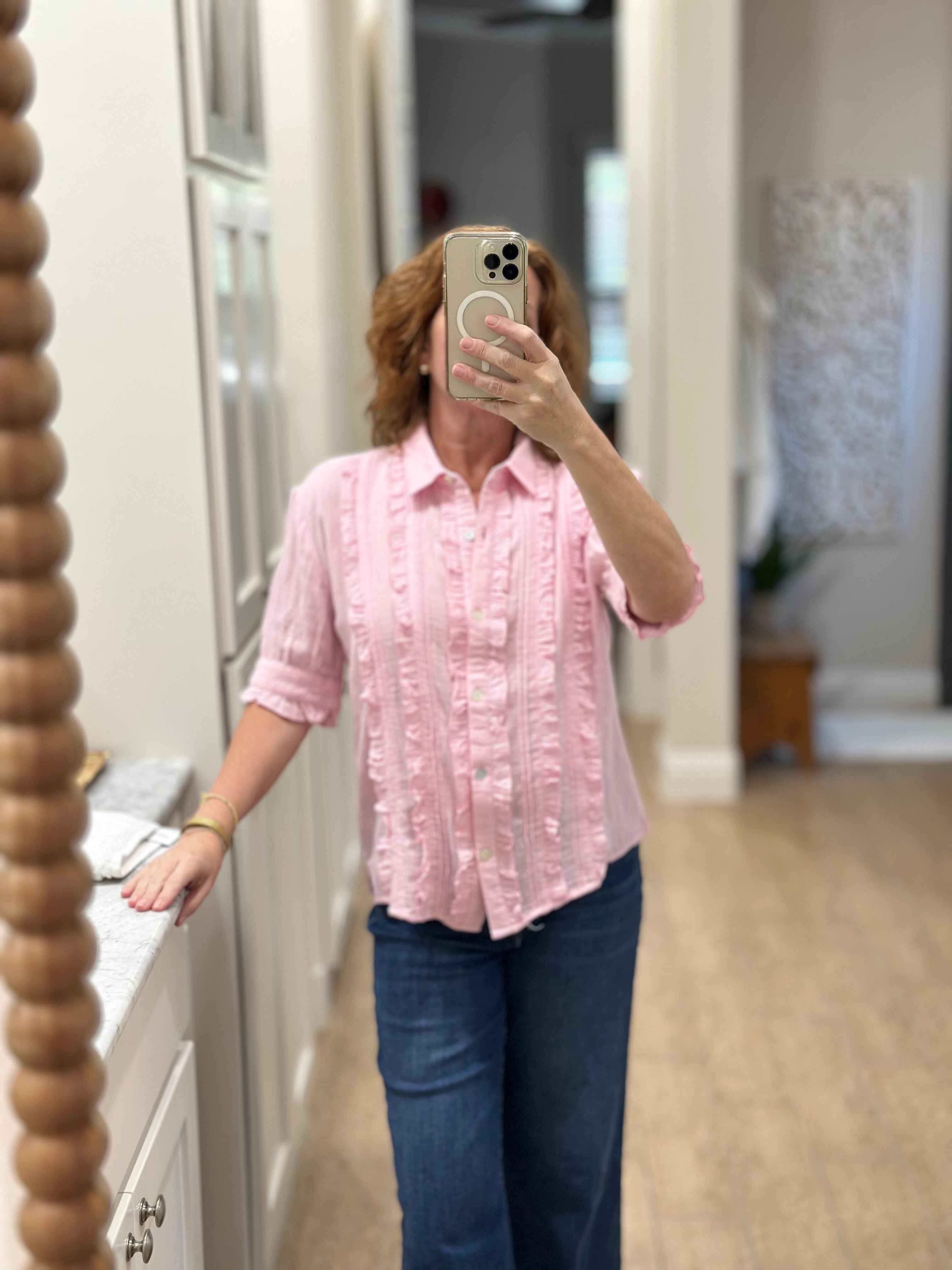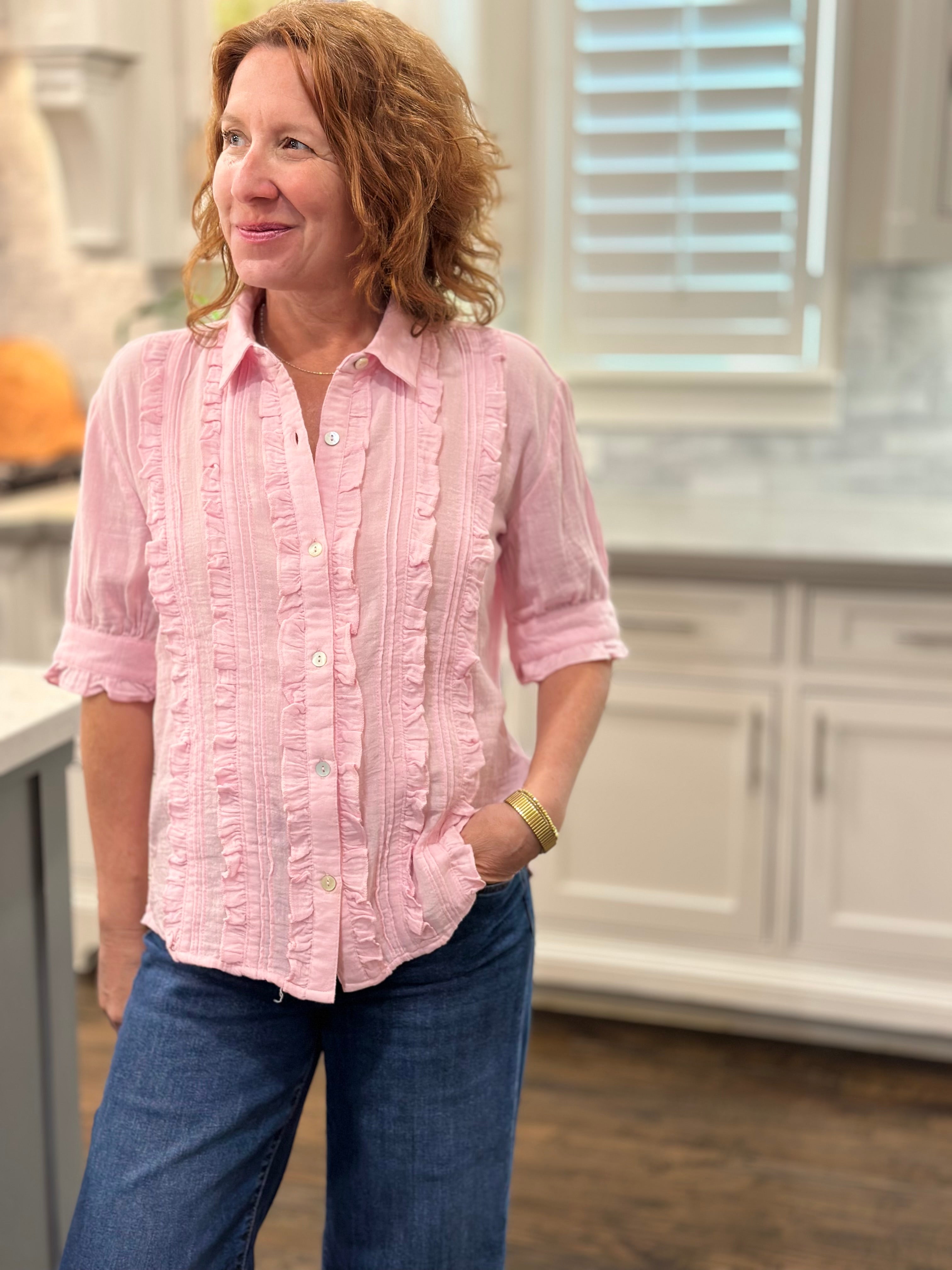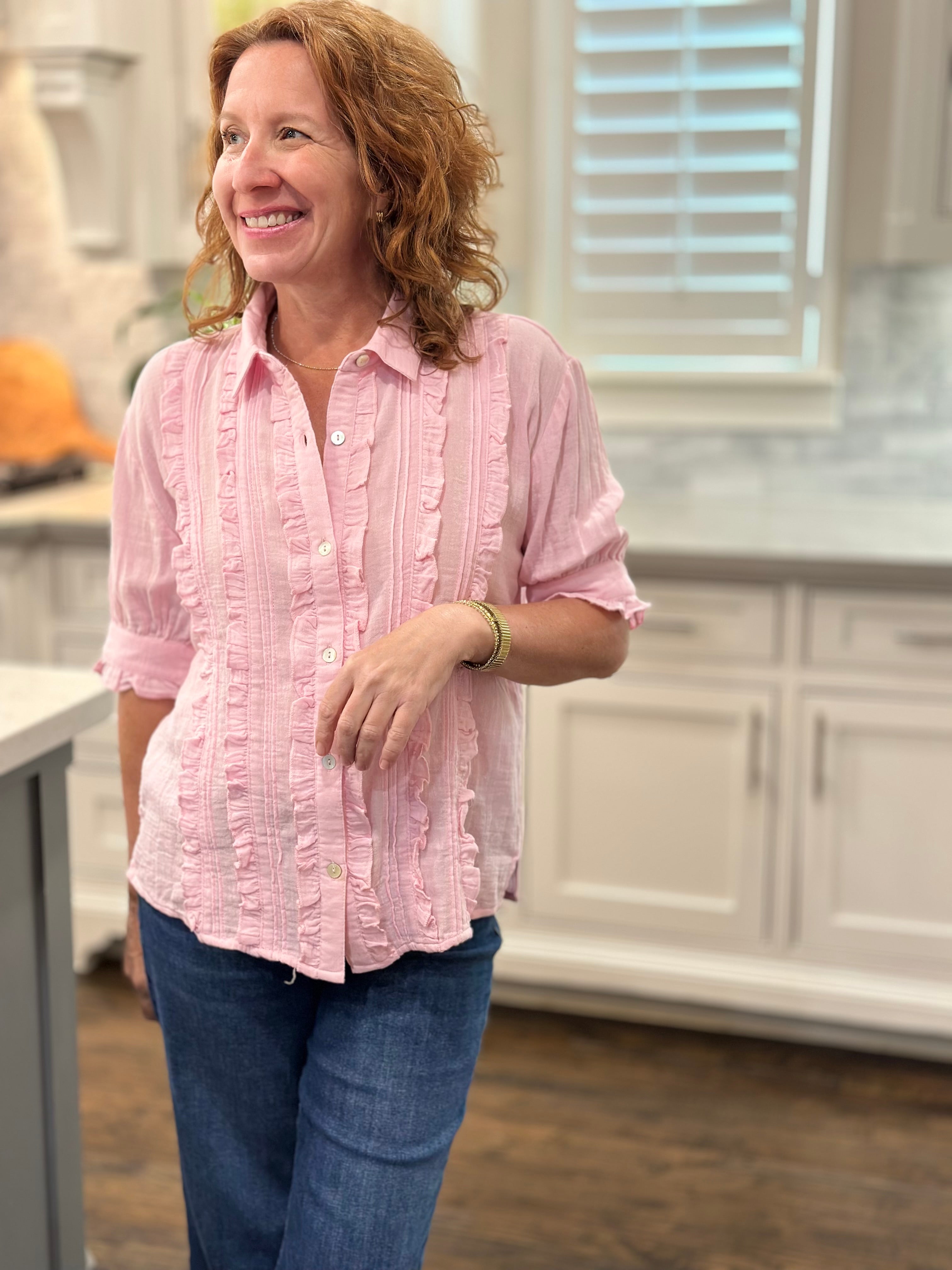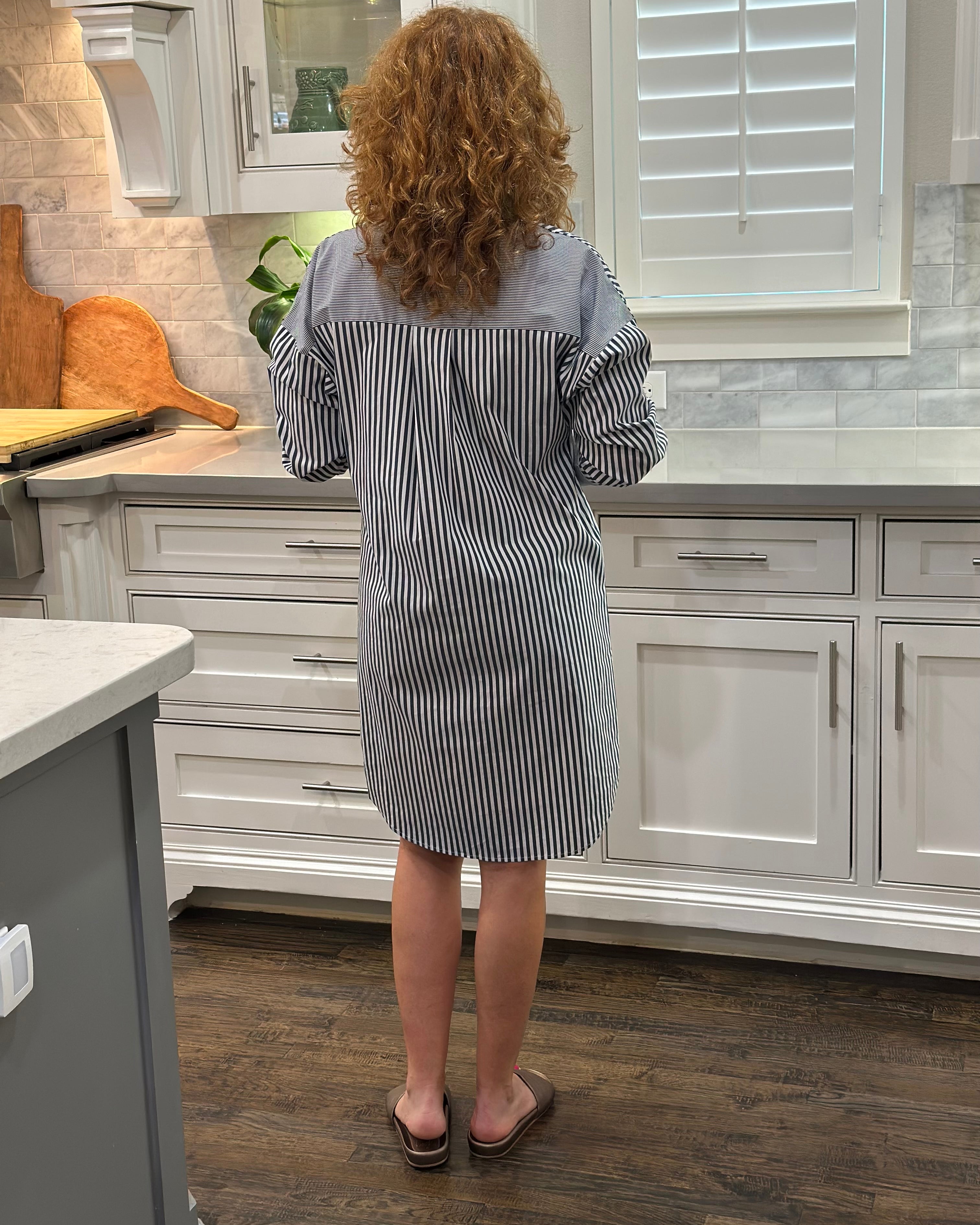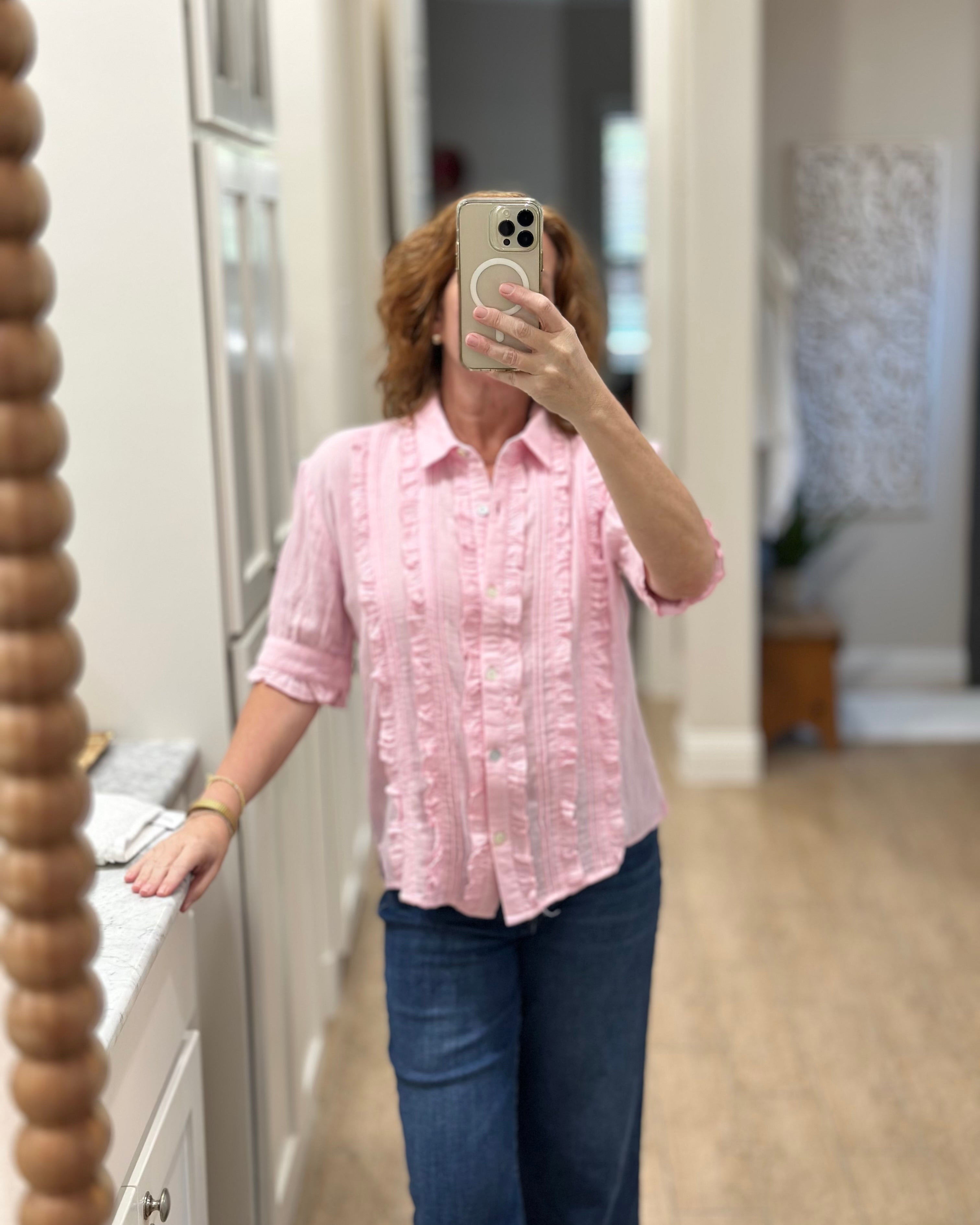 I loved shopping with CAS; the blouse can be worn with a suit or jeans. The ruffle adds a feminine touch while maintaining a professional stripe, which I love!