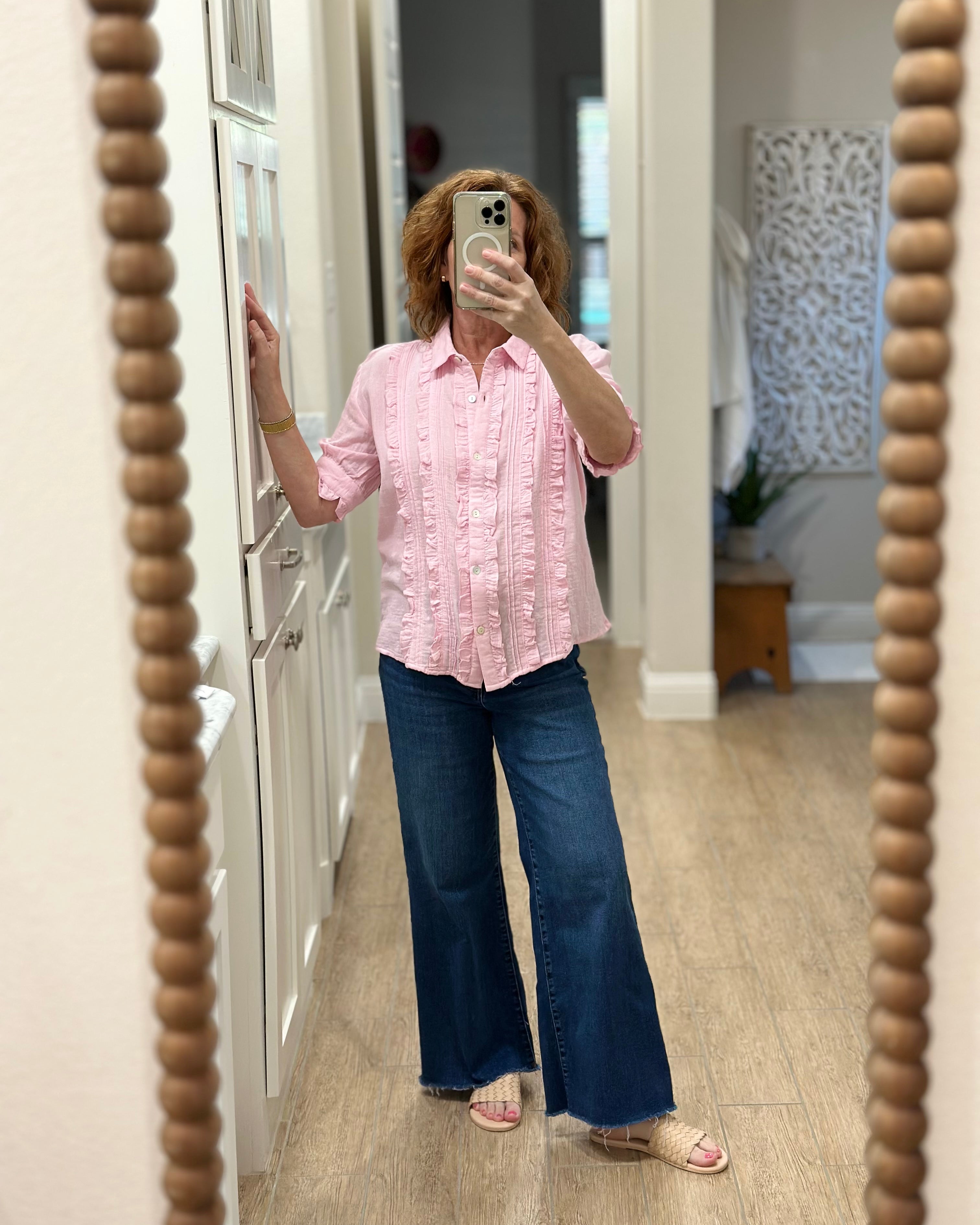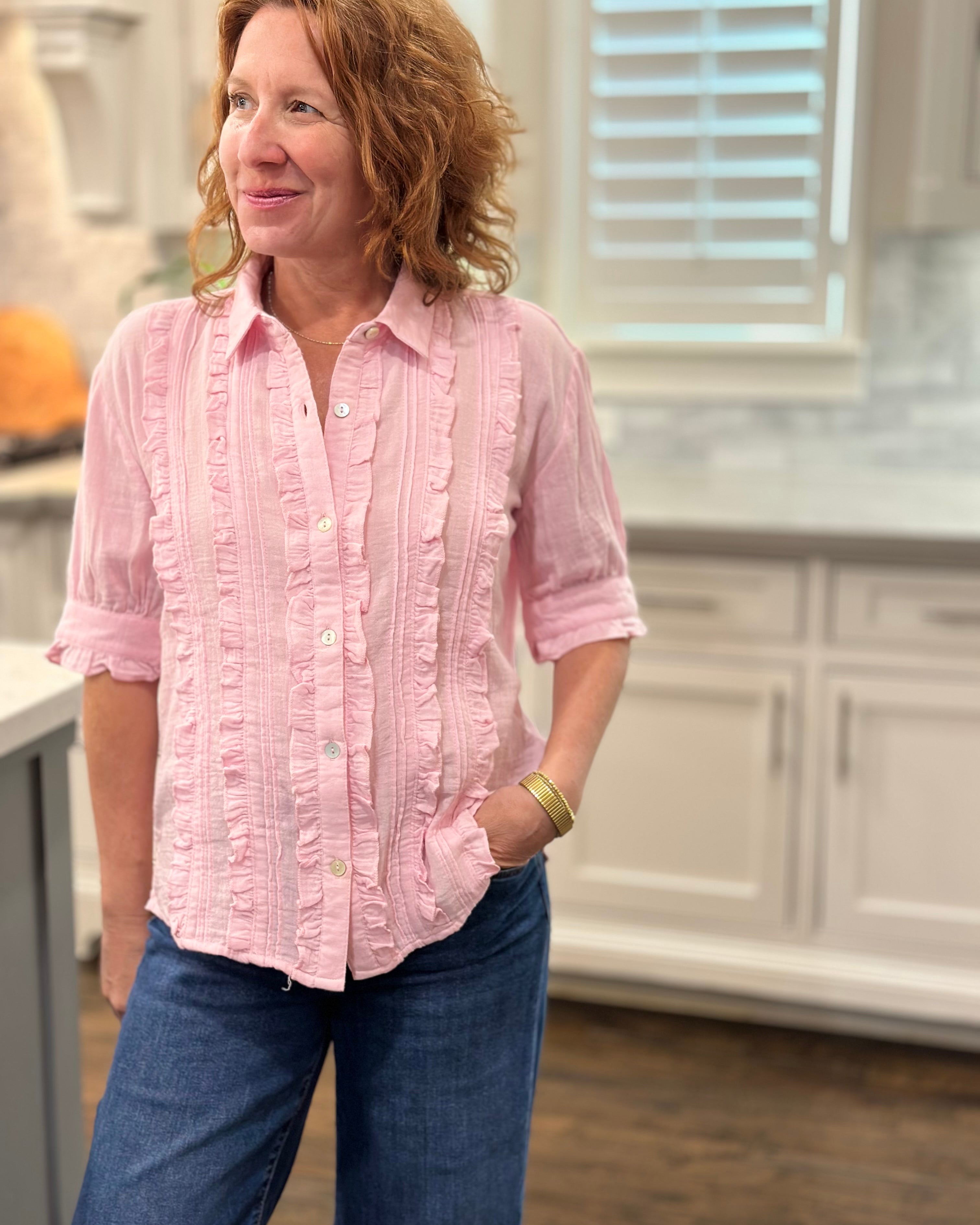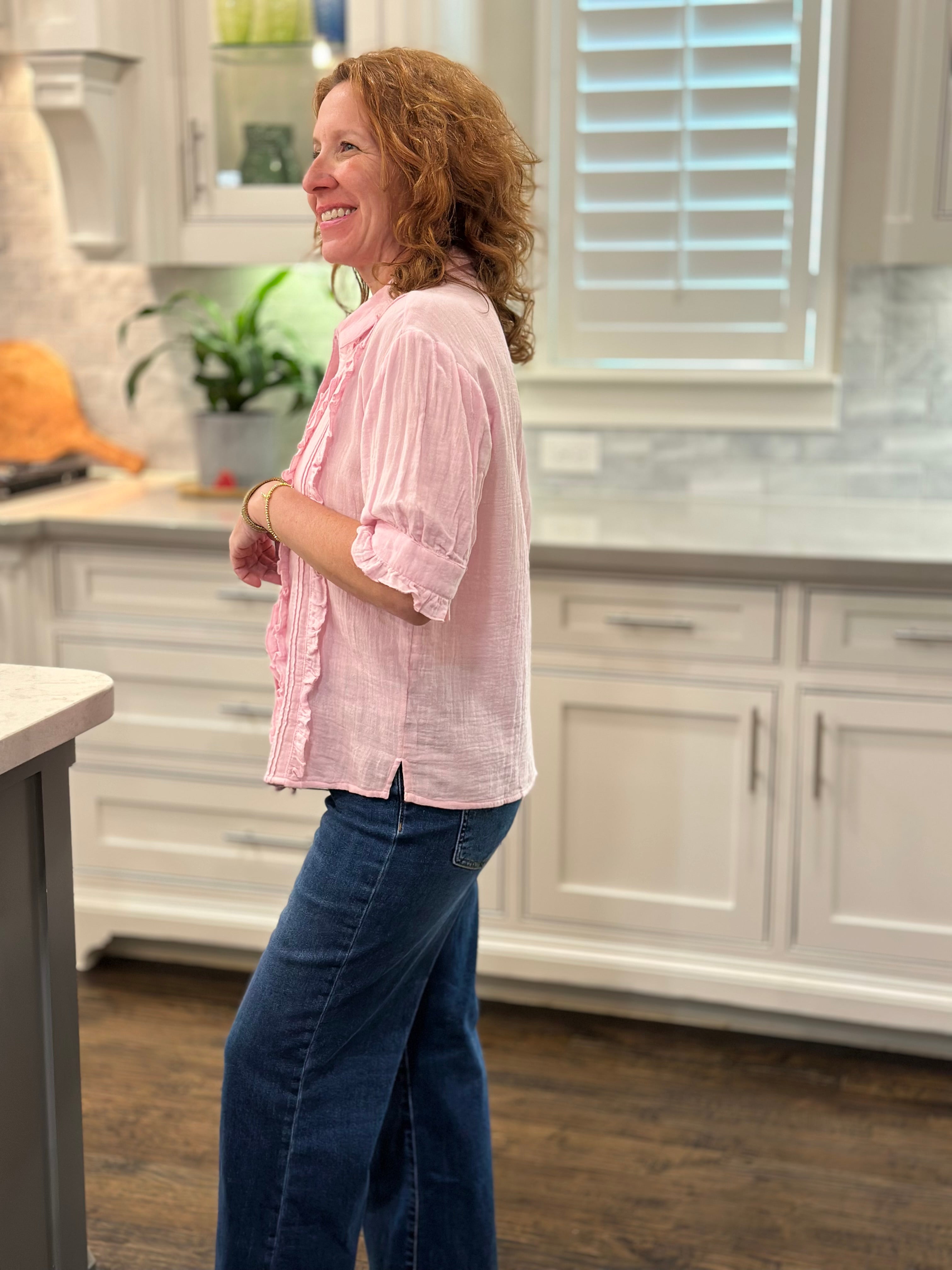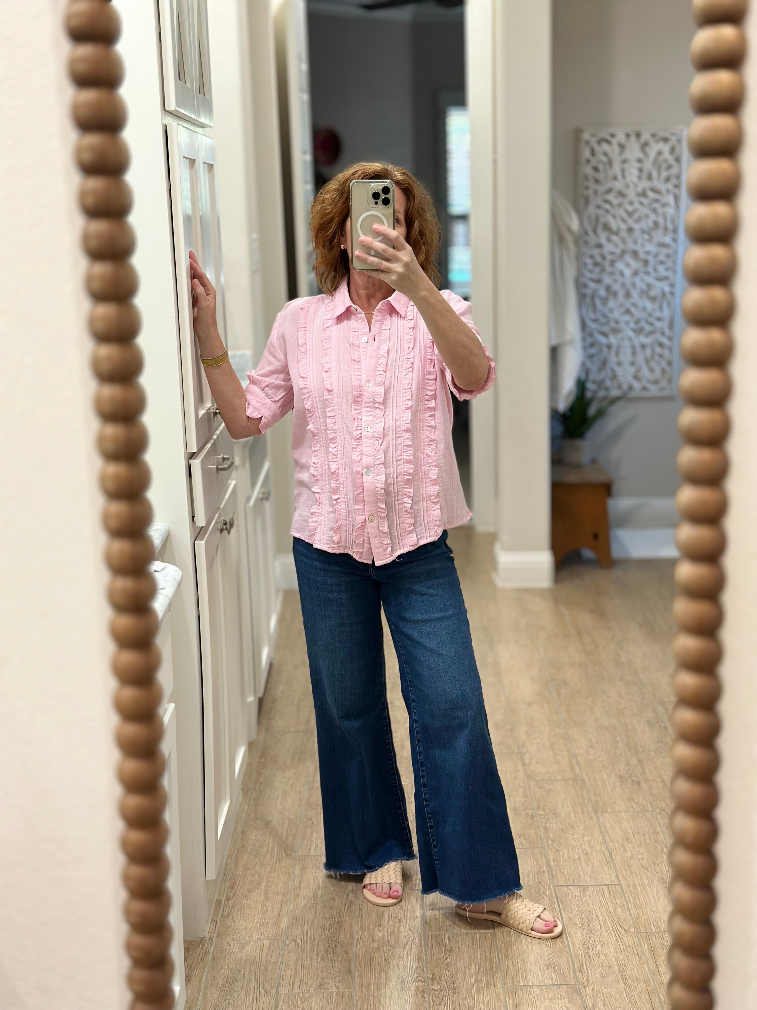 I loved shopping with CAS; the blouse can be worn with a suit or jeans. The ruffle adds a feminine touch while maintaining a professional stripe, which I love!