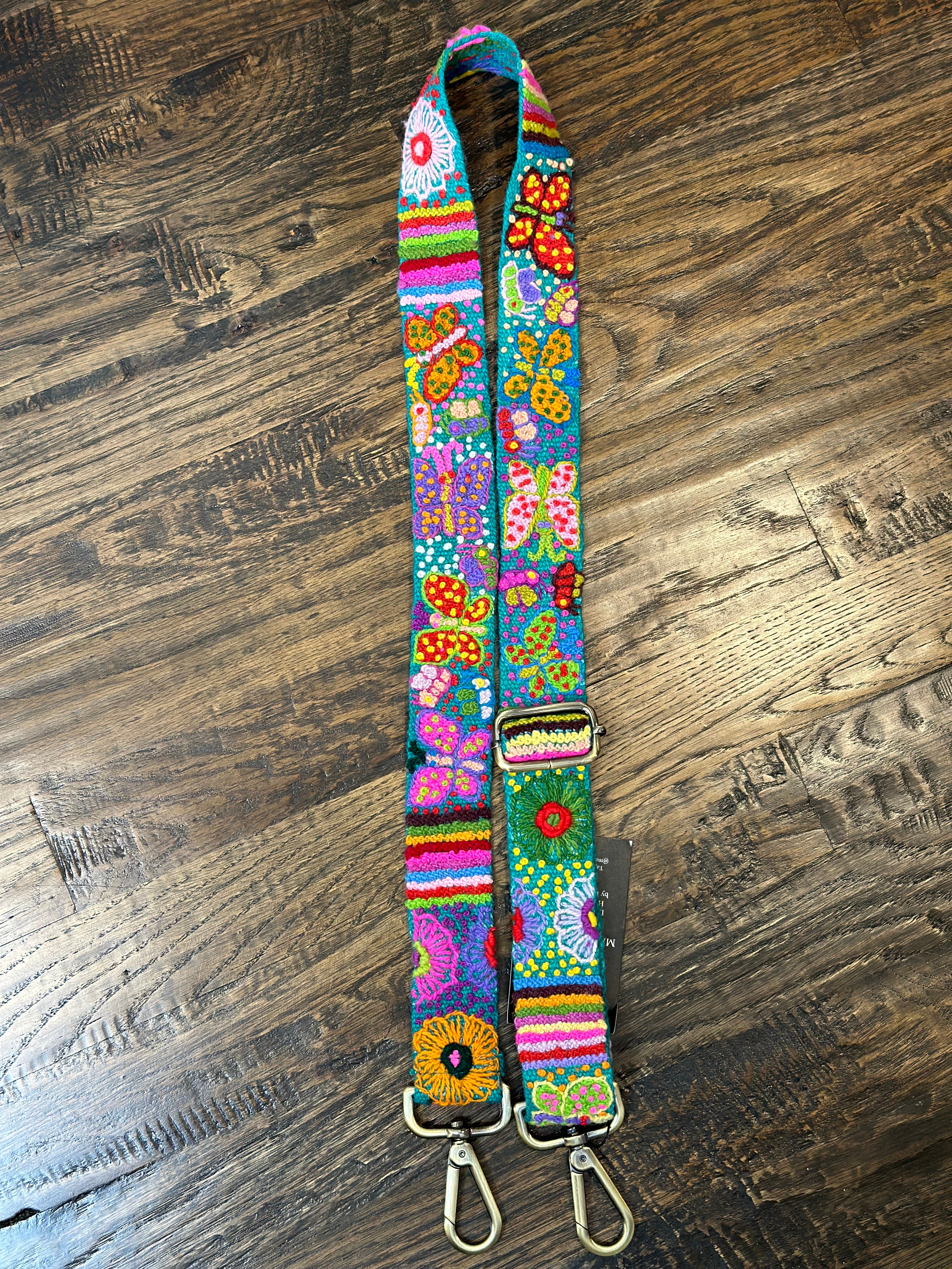 Fun purse strap with a light teal background and playful hand embroidered butterflies and flowers.  Hand embroidered by Fair Trade artisans in the Andes mountains in Peru.