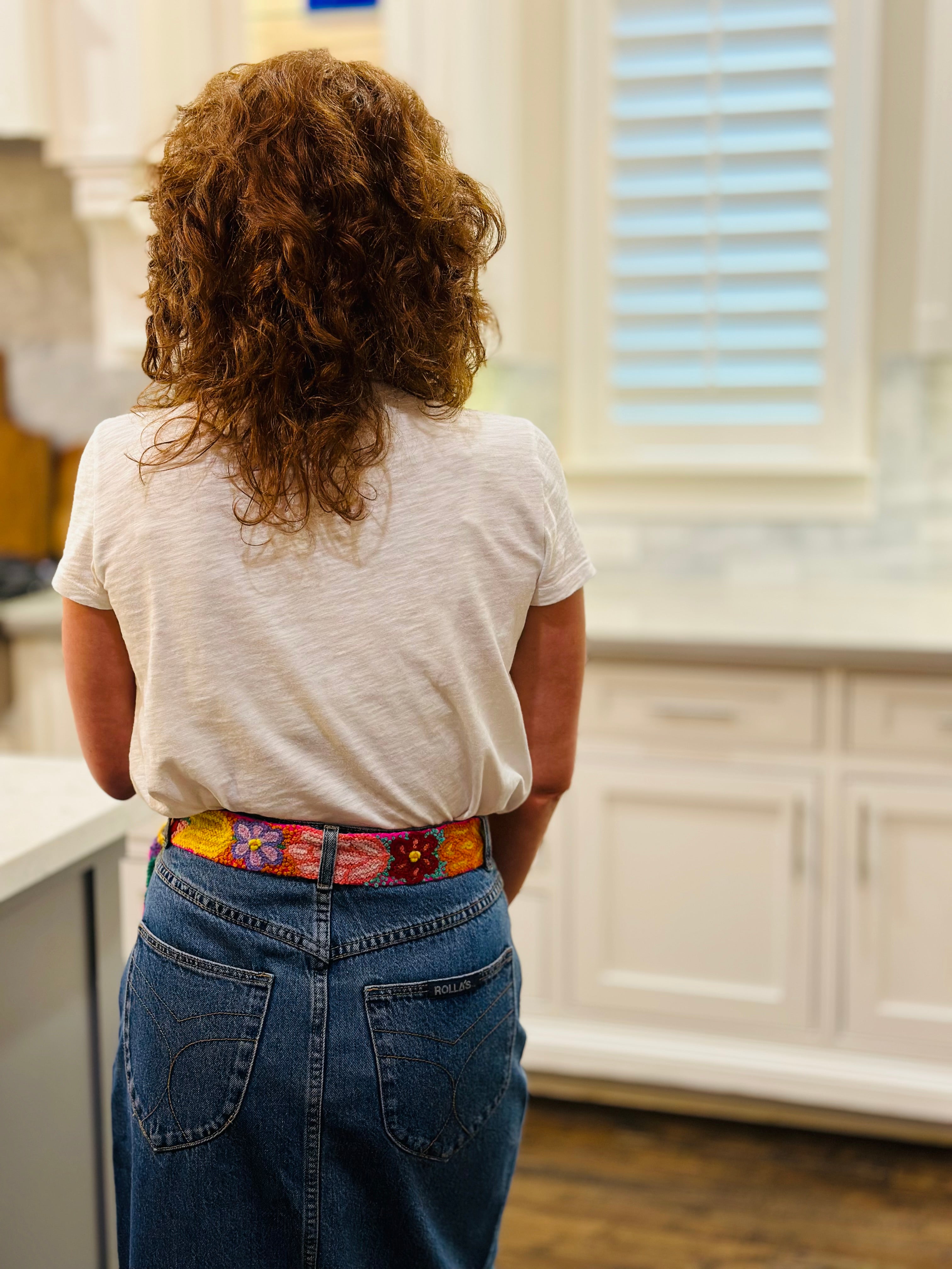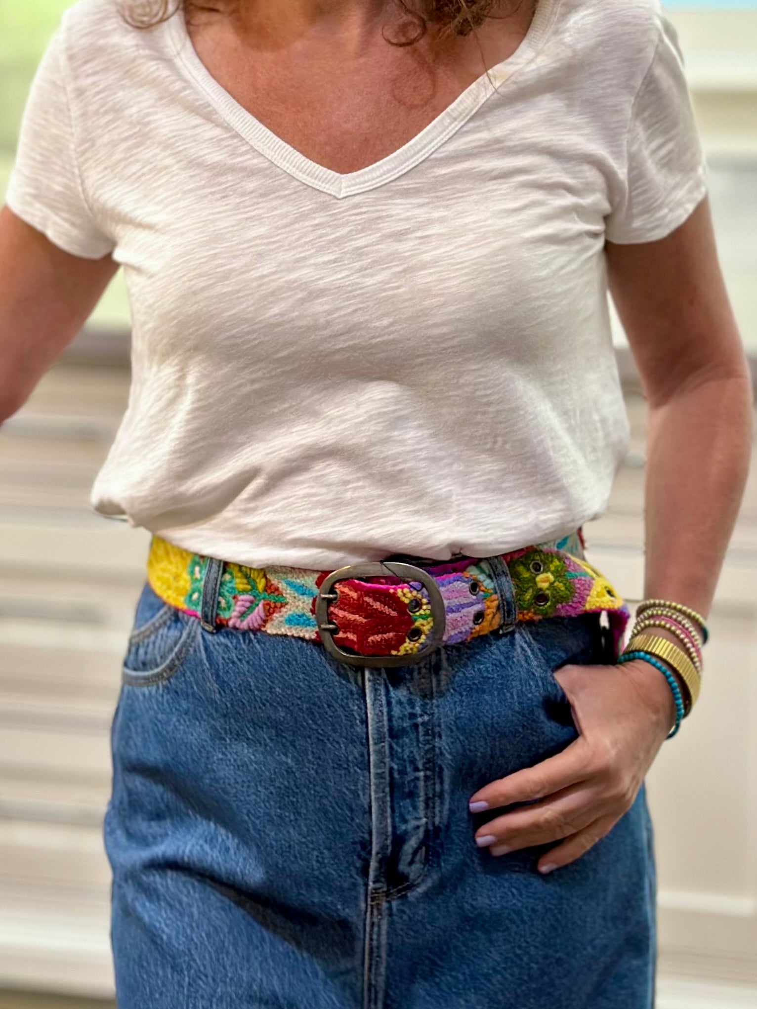 Hot pink wool fabric with colorful floral and leaves embroidery. Perfect belt for brighten up jeans and a tee! Hand embroidered by Fair Trade artisans in the Andes mountains of Peru.