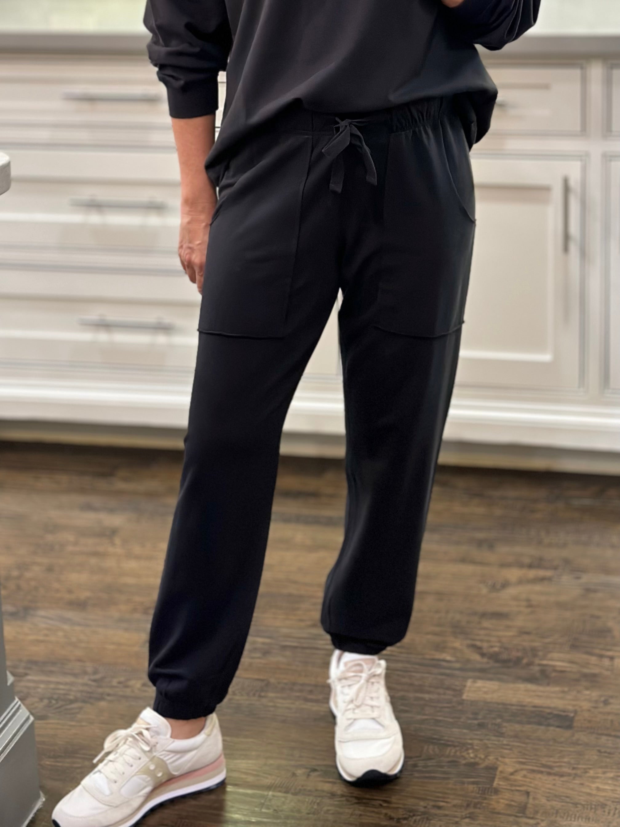 Super soft cropped jogger with tie drawstring.  Roomy fit yet flattering.  Mid rise stretch tie waist.  The ultimate travel outfit.