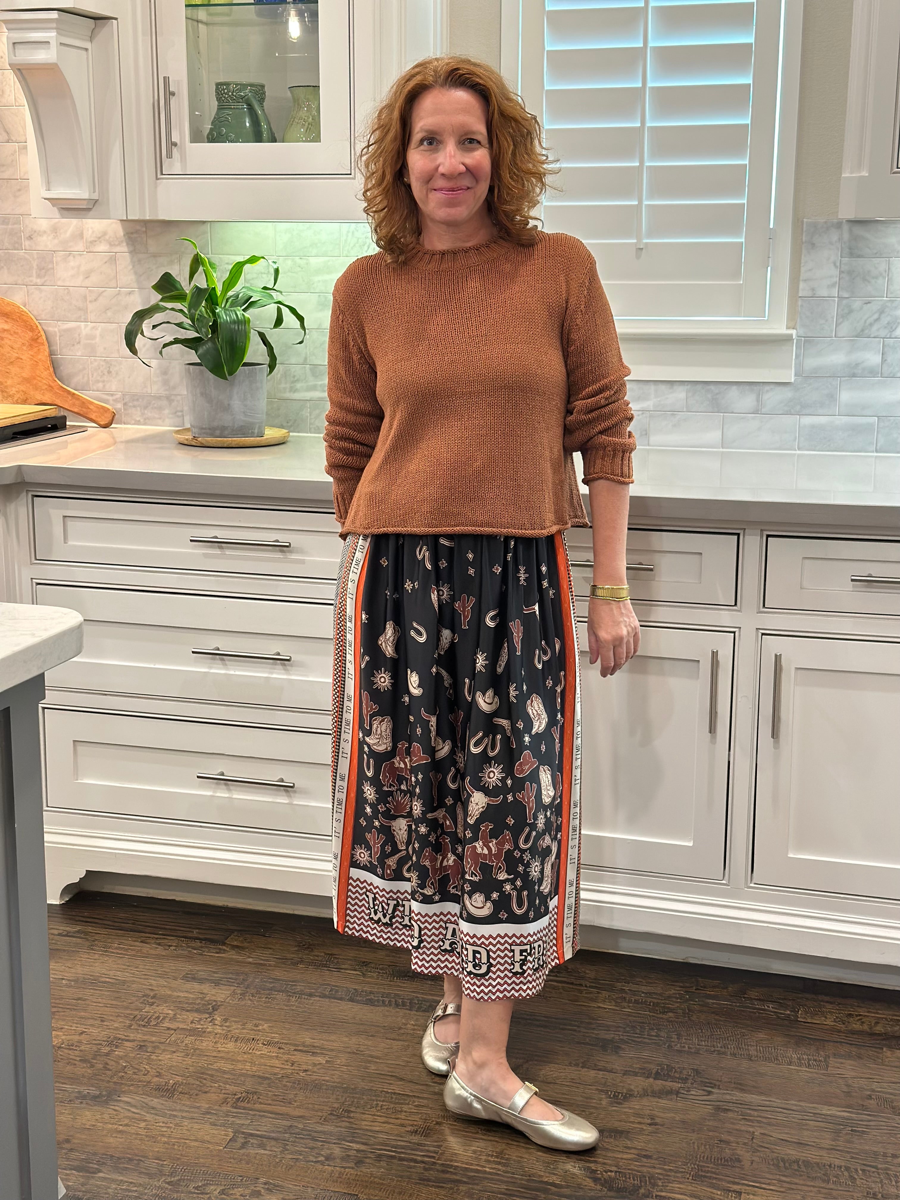 A classic skirt with a vintage chic print.  Dress it up with heals or wear casual with sneakers or sandals.