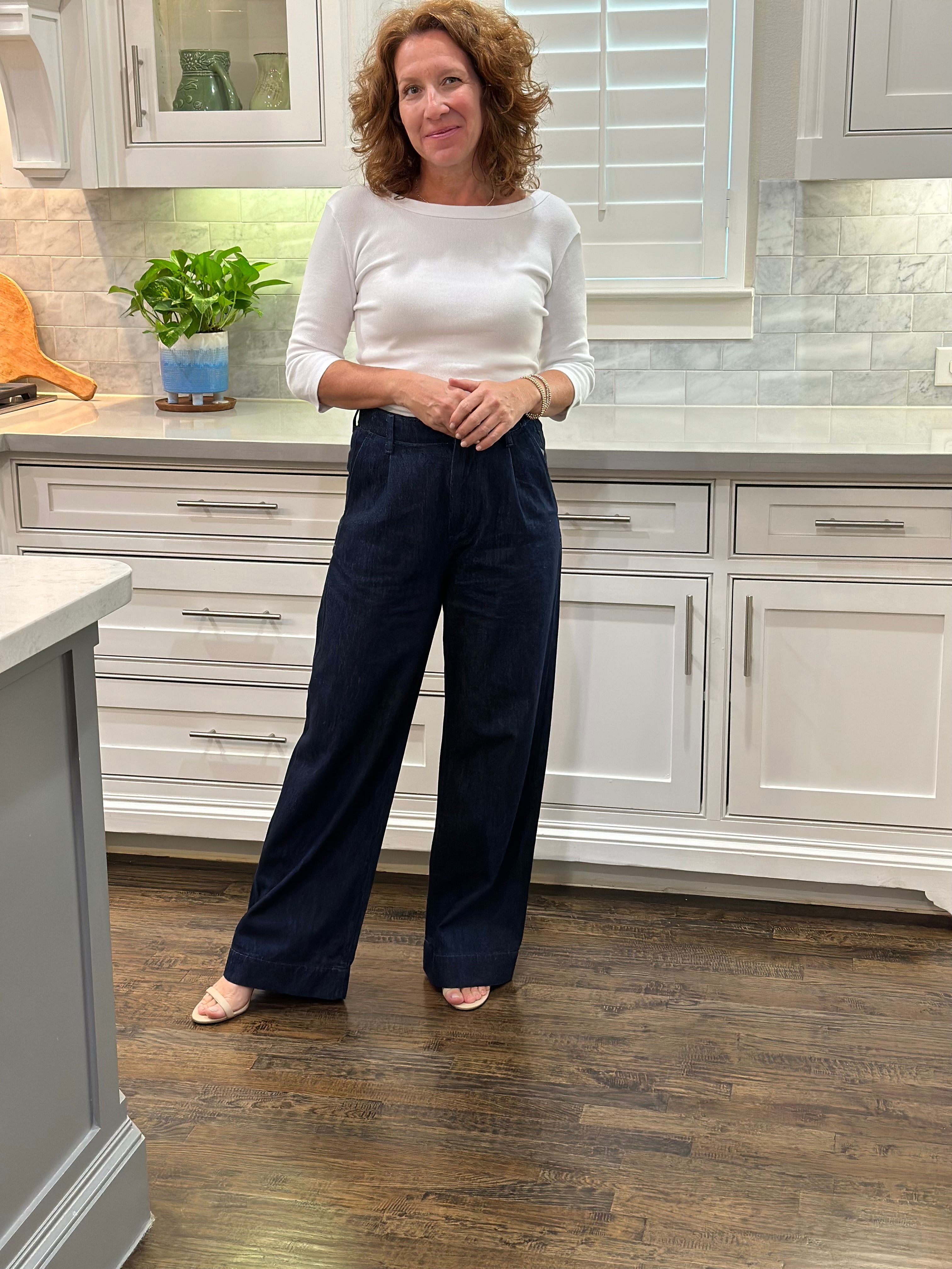 This wide leg pair features a dark denim wash with trendy front pleats and a wide leg, offering a casually elegant silhouette with soft volume. A 100% cotton fabrication and an elastic cinched waist makes these pants effortlessly comfortable.