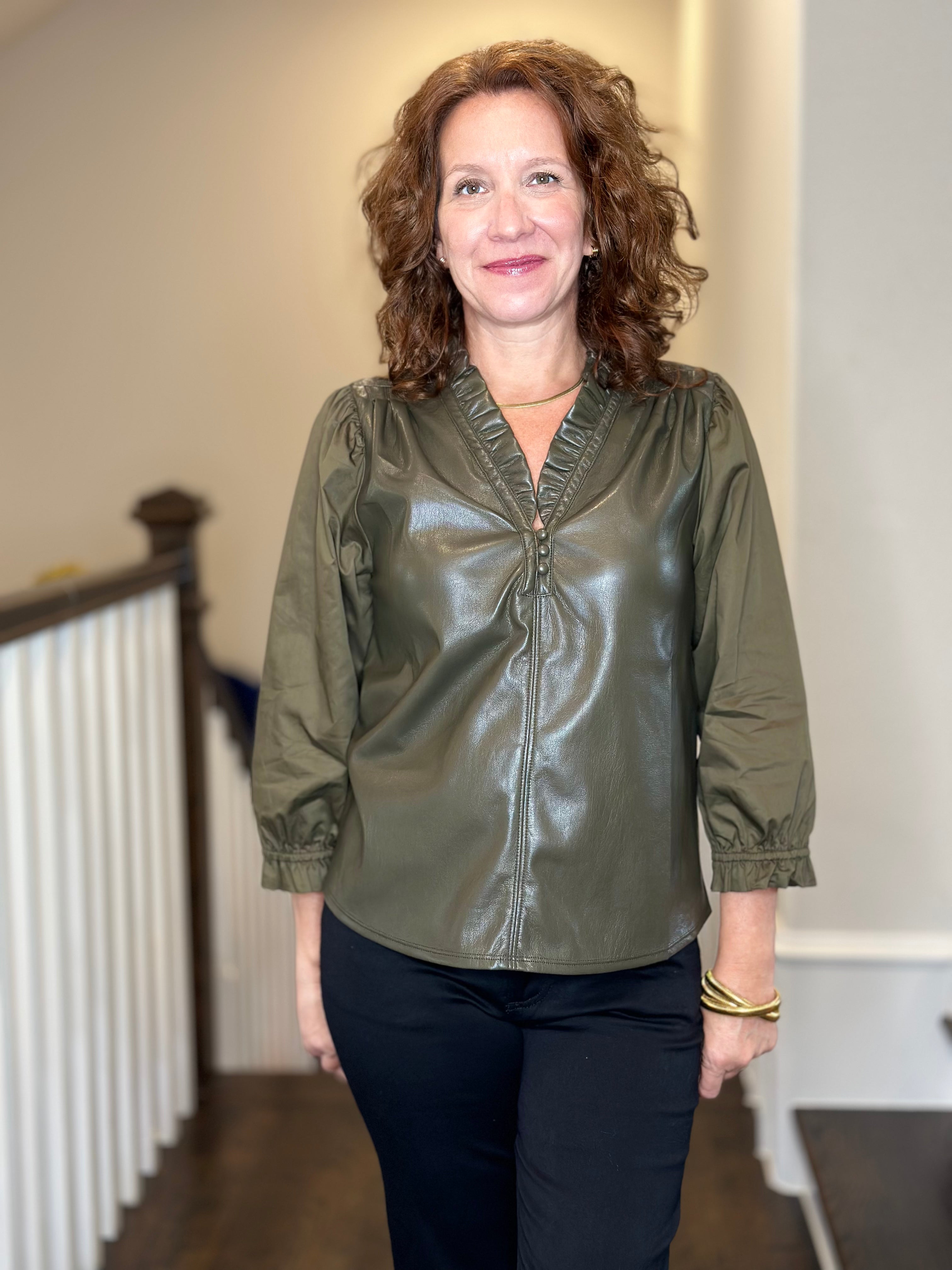 An elevated 3/4 sleeve v neck with ruffle detailing around the neck.  Cotton poplin on the sleeve with buttery soft faux leather body.
