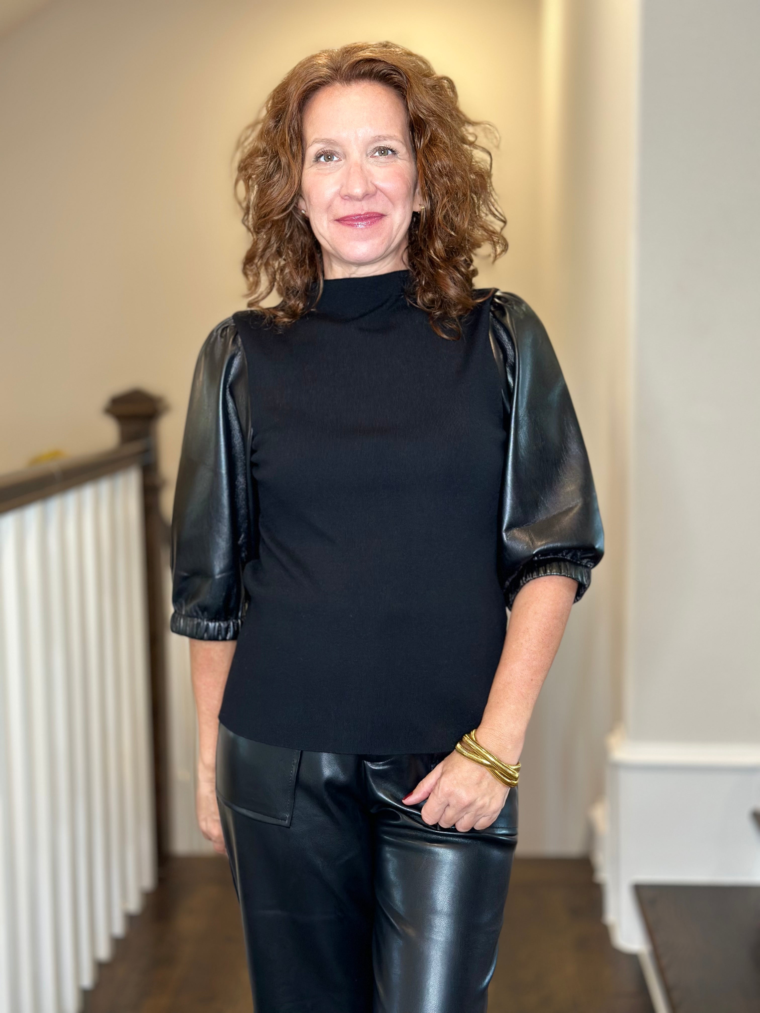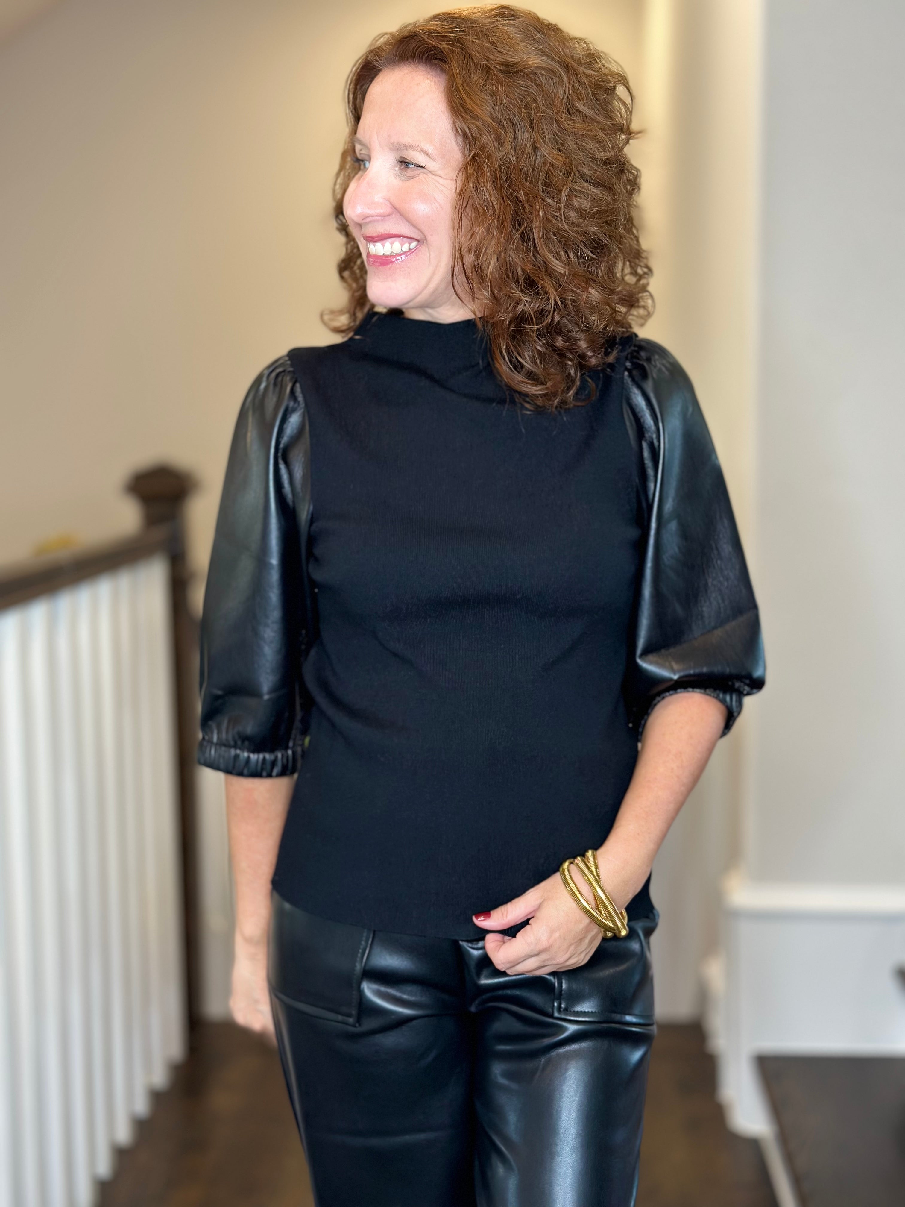 An elevated short sleeve mock turtleneck. Cotton rib on the body with faux leather puff sleeves.