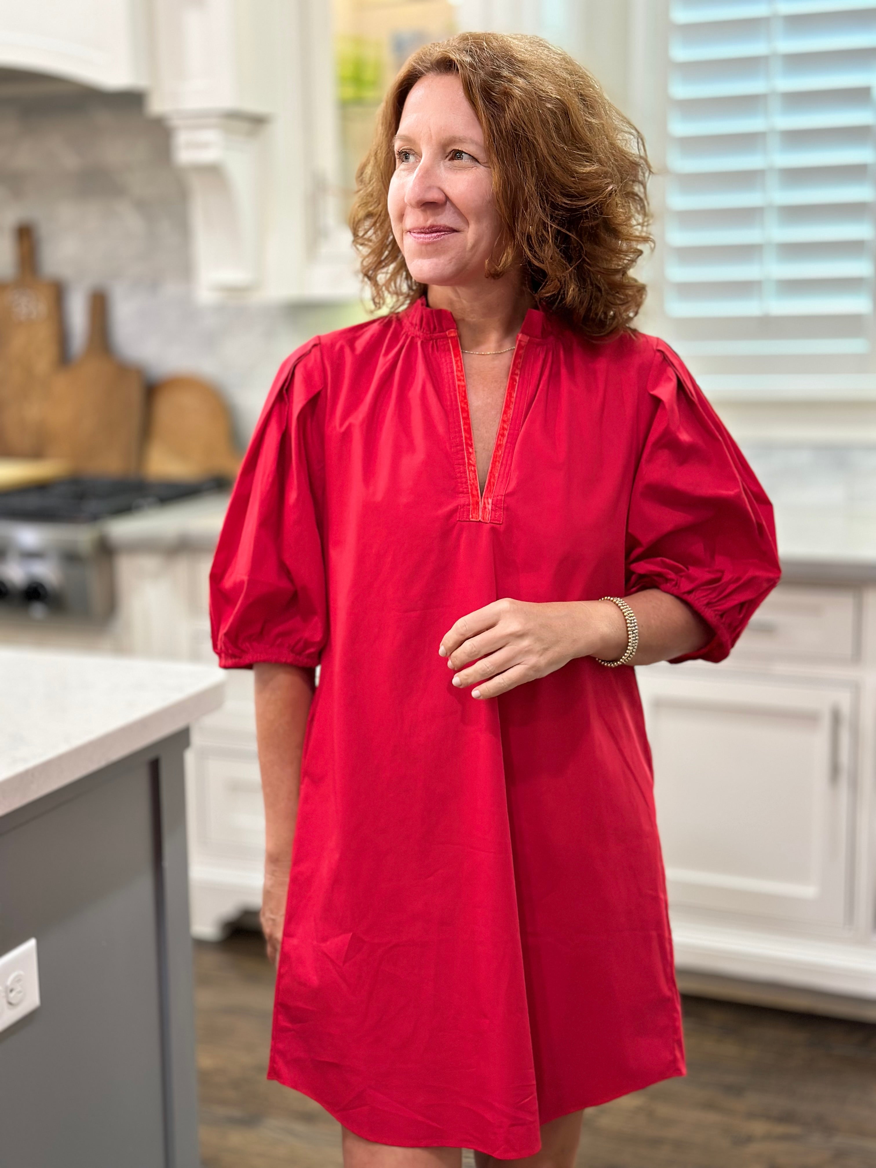 Meet the Erin Dress! With its playful velvet contrast piping v-neck and trendy puff sleeves, you'll turn heads wherever you go. The elastic detailing ensures a flattering fit, making this dress a must-have addition to your wardrobe!