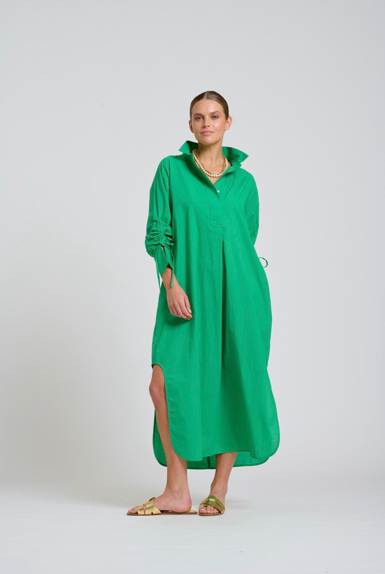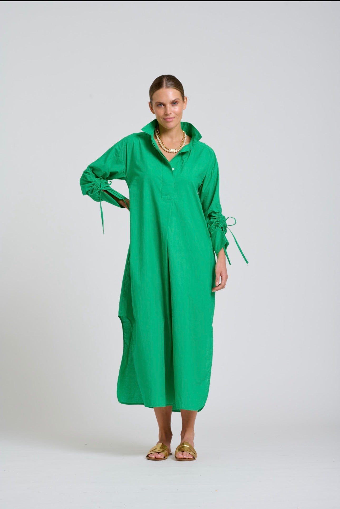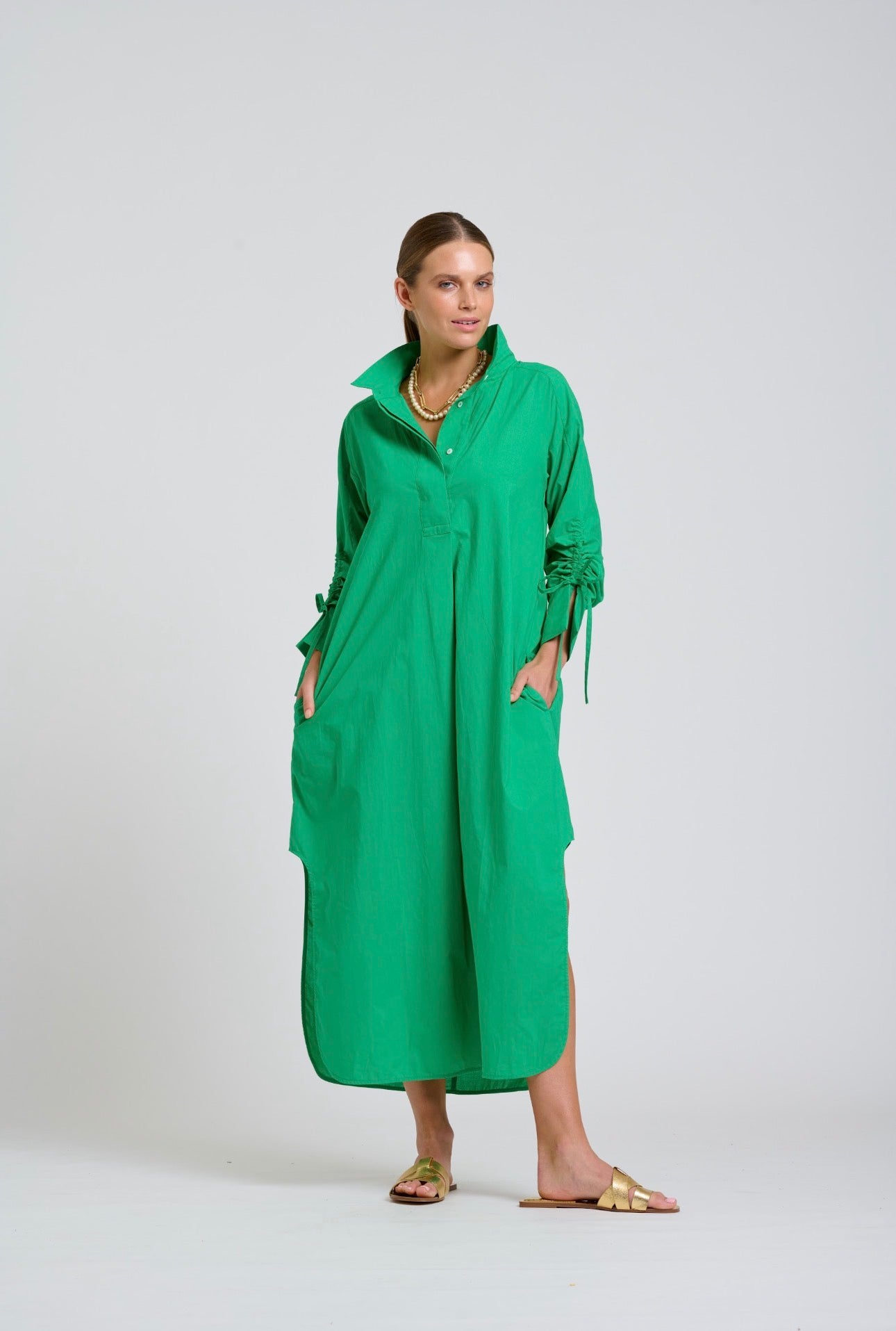The Millie dress is a stunning popover style, longline with scooped side vents, feature adjustable gathered sleeves, side pockets, crafted in cotton poplin.
