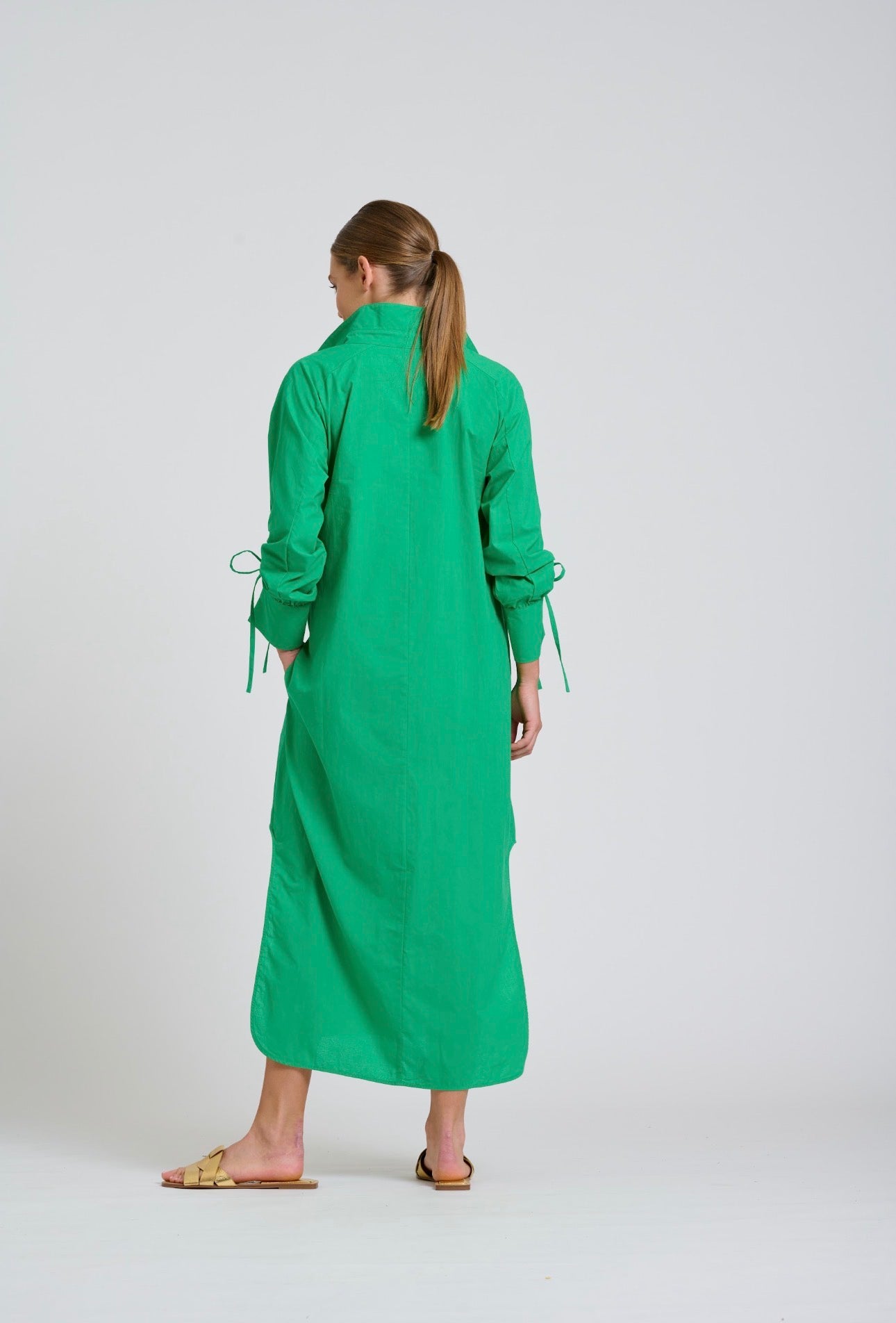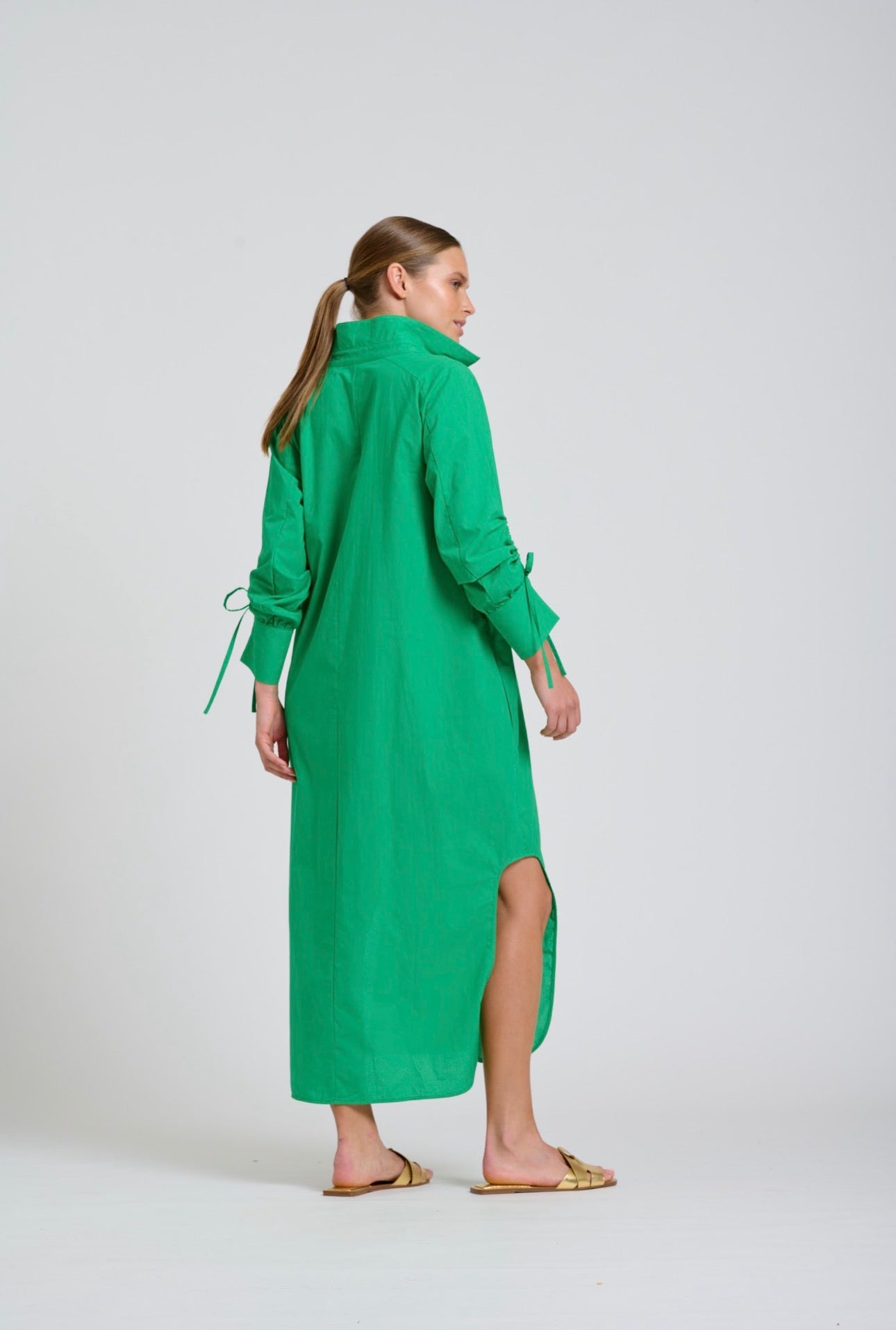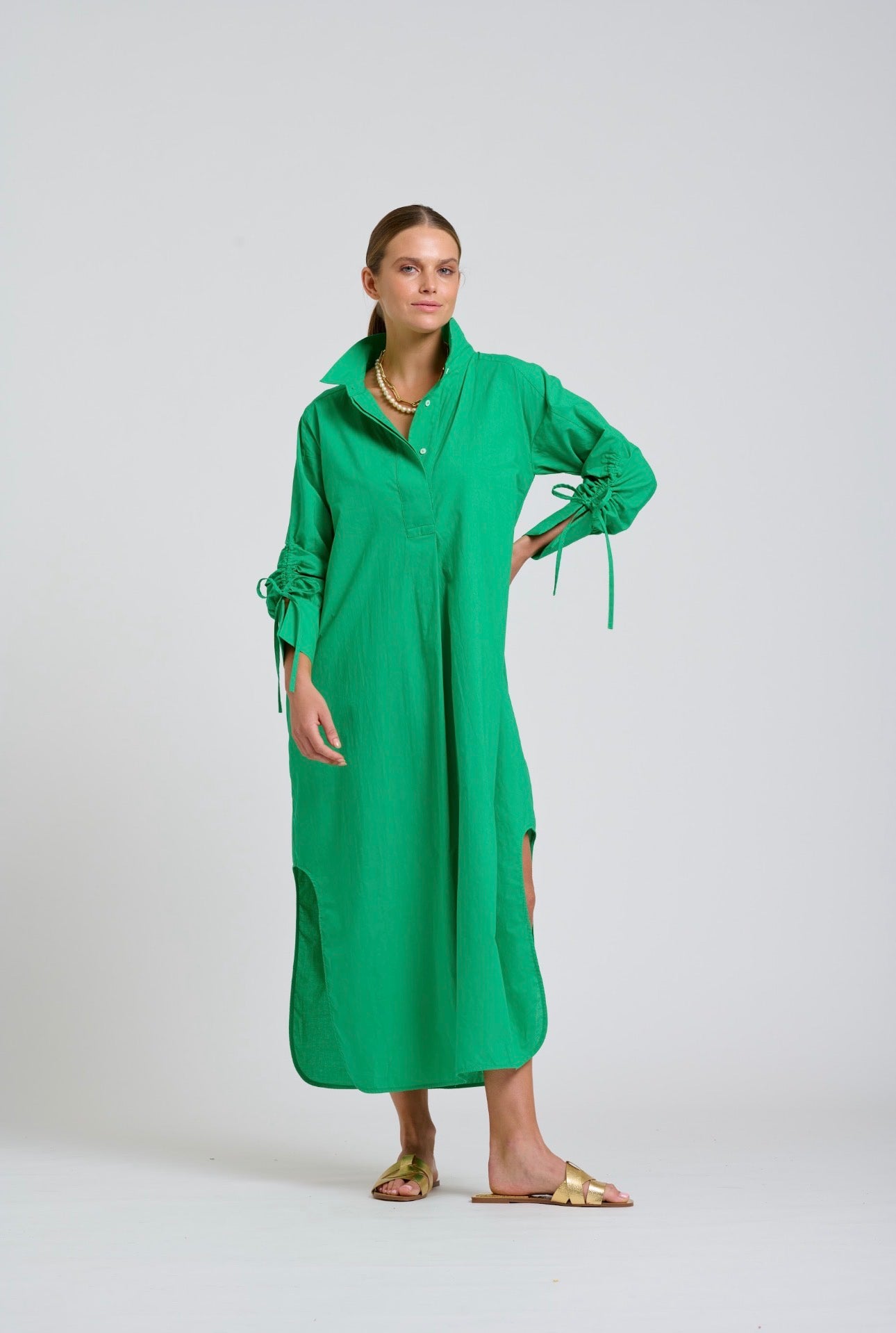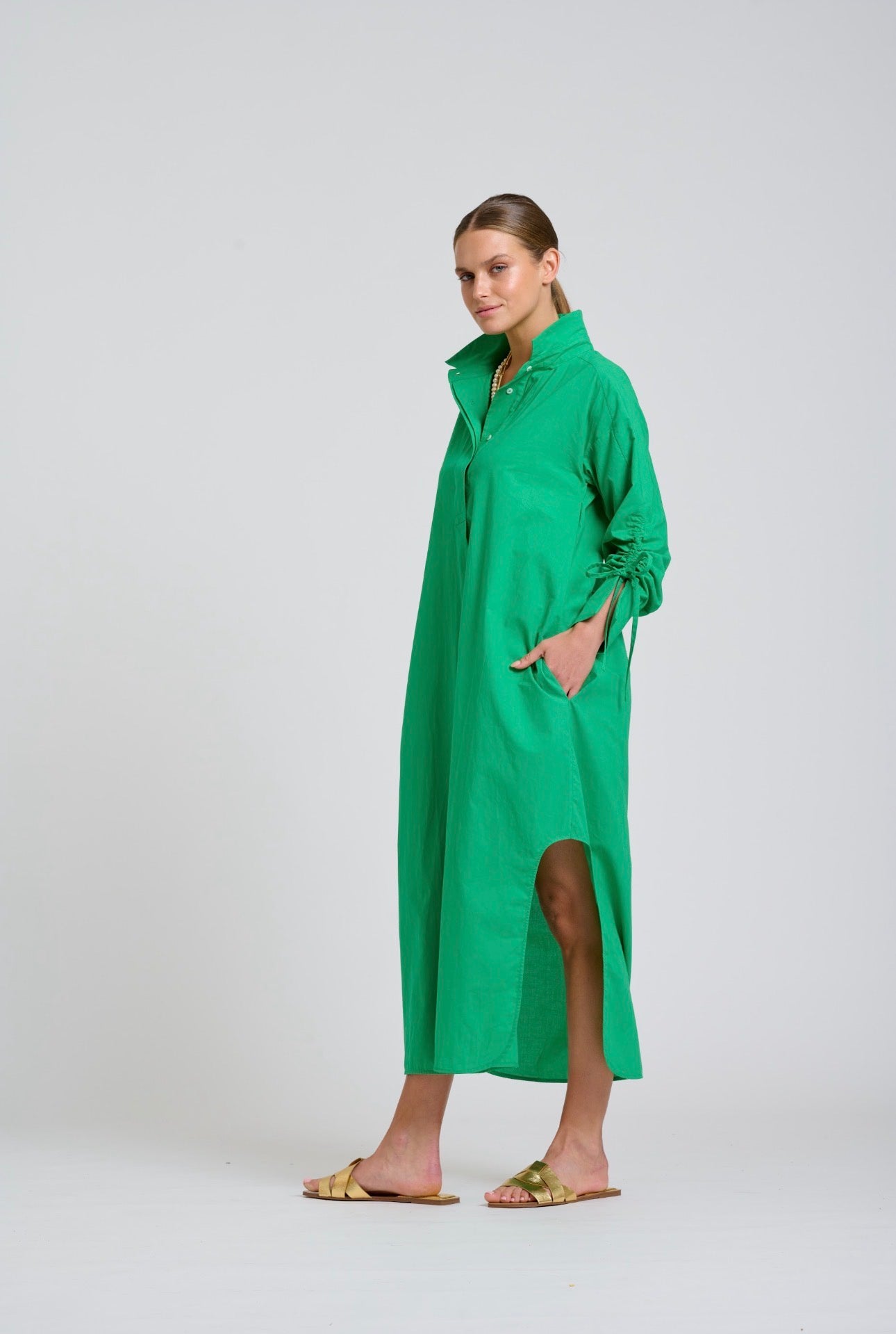 The Millie dress is a stunning popover style, longline with scooped side vents, feature adjustable gathered sleeves, side pockets, crafted in cotton poplin.