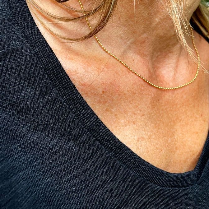 Classic, beautiful, waterproof and tangle-free. Perfect for Layering. Meet our luxurious 14k gold filled beaded bliss necklace. A continuous strand of 1.5mm dotted gold beads. Sophisticated and elegant. Available in 15.5". Laid back luxury. Waterproof! Woohoo!