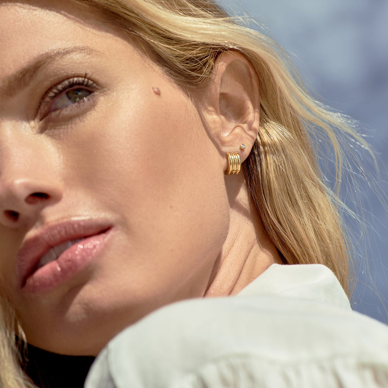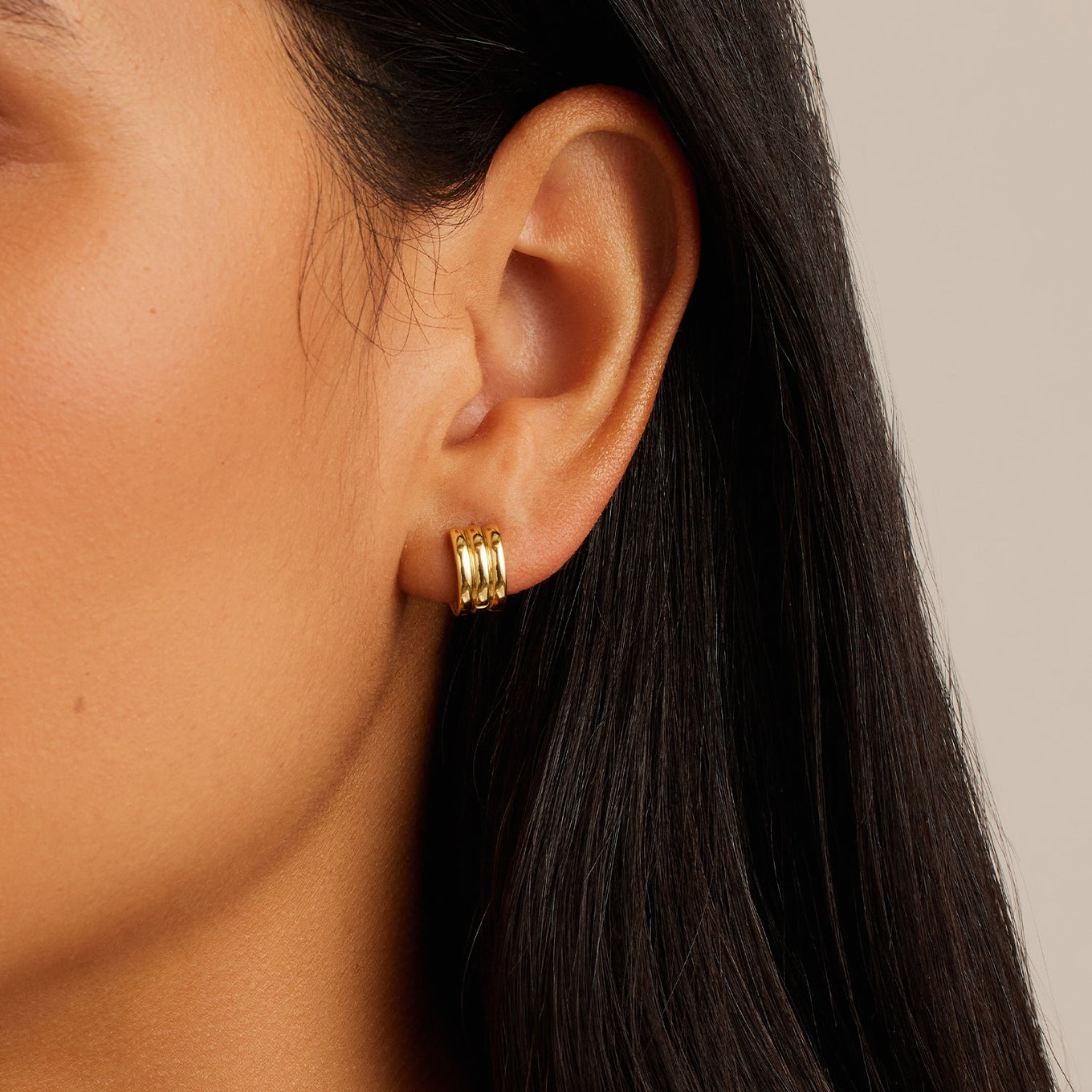 These textured gold-toned huggie hoop earrings feel more elevated than your simple everyday hoop earring. Wear in your first piercing along with matching items from the Reed Collection.