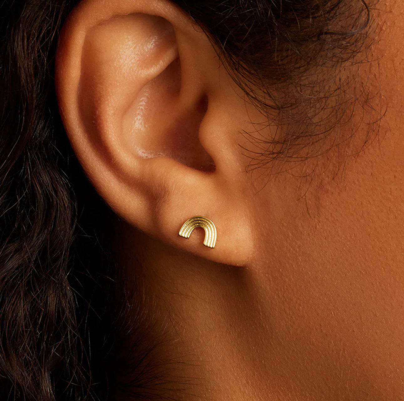 These Retro Rainbow Studs are sure to make a statement. With beautiful etched detailing, they are lightweight and perfect in first, second or third piercings. Pair with your favorite gold hoops or studs for the ultimate ear stack.