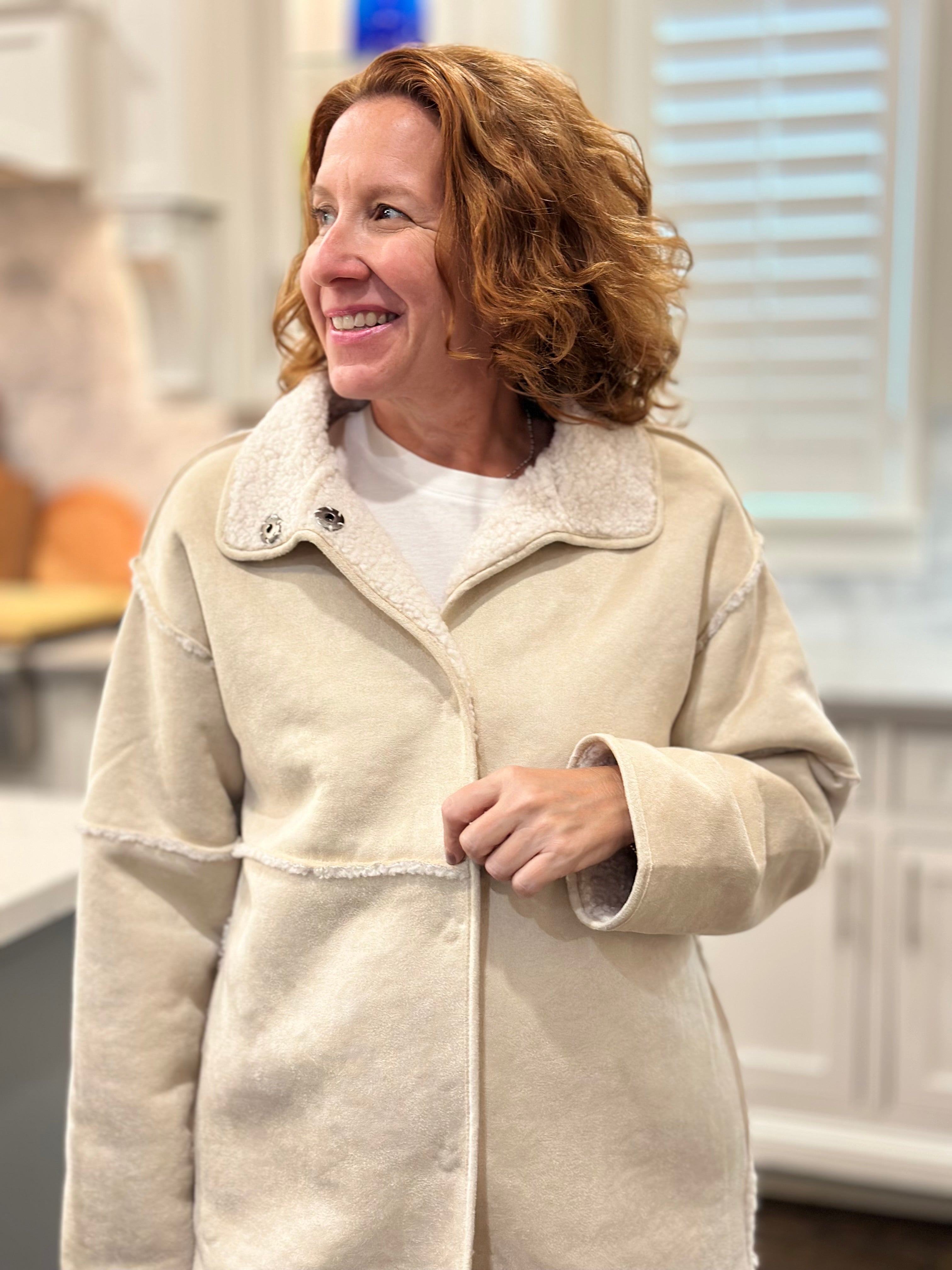 The Amber coat brings chic style with its faux suede sherpa look, featuring a cozy high collar, handy pockets, and inner buttons. Plus, it’s reversible in a versatile natural shade for double the fun!