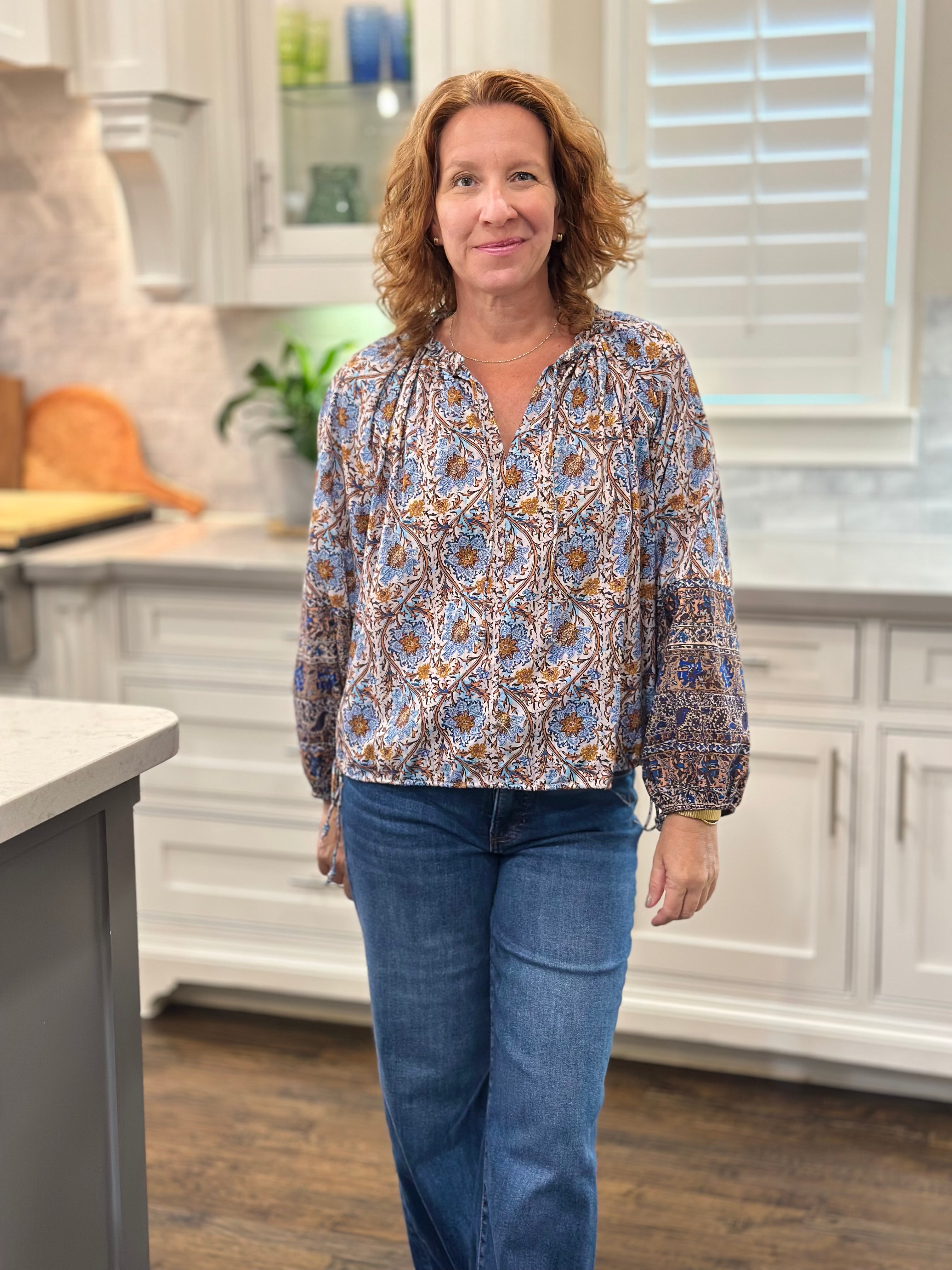 This charming peasant-style top features playful ruffle accents around the neckline. Made from soft cotton in warm hues, it offers a relaxed fit with cute tie details for a whimsical touch.