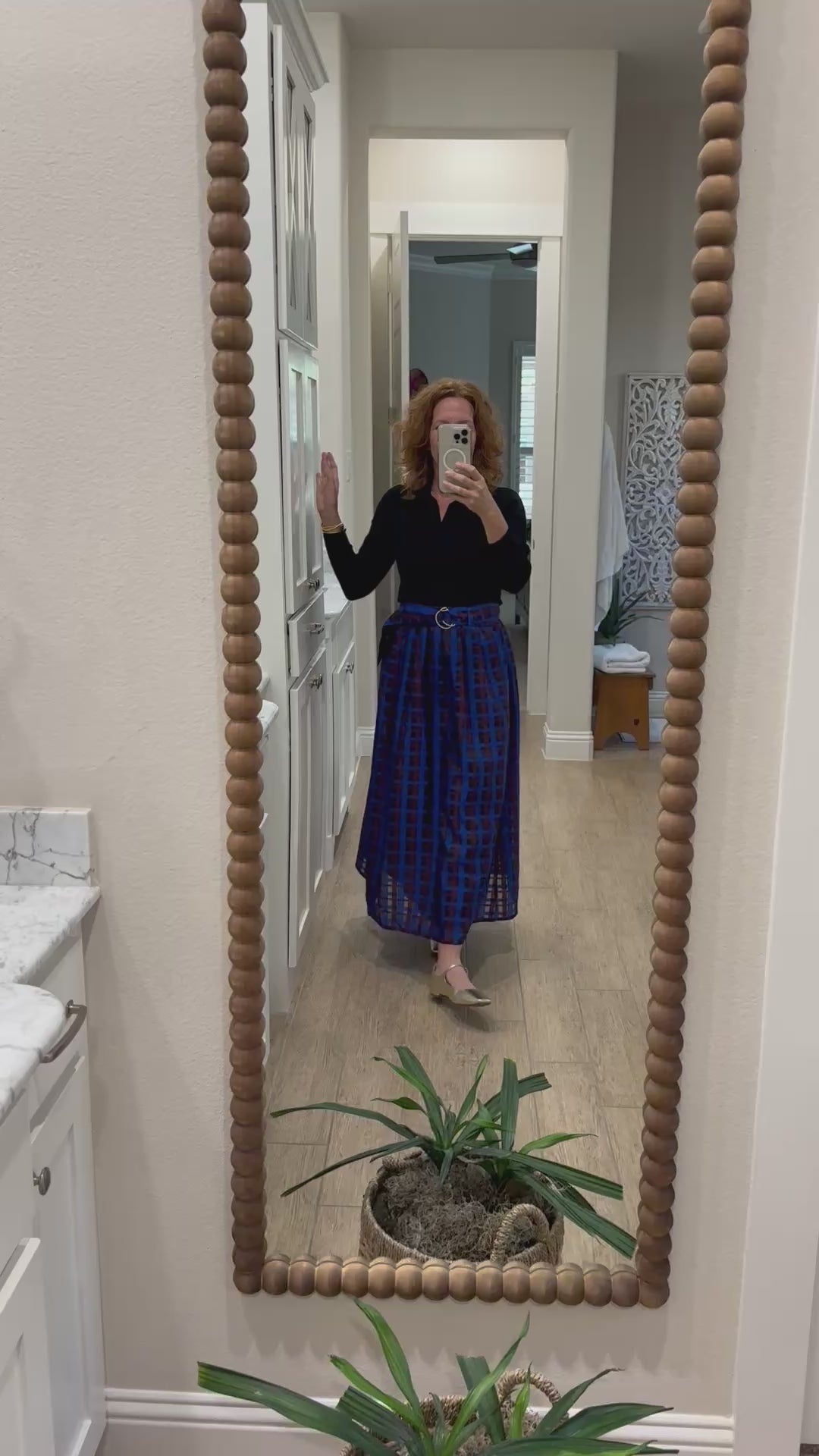 A full skirt made in the finest jacquard fabric with a square pattern. The stretch waist band comes with a removable gold D-ring belt in matching satin fabric. Fully lined with pockets.