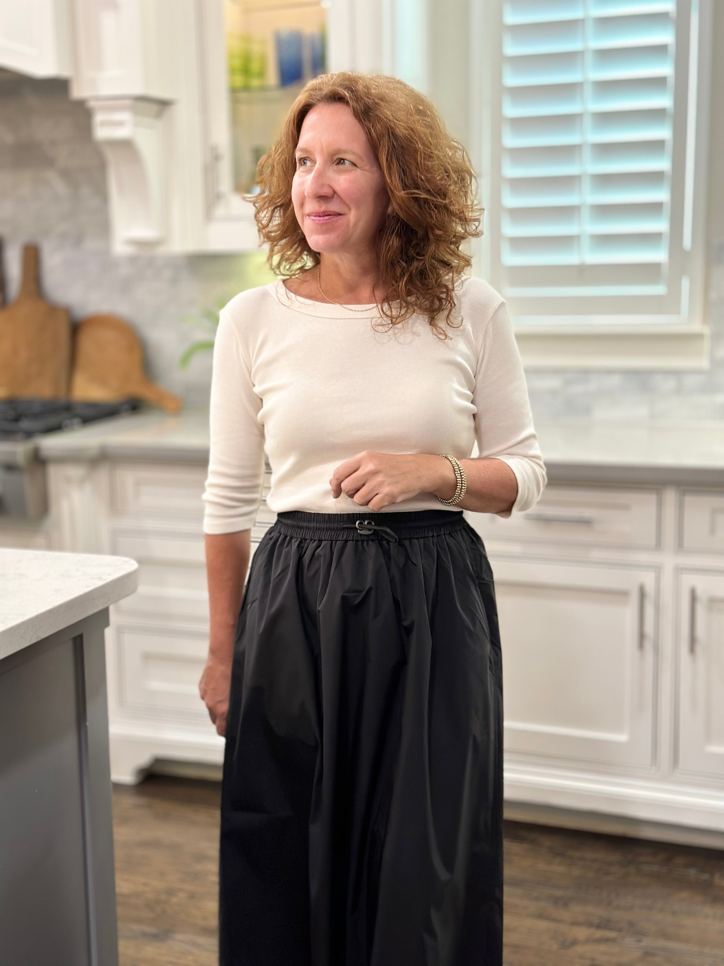 This nylon maxi skirt has a stretch waist, zipcord detail on waist, pockets and is fully lined. It's classic silhouette make this a piece that will be a favorite year after year and can easily be dressed up or down.