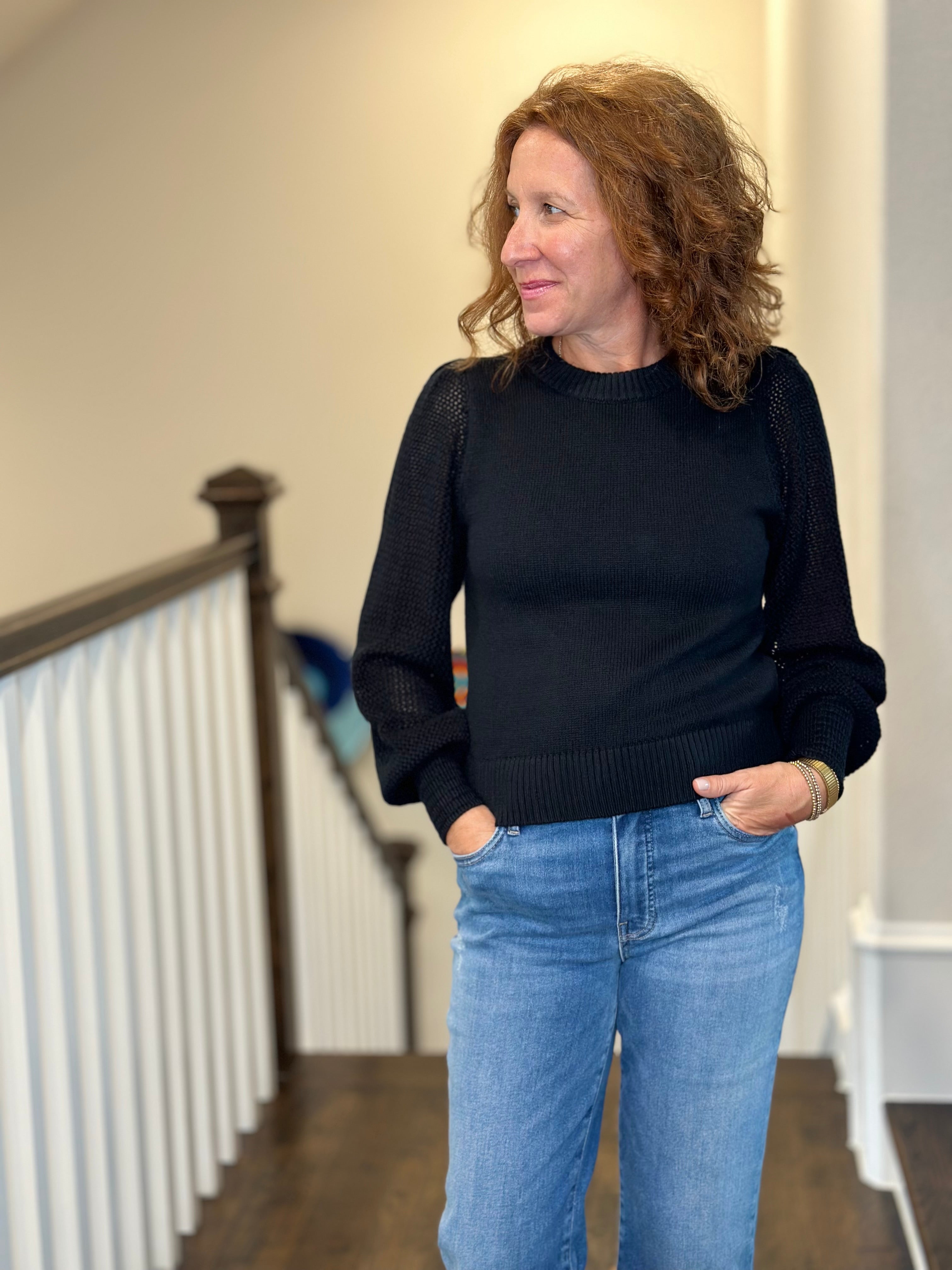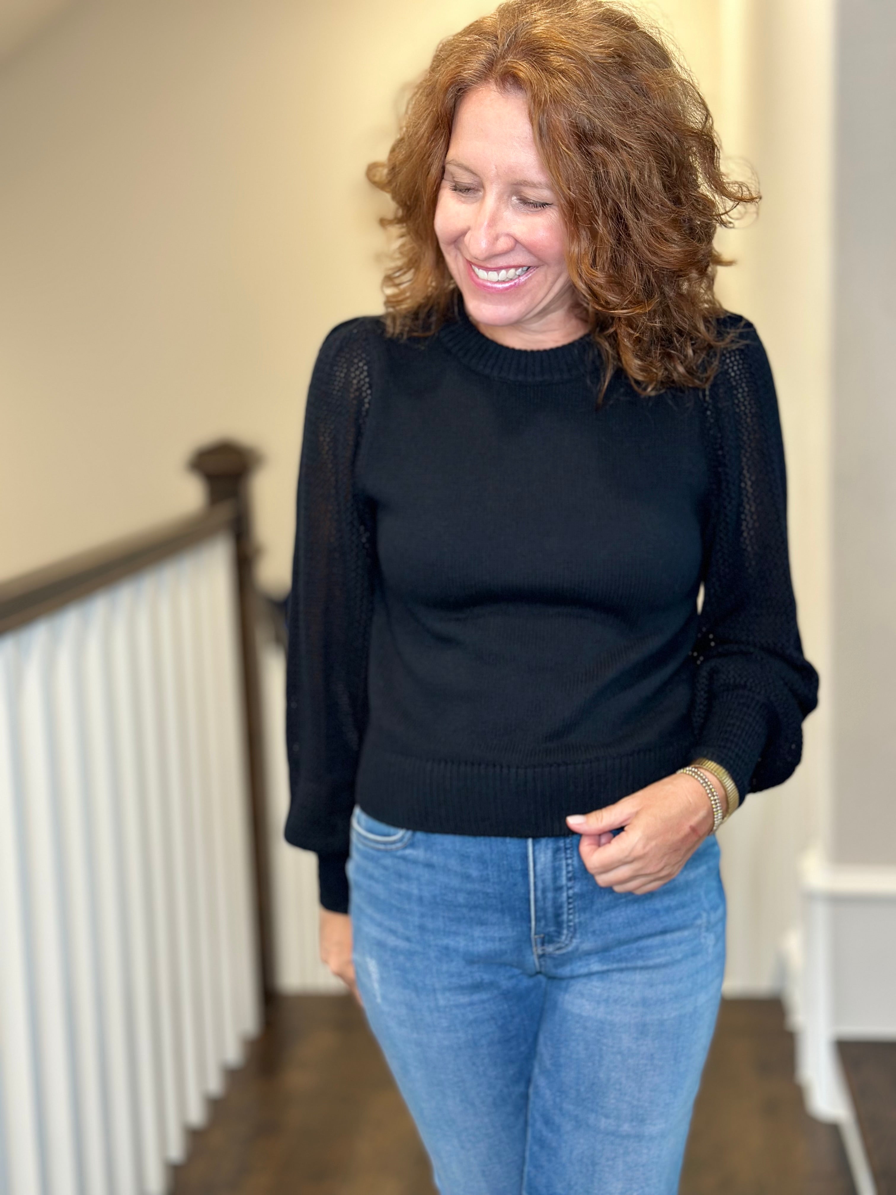 Lilla P - Pointelle Sleeve Crewneck Sweater in Black