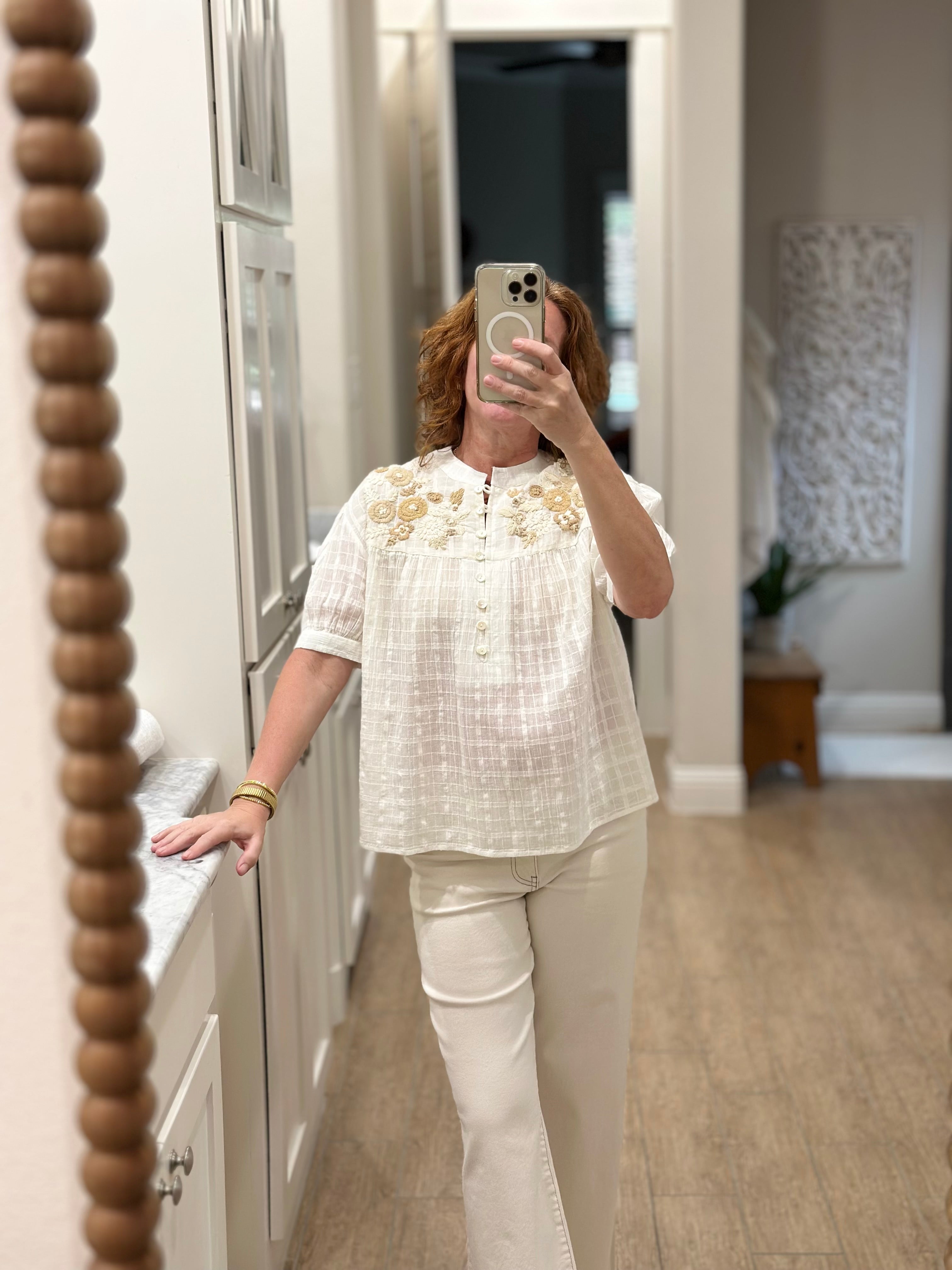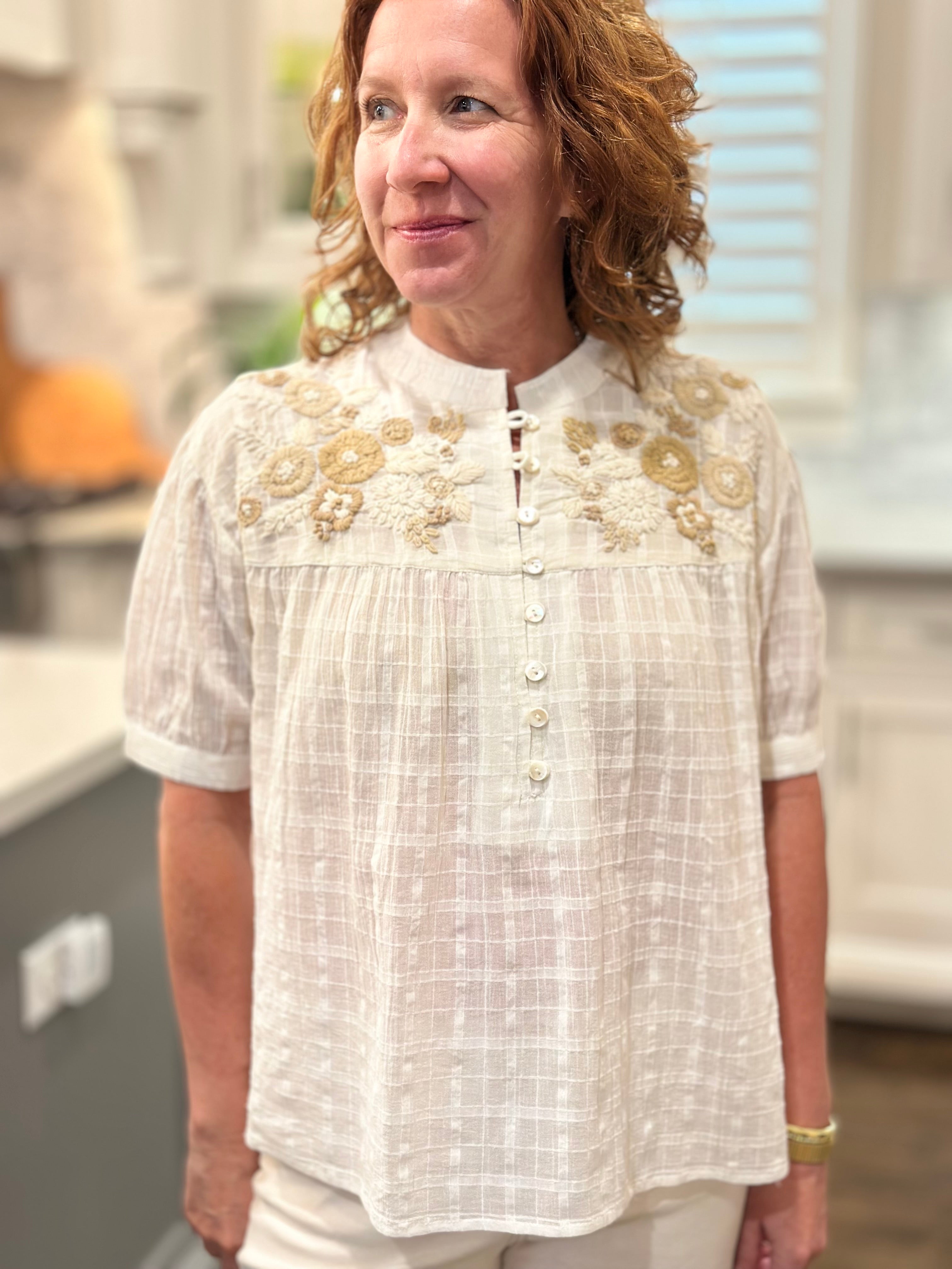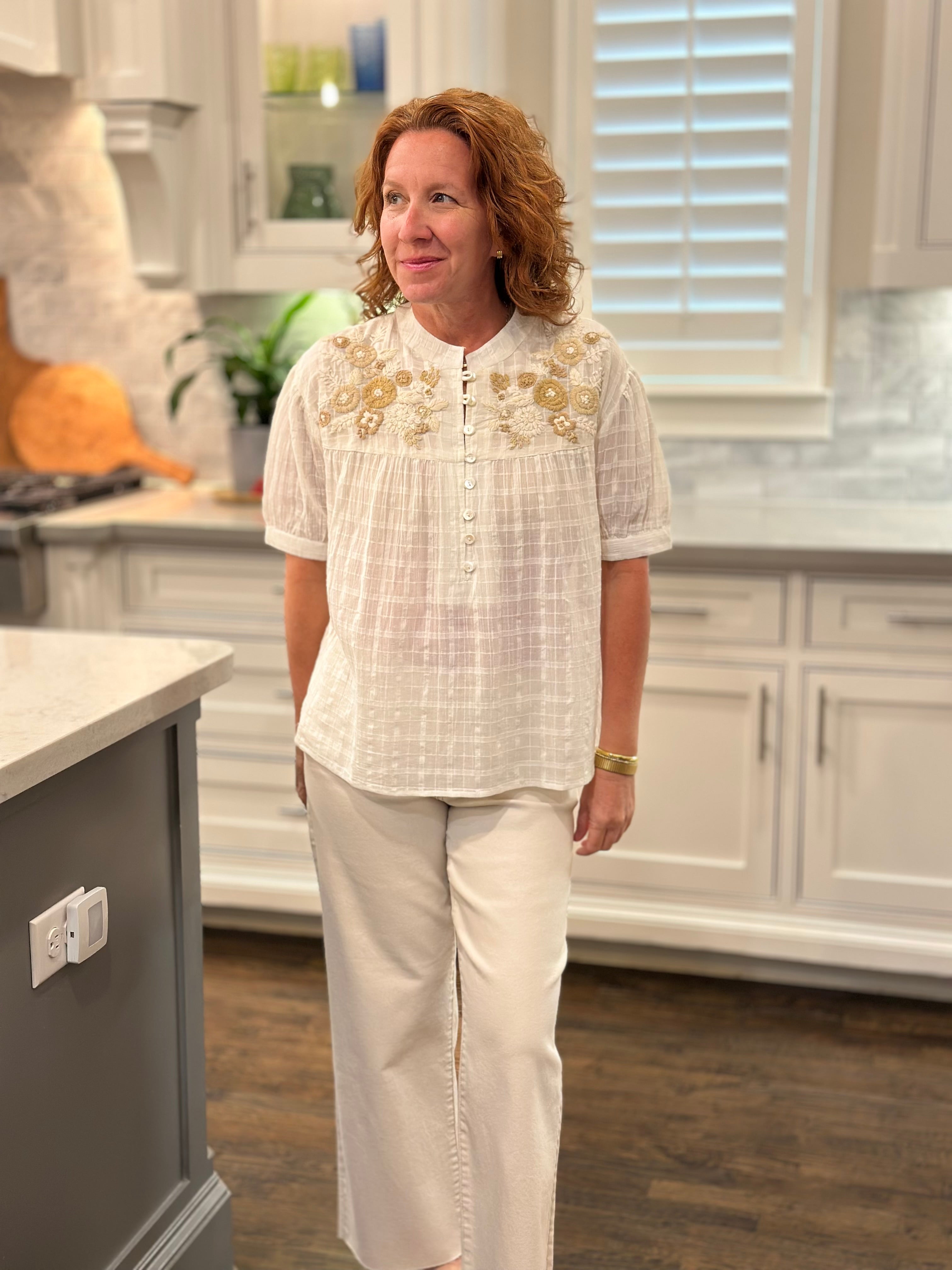 An easy, feminine top with beautiful embroidered floral detail across the yoke. Featuring a soft textured fabric, short sleeves, and delicate button-front detail, it’s lightweight, flattering, and perfect with white denim or your favorite jeans for an effortless everyday look.