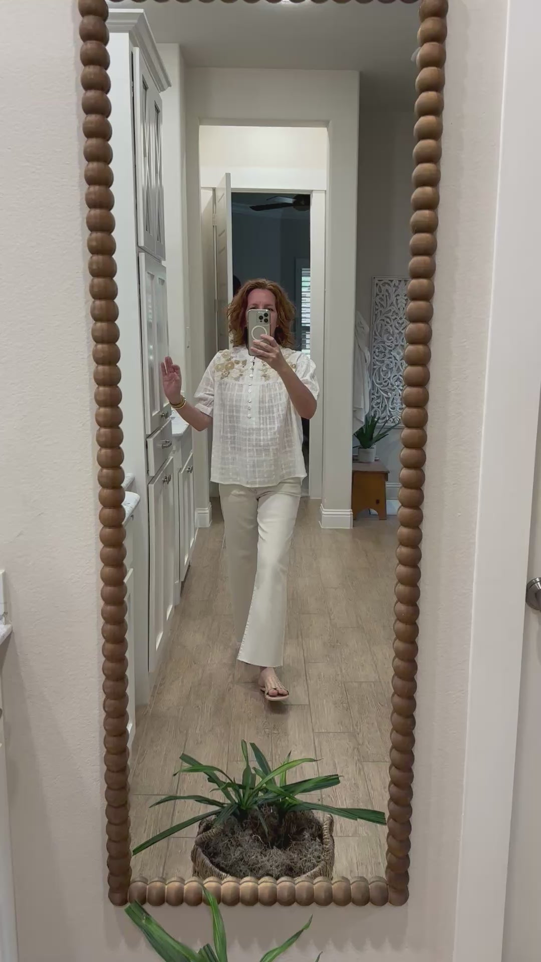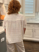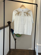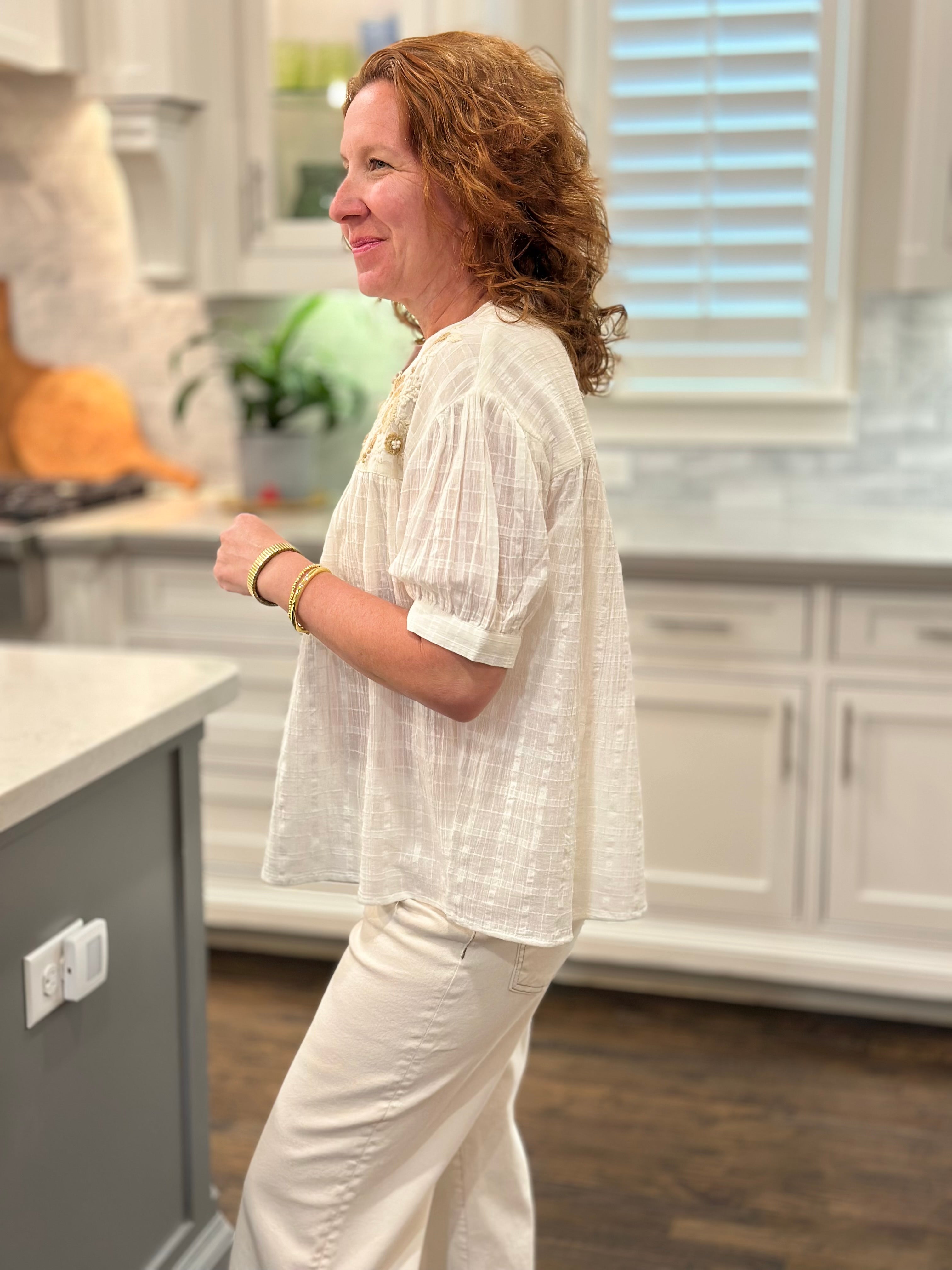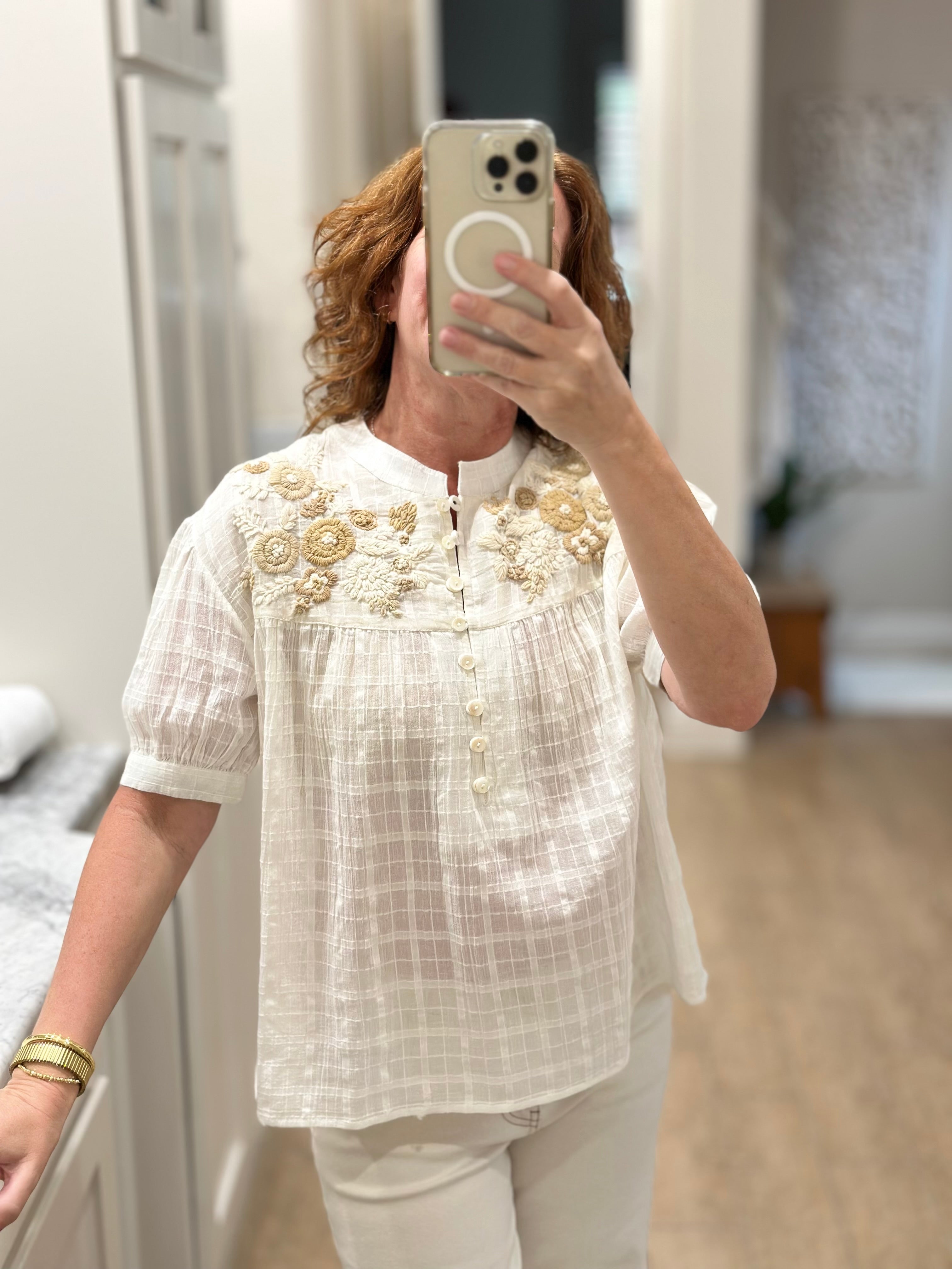 An easy, feminine top with beautiful embroidered floral detail across the yoke. Featuring a soft textured fabric, short sleeves, and delicate button-front detail, it’s lightweight, flattering, and perfect with white denim or your favorite jeans for an effortless everyday look.