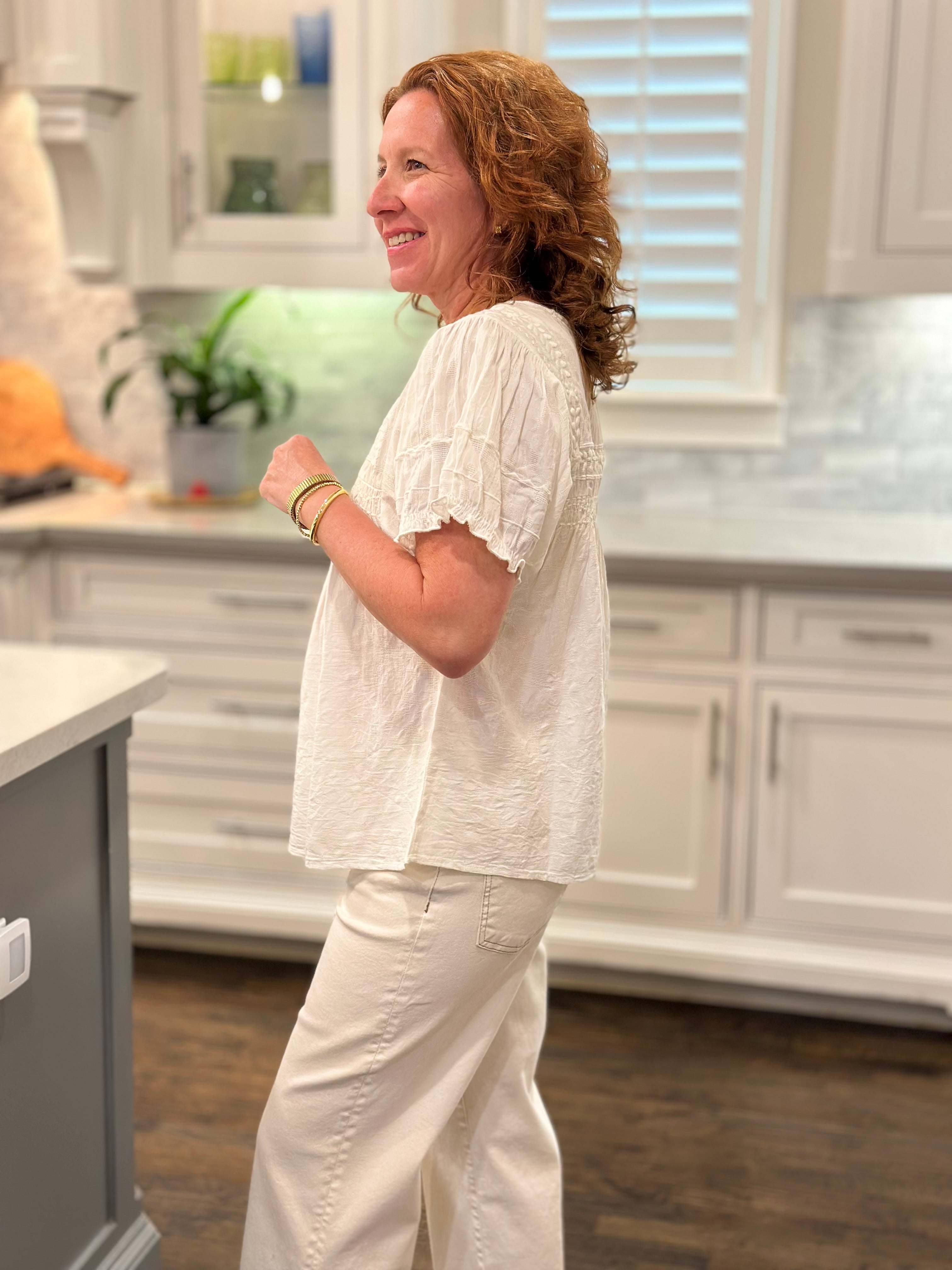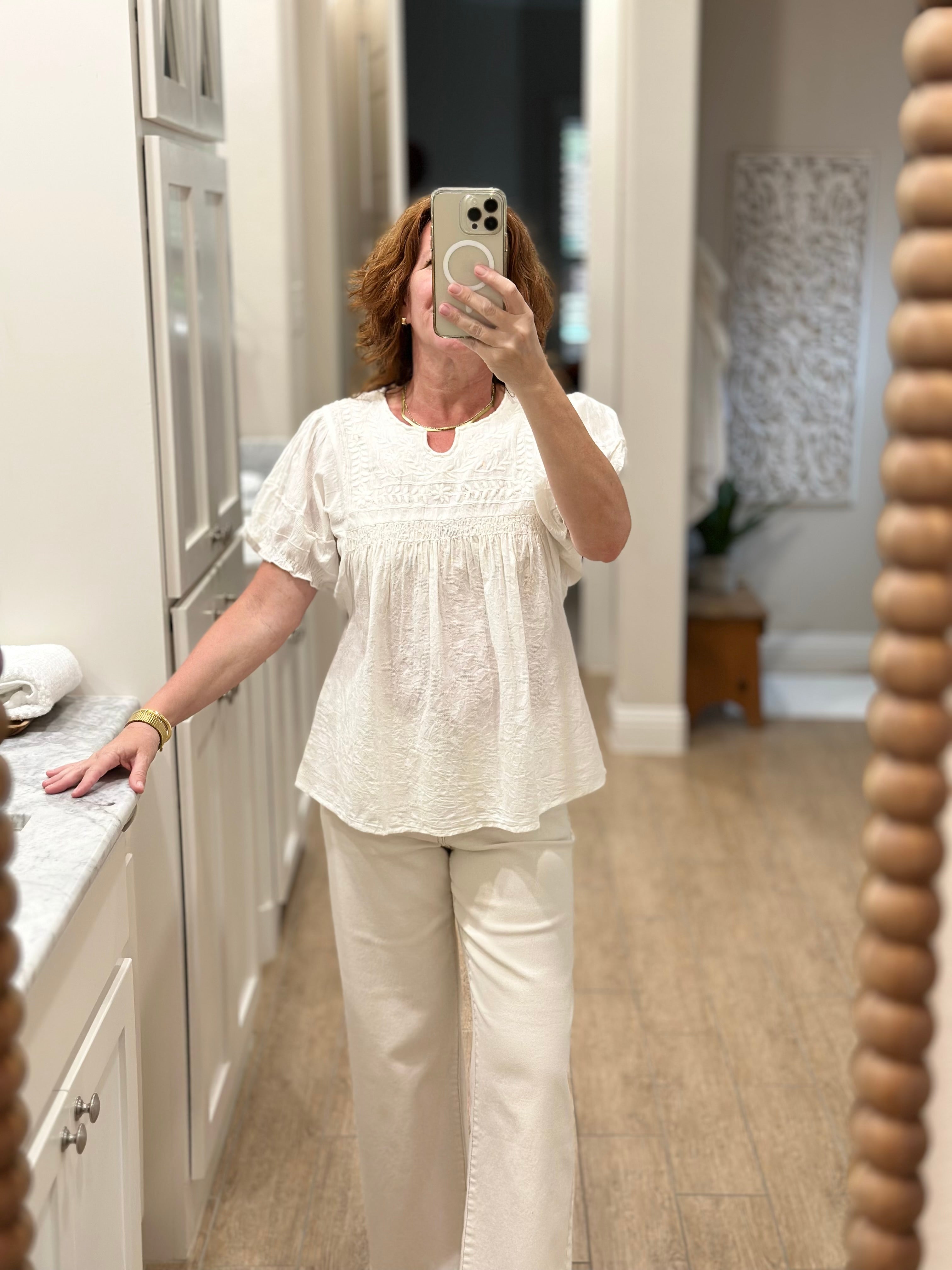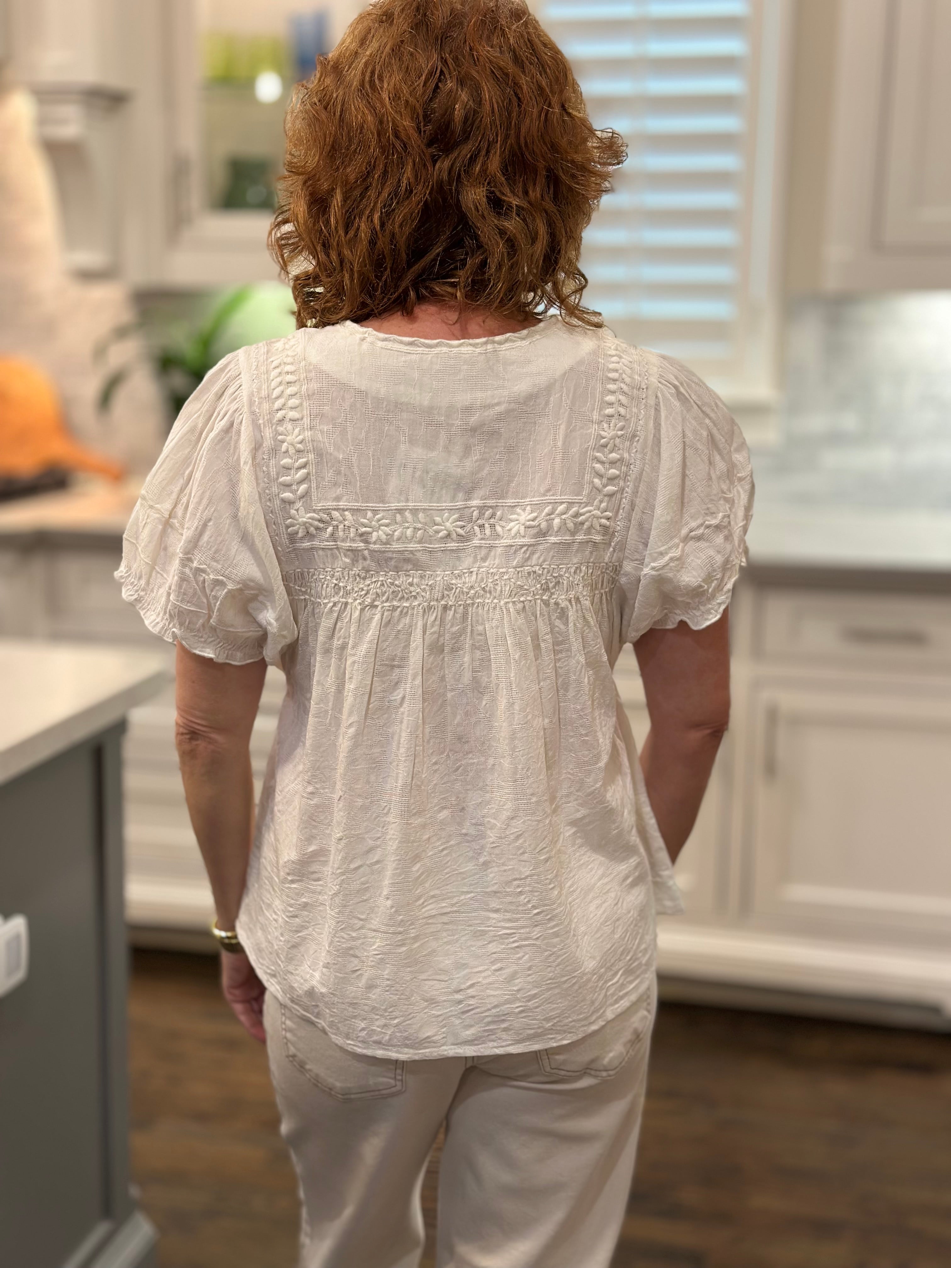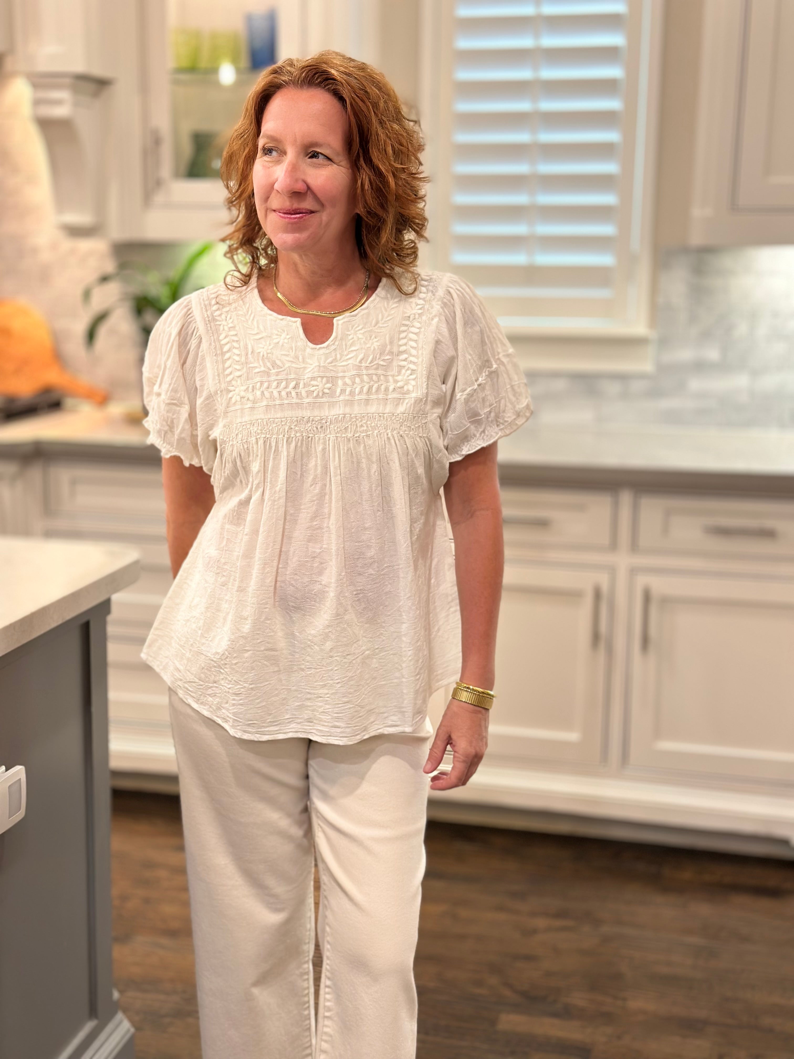 Soft, feminine, and effortlessly pretty. This ivory blouse features delicate embroidery, flutter sleeves, and a relaxed silhouette that drapes beautifully. An easy piece to dress up or down all season long.