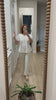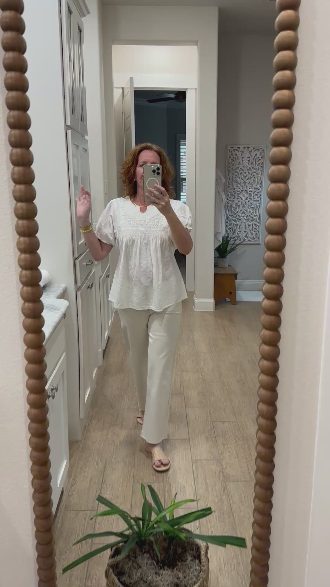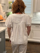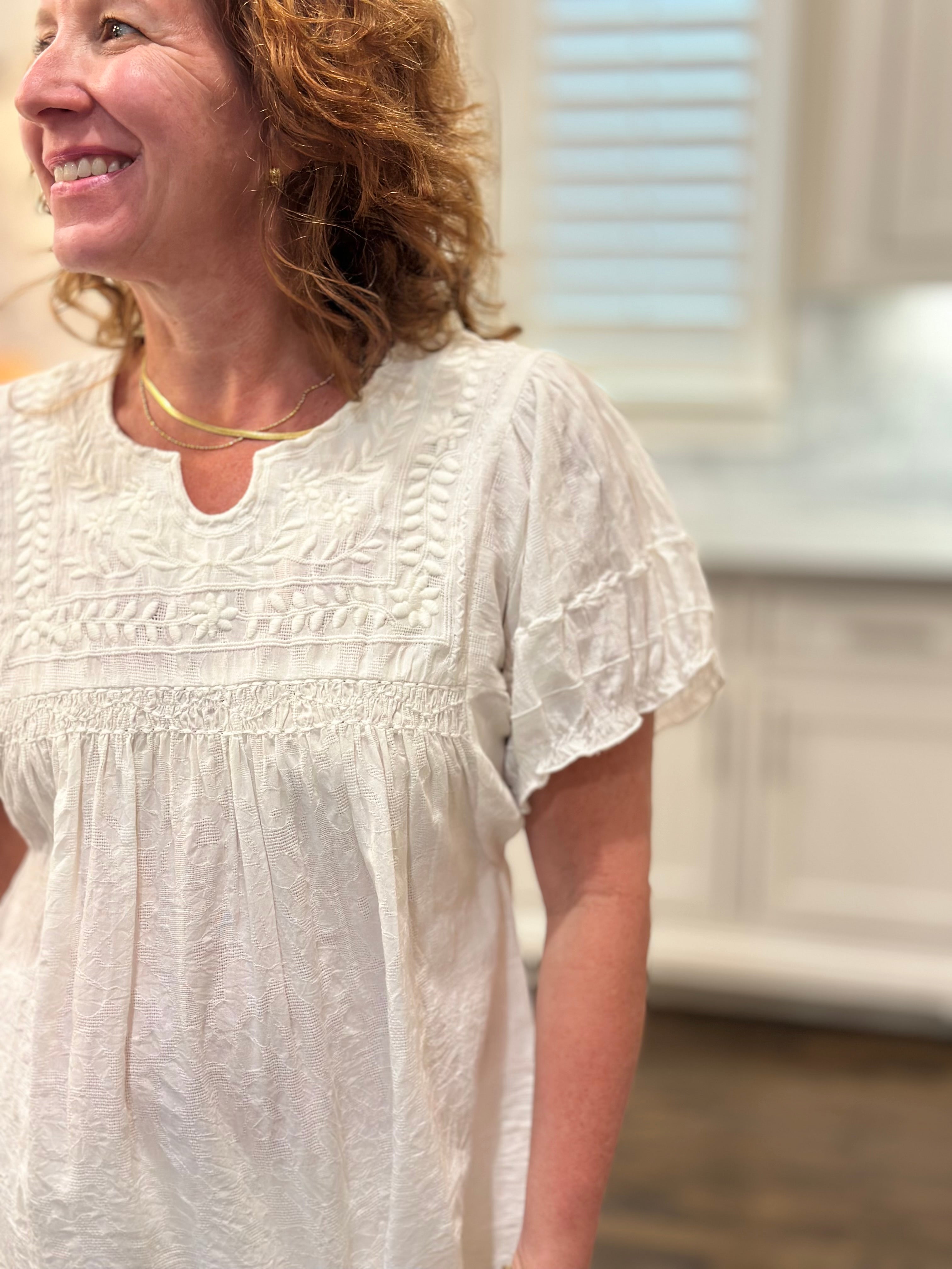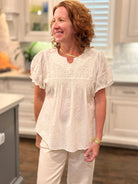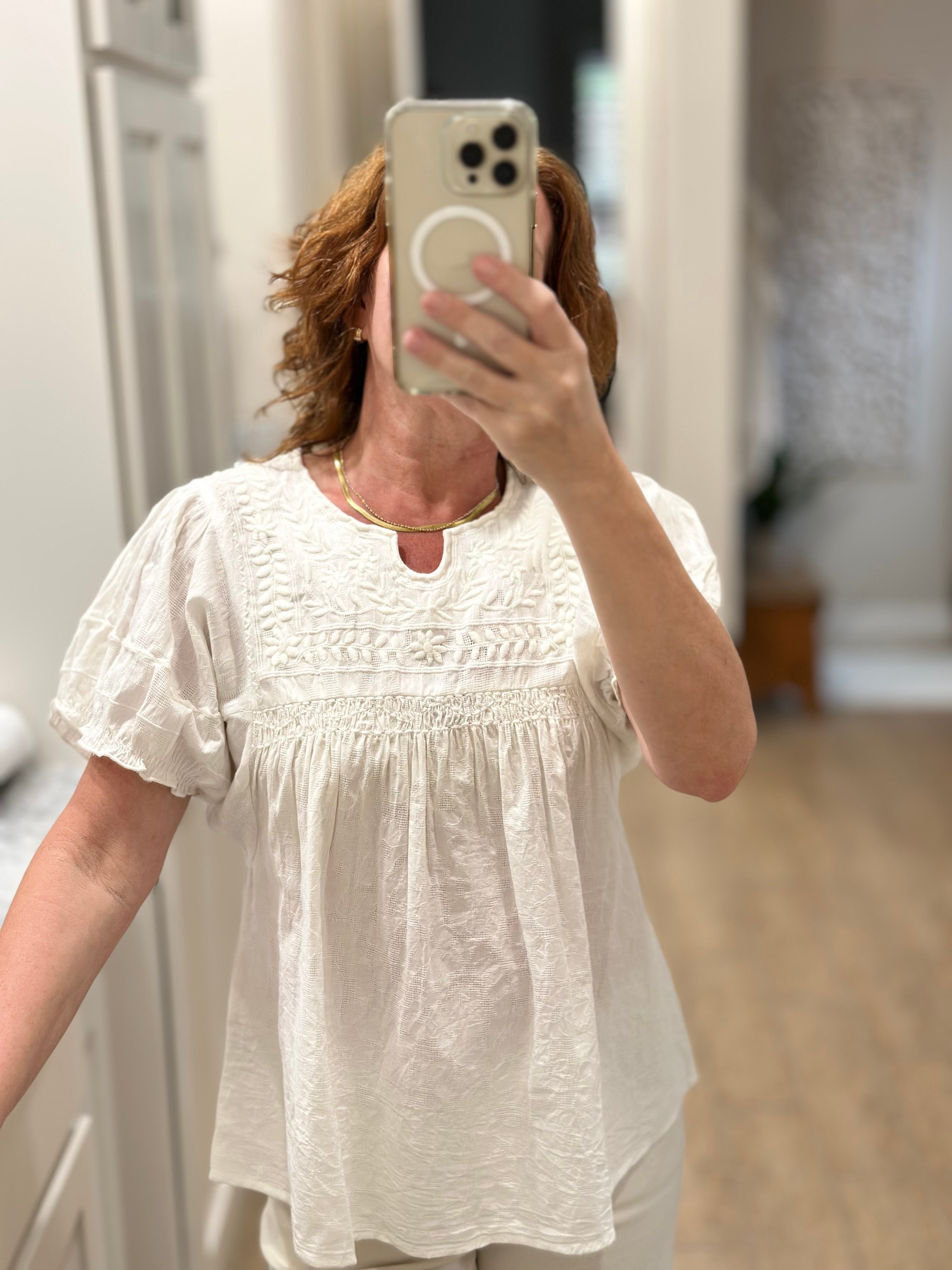 Soft, feminine, and effortlessly pretty. This ivory blouse features delicate embroidery, flutter sleeves, and a relaxed silhouette that drapes beautifully. An easy piece to dress up or down all season long.