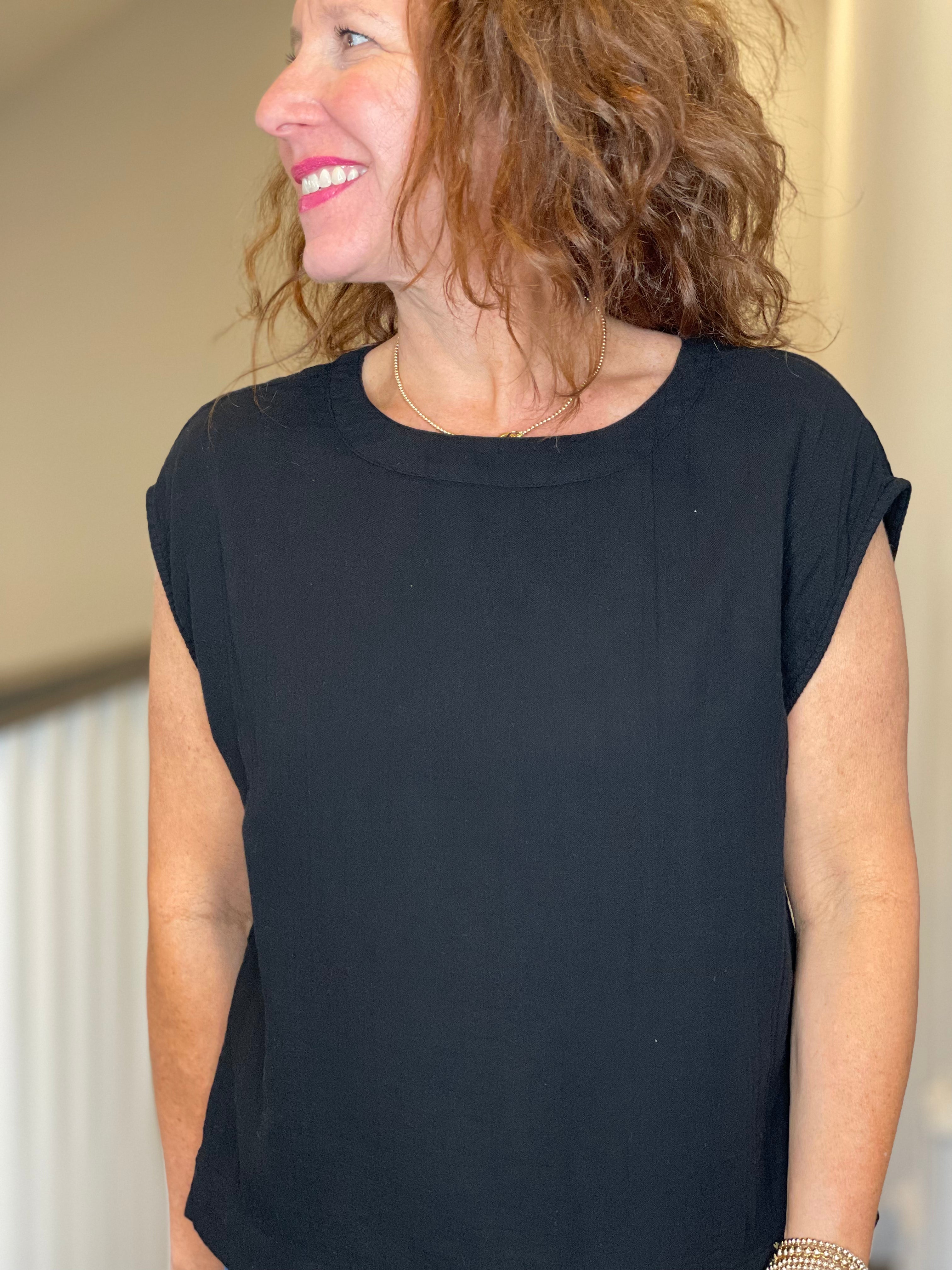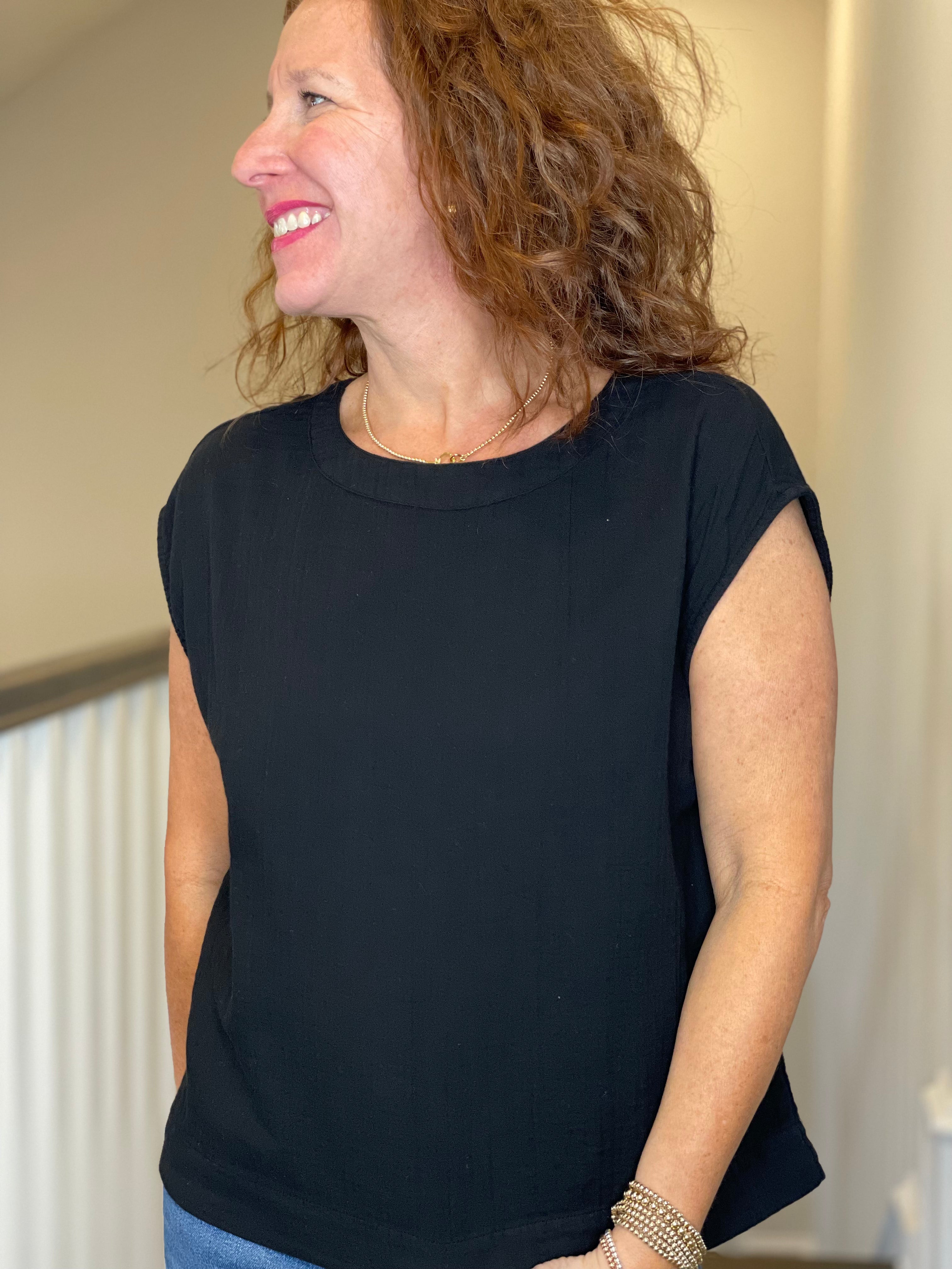 Classic carefree top. Easy pullover with feminine neckline and keyhole button back. Fit is true. Hem hits at hip for nice coverage.