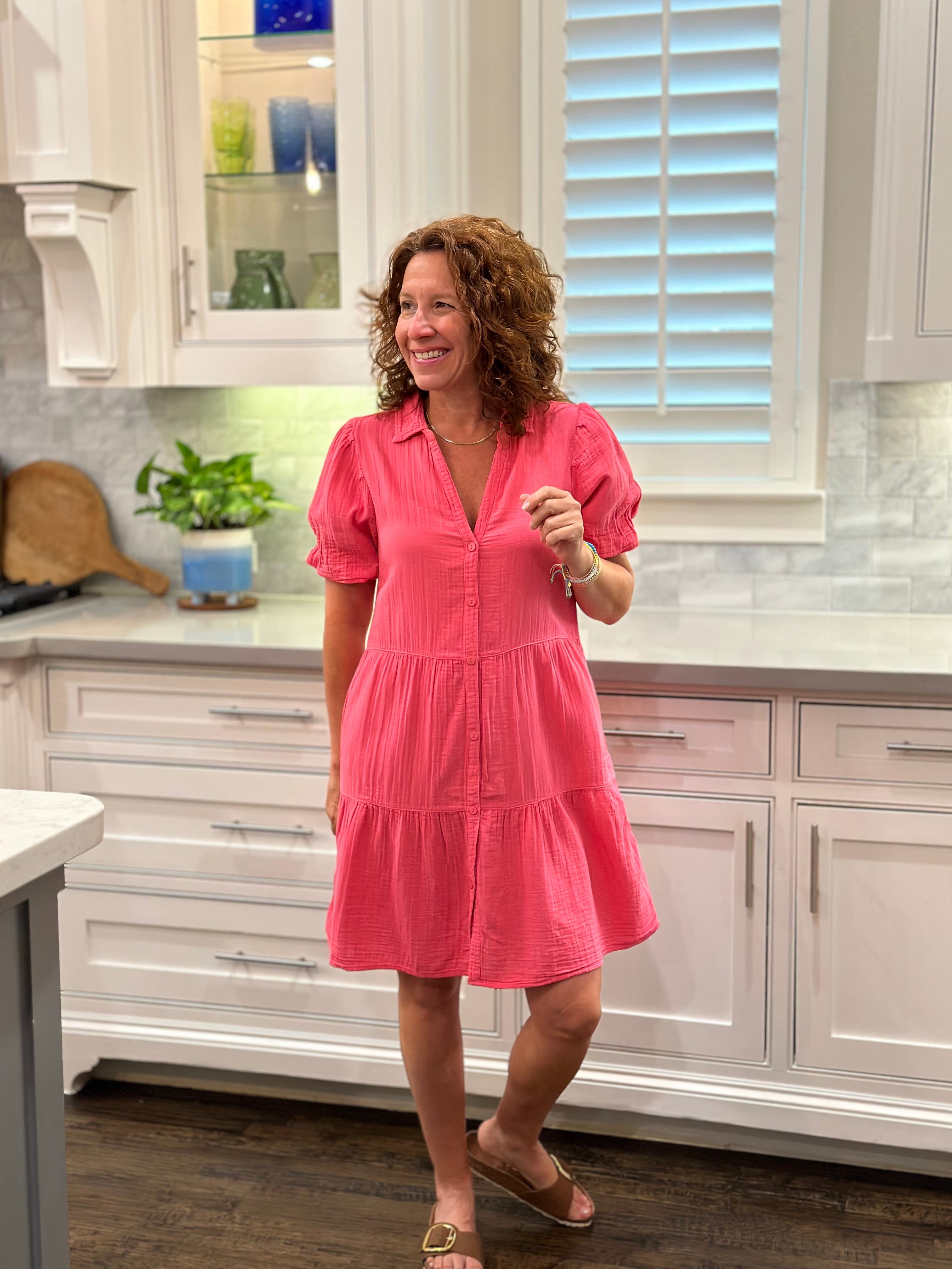 Short puff sleeves, button down front, tiered body and pockets make this dress a throw on and go piece that will be in your regular rotation for comfort and ease.