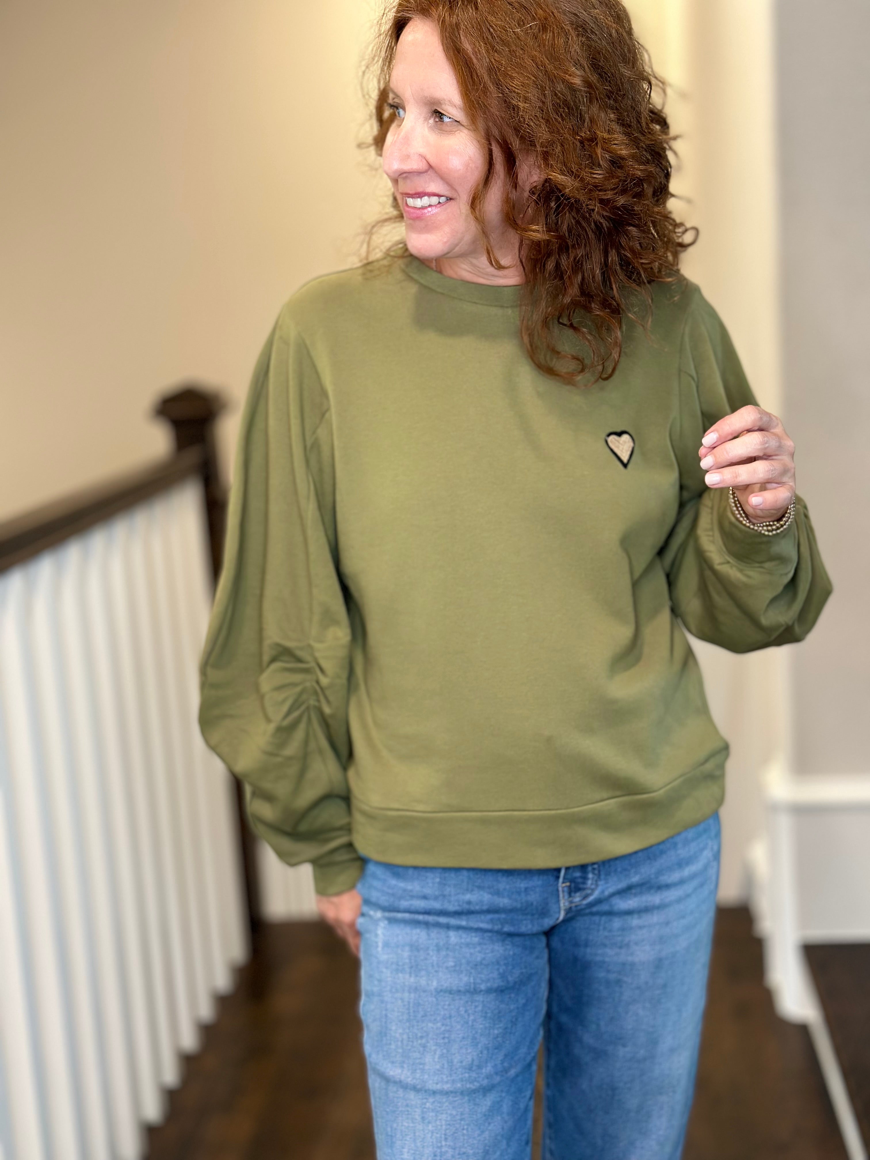 The Jemma Sweatshirt is ultra light weight and oh so soft. It's a perfect throw on a go elevated sweatshirt with puff sleeve details. A piece that can easily be dressed up for an evening out, or worn with sneakers and jeans for a casual look. Heart patch detail makes top extra sweet.