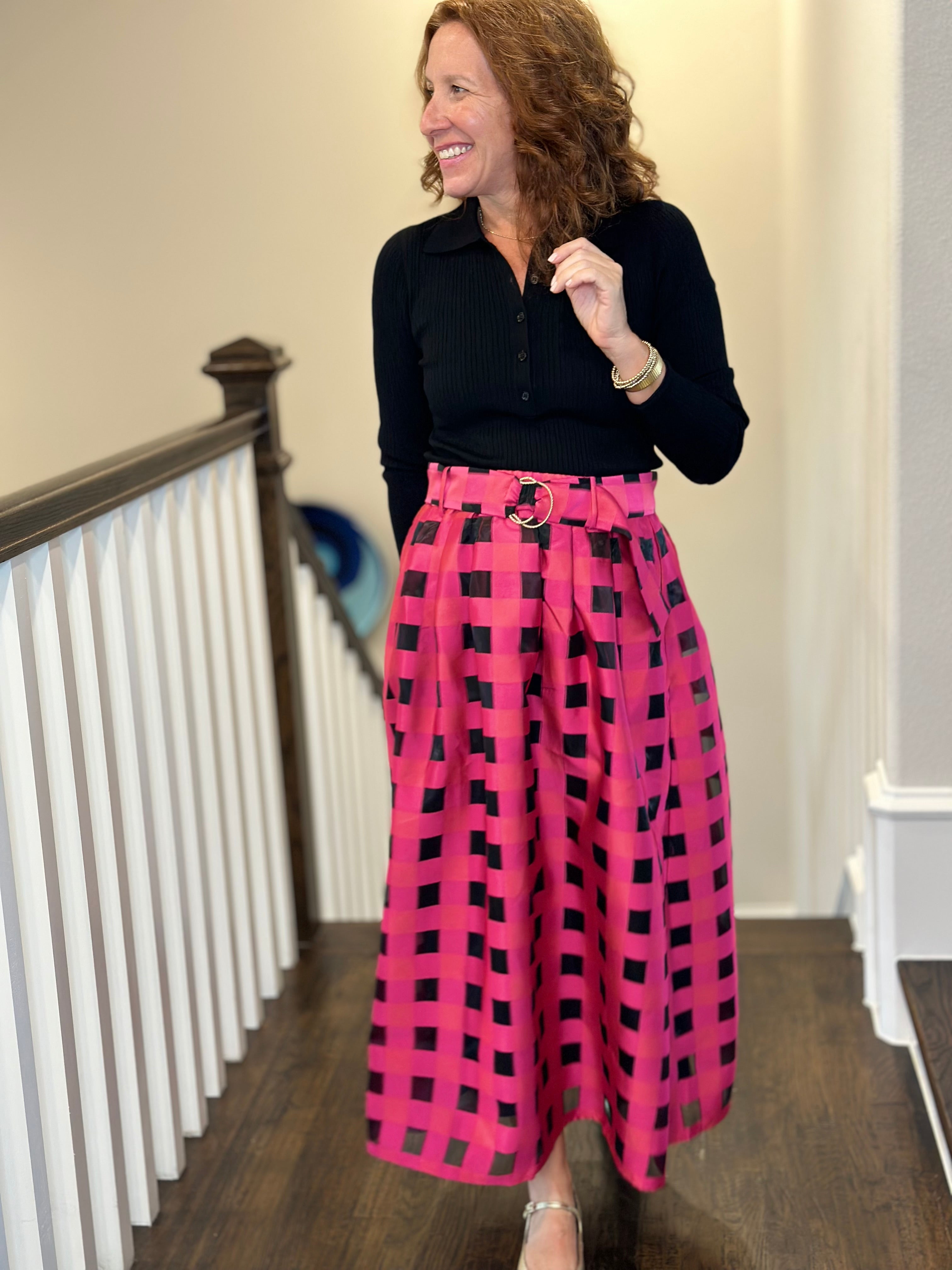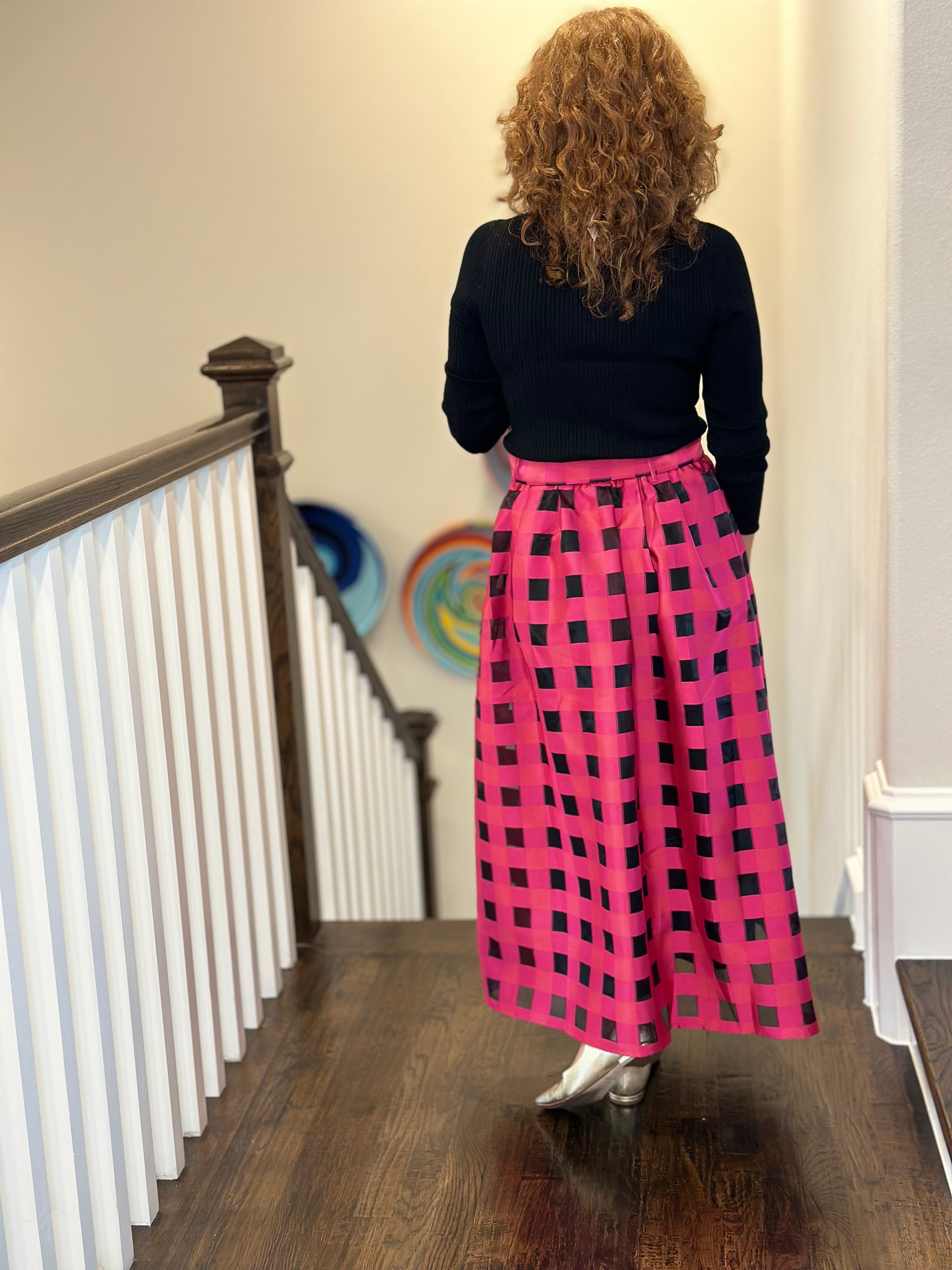 A full skirt made in the finest jacquard fabric with a square pattern. The waist band comes with a removable gold D-ring belt in matching satin fabric. Fully lined with pockets.