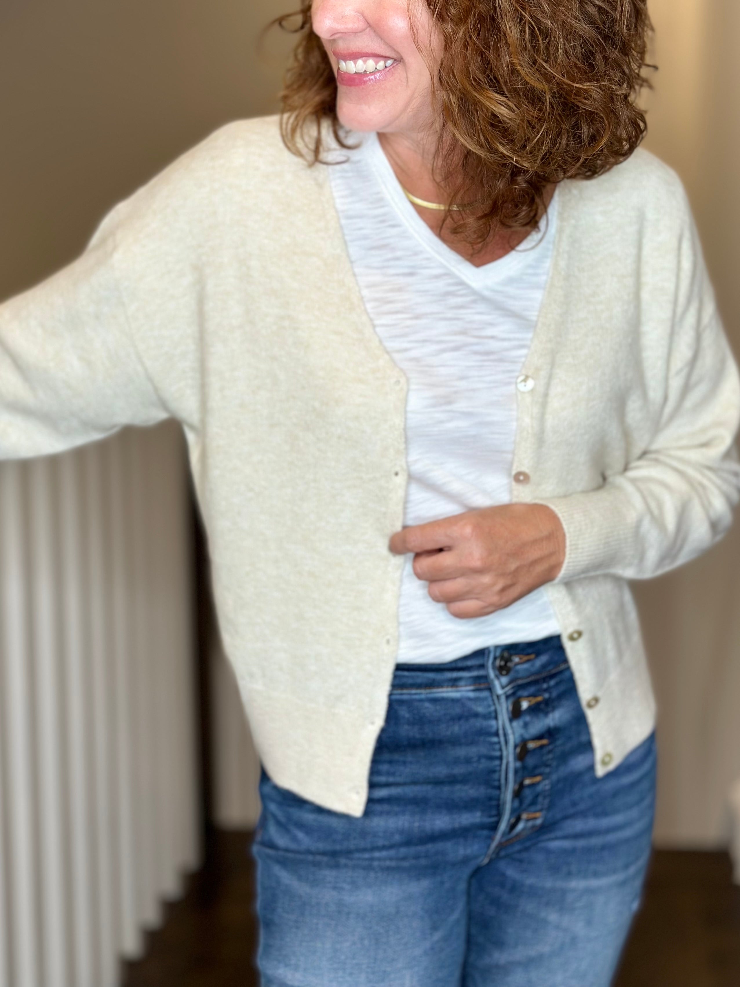A classic silhouette in a super soft knit. Slightly cropped with oyster buttons for an updated look. A piece you’ll wear season after season.