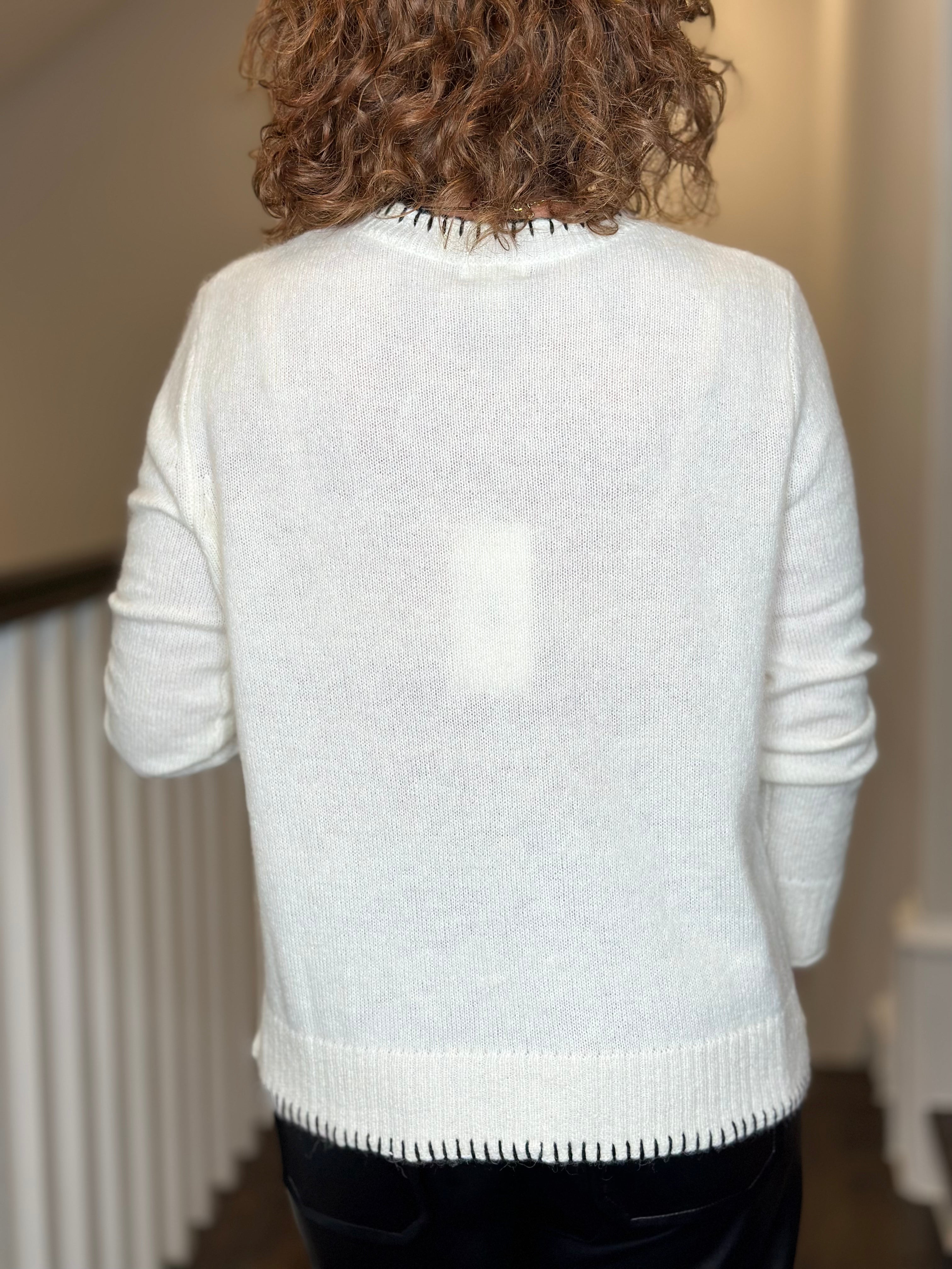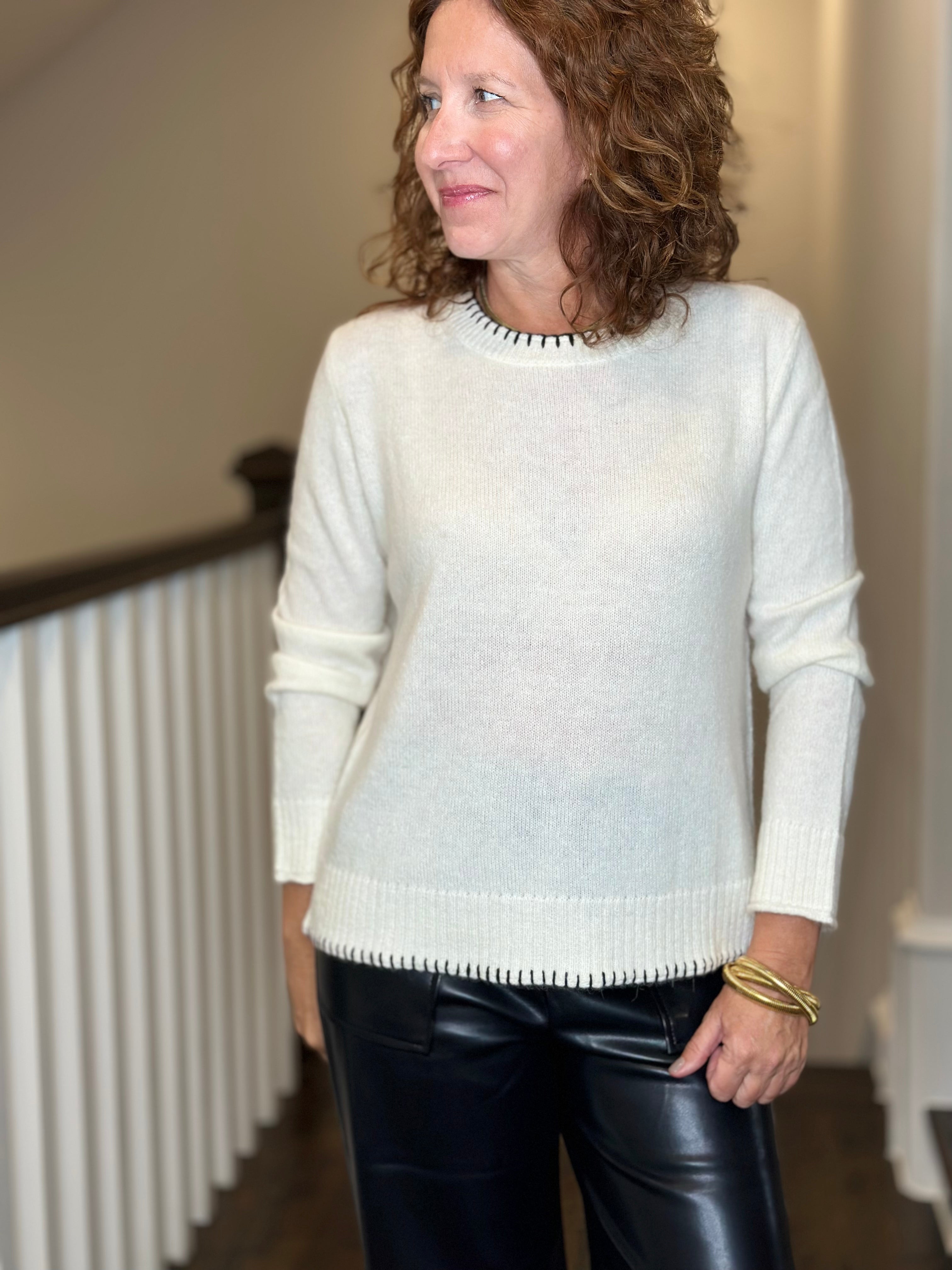 Oh so soft and loose fit on the body makes this whipstitch sweater a perfect piece for cooler temps. Black whip stitching around the neck and hem add a fun classic detail. Rolled sleeves.