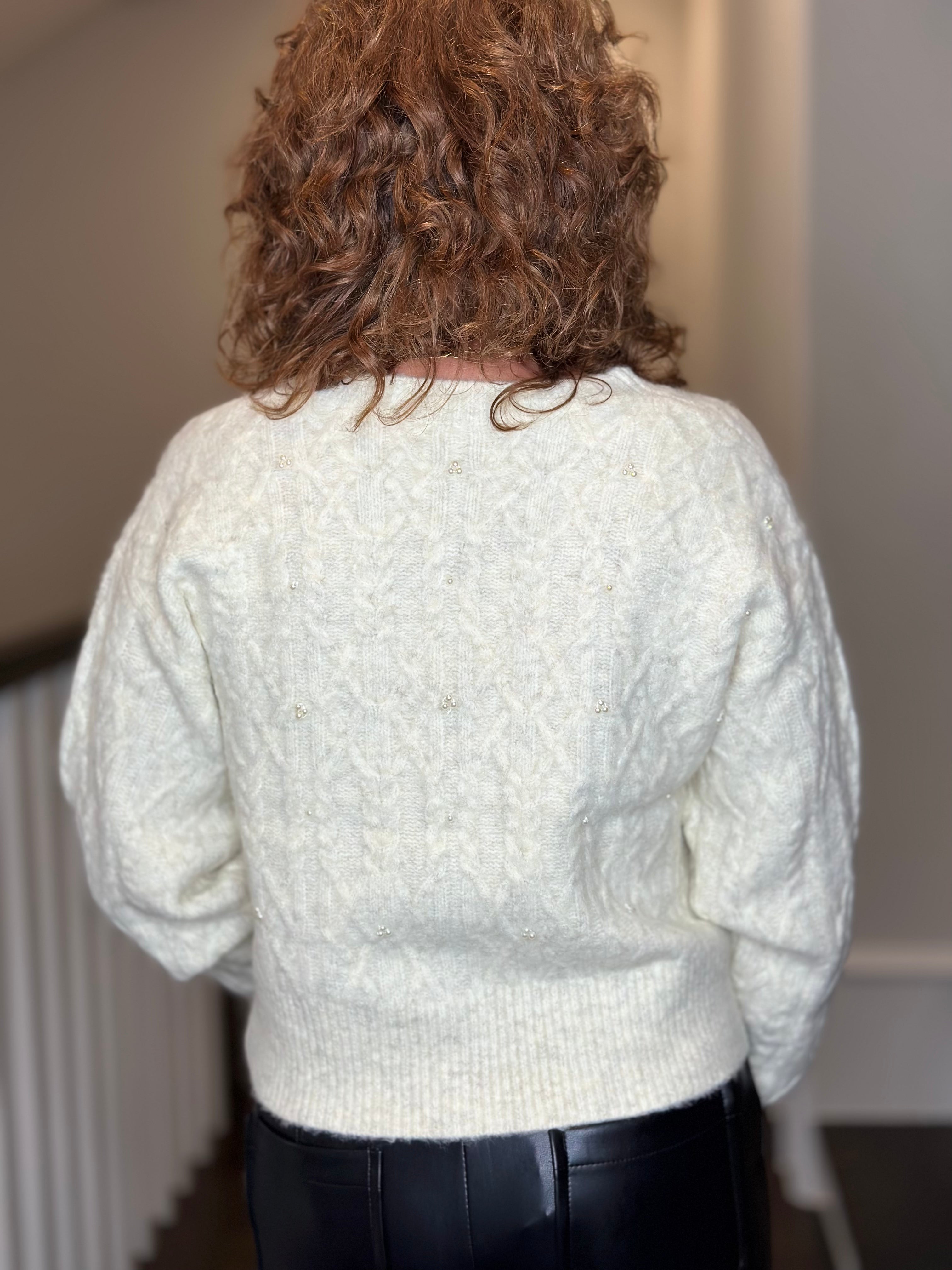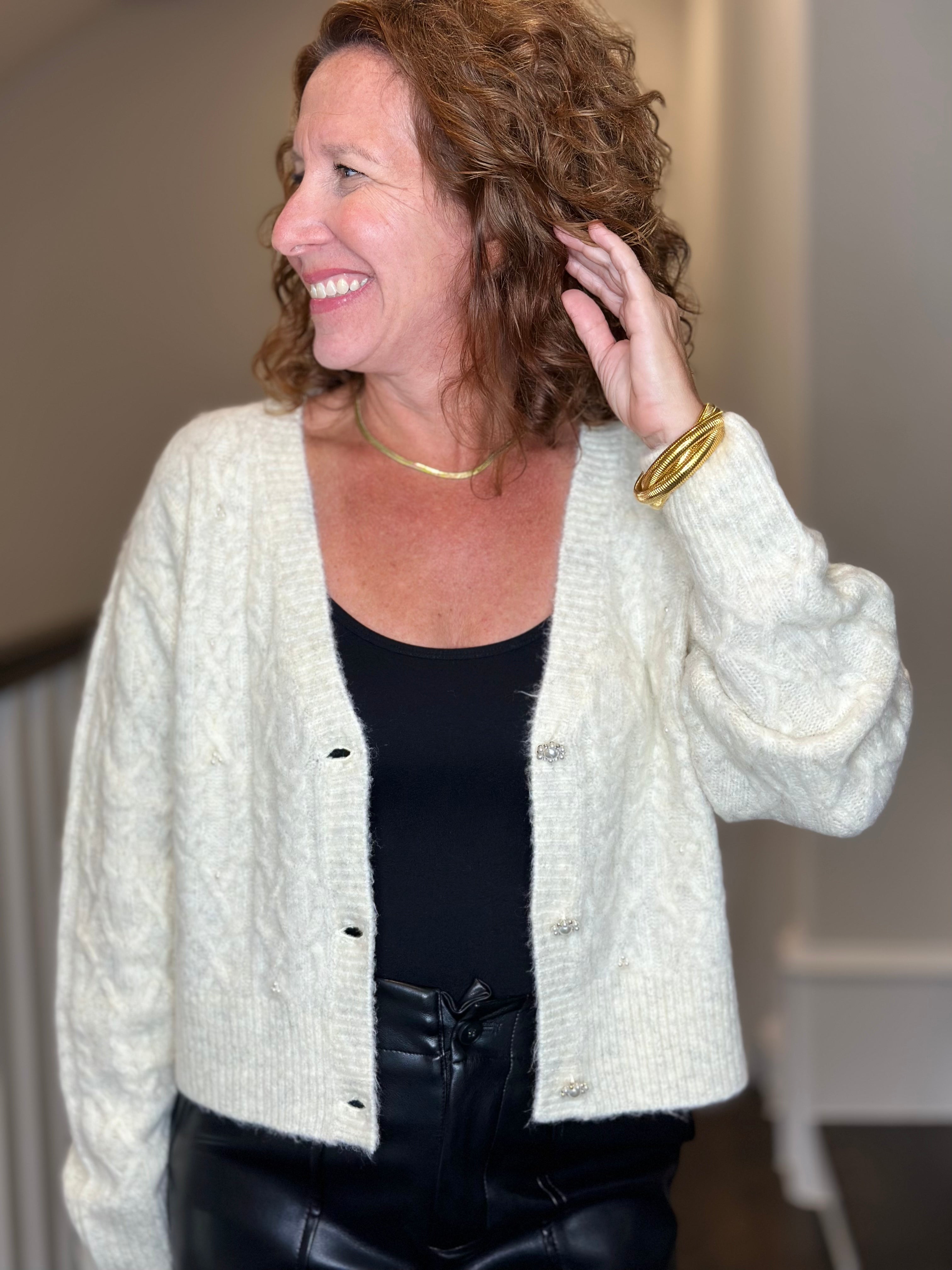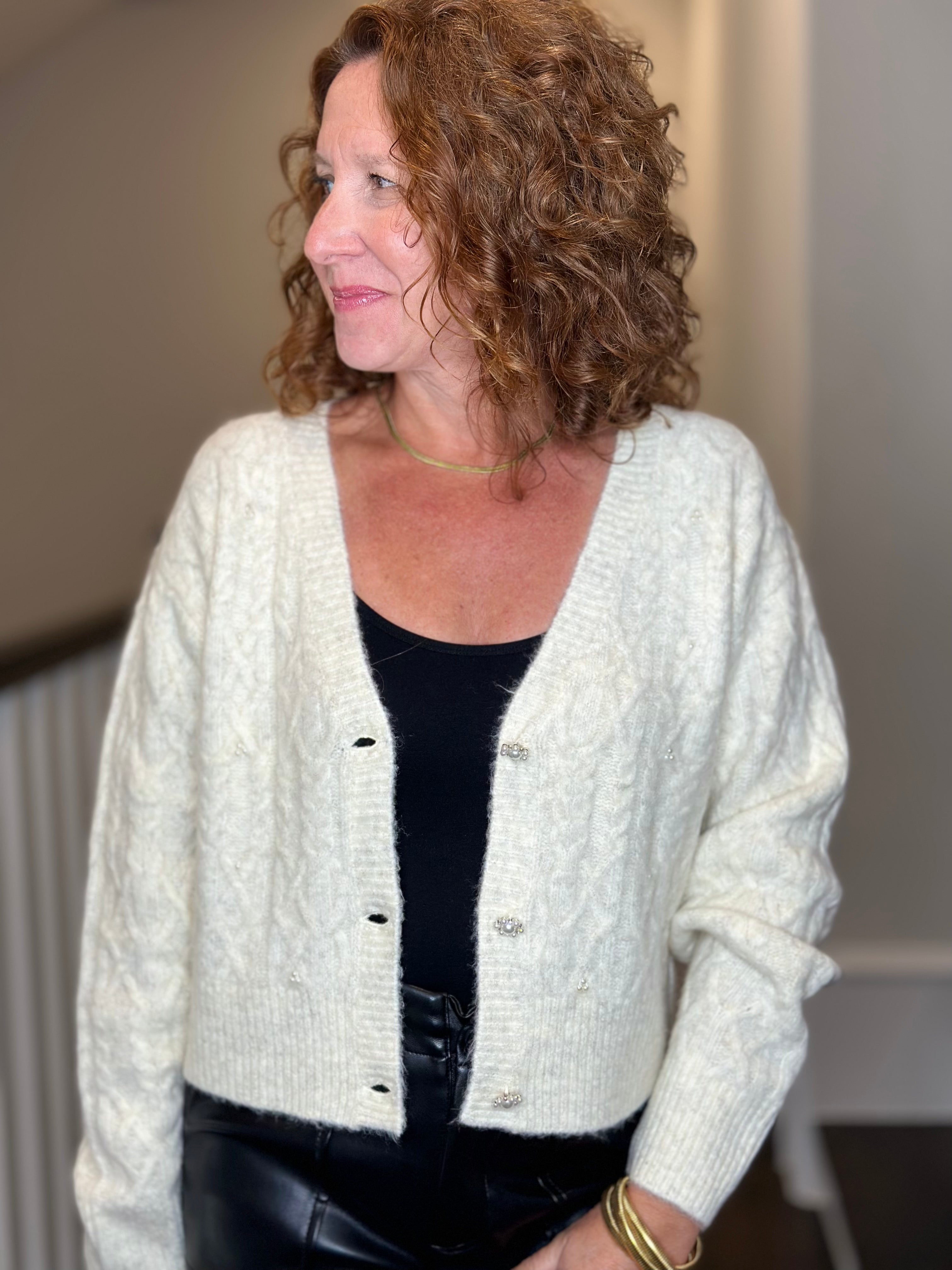 A classic look with a twist that is guaranteed to be a closet favorite. Slightly cropped with pearl buttons and embellishments.