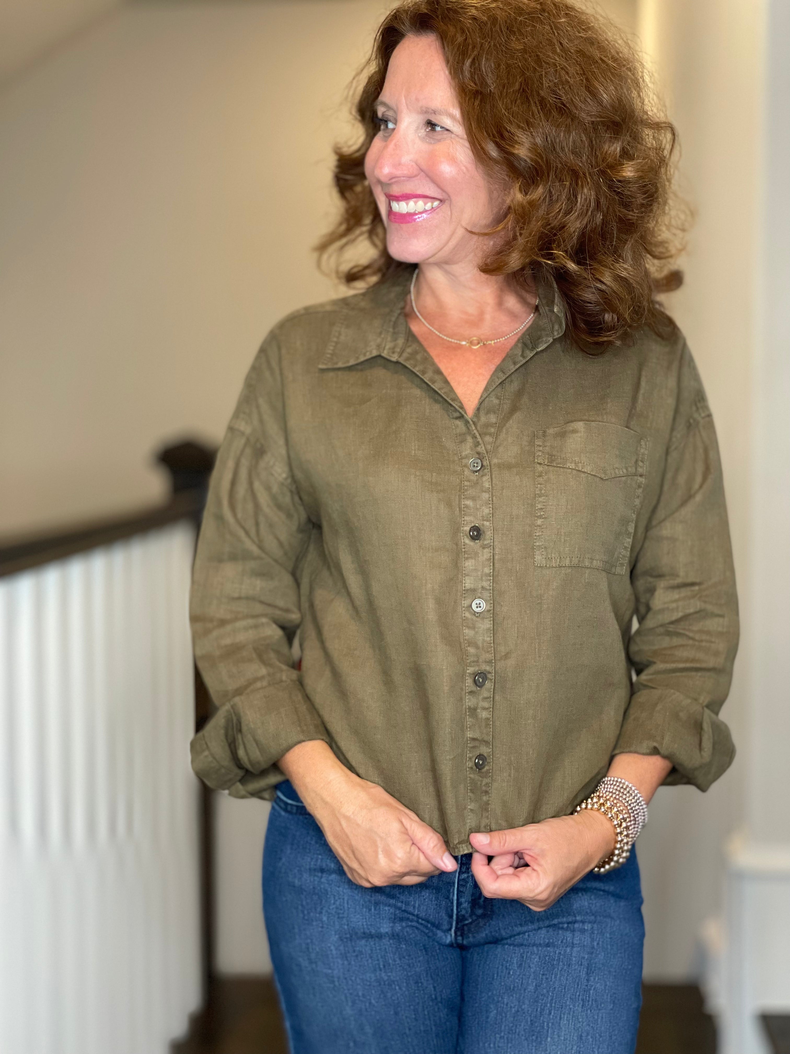 Cropped with a relaxed fit, Gracie is a long sleeve linen button down with a front pocket and an easy vibe. Made from 100% biodegradable linen that is lightweight and breathable. Perfect as a shirt or lightweight jacket.