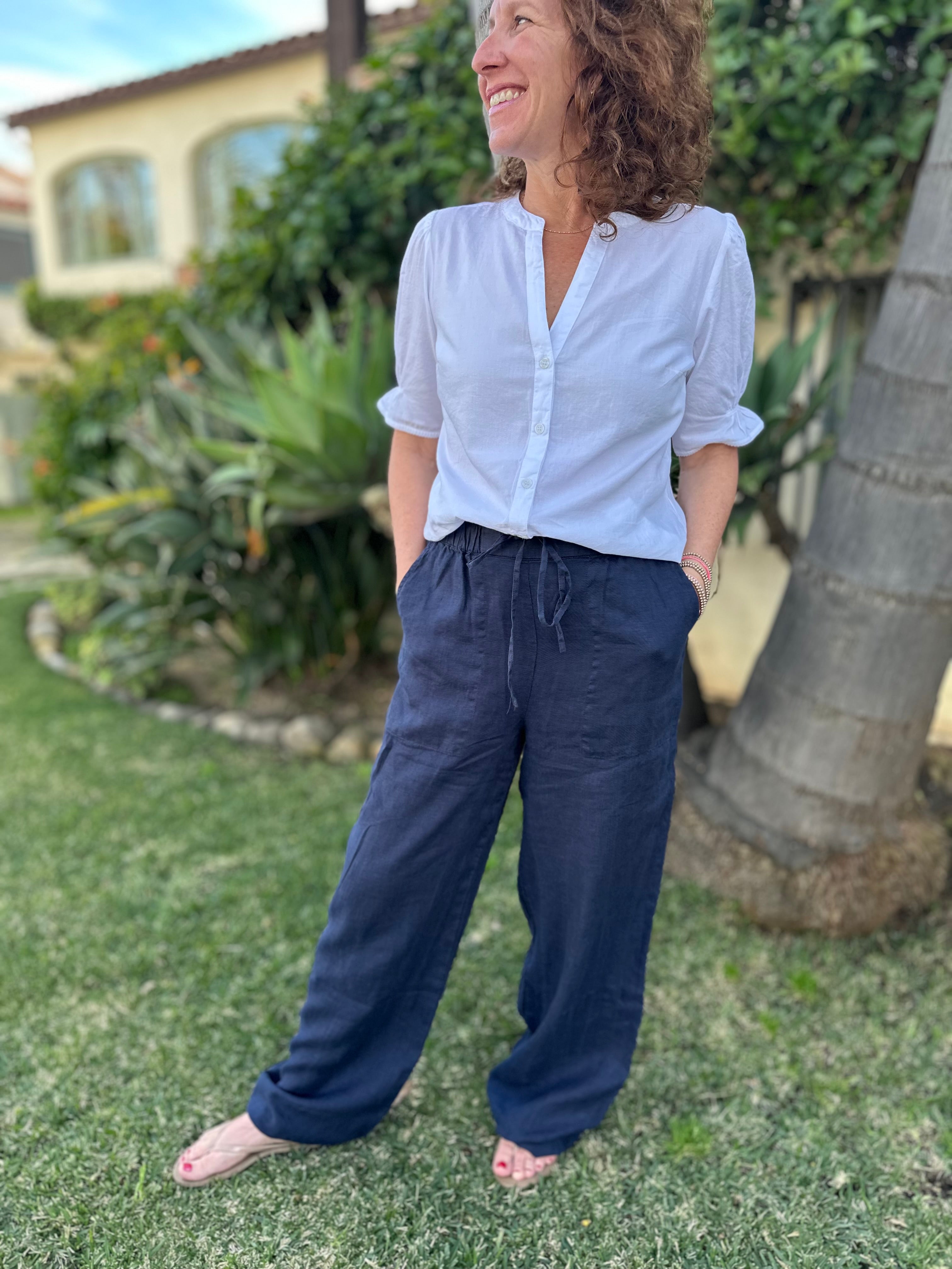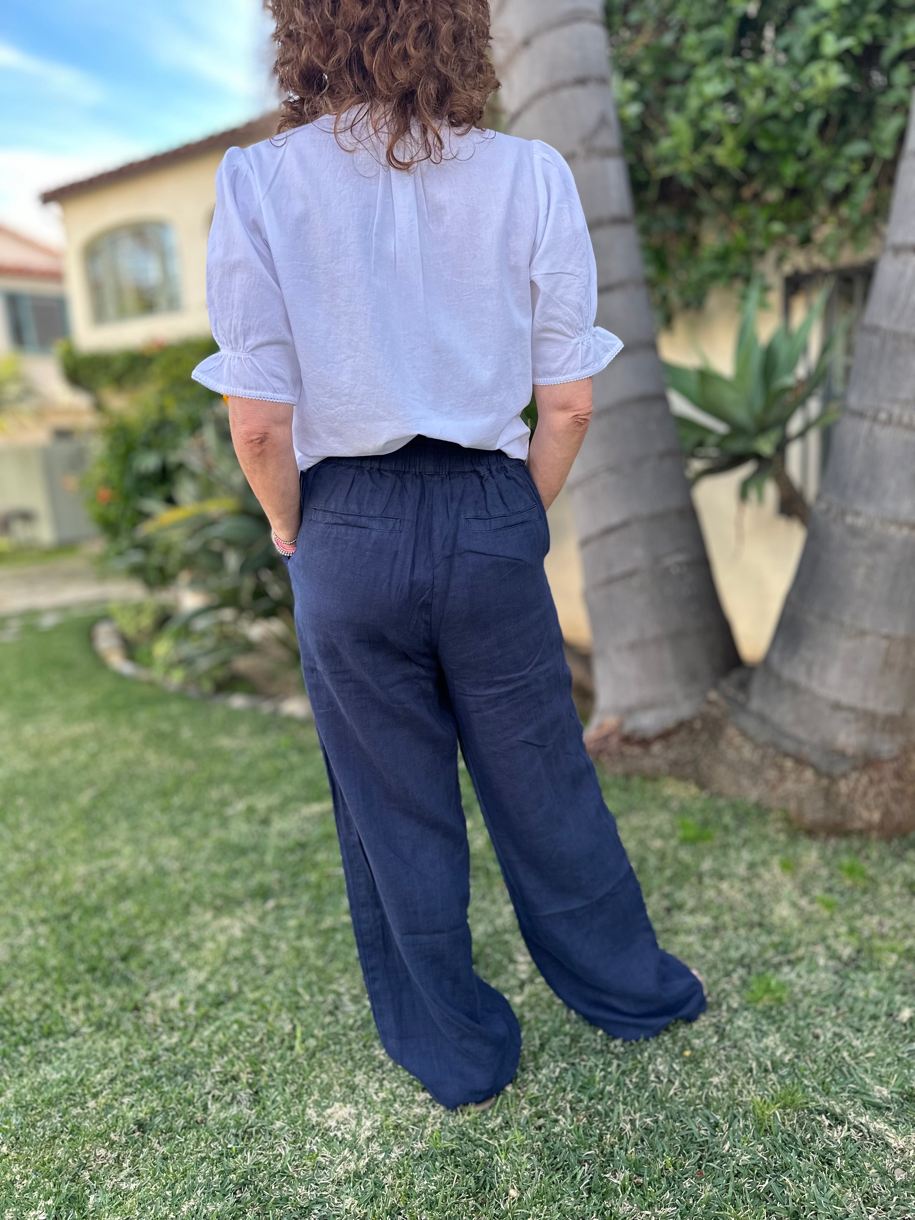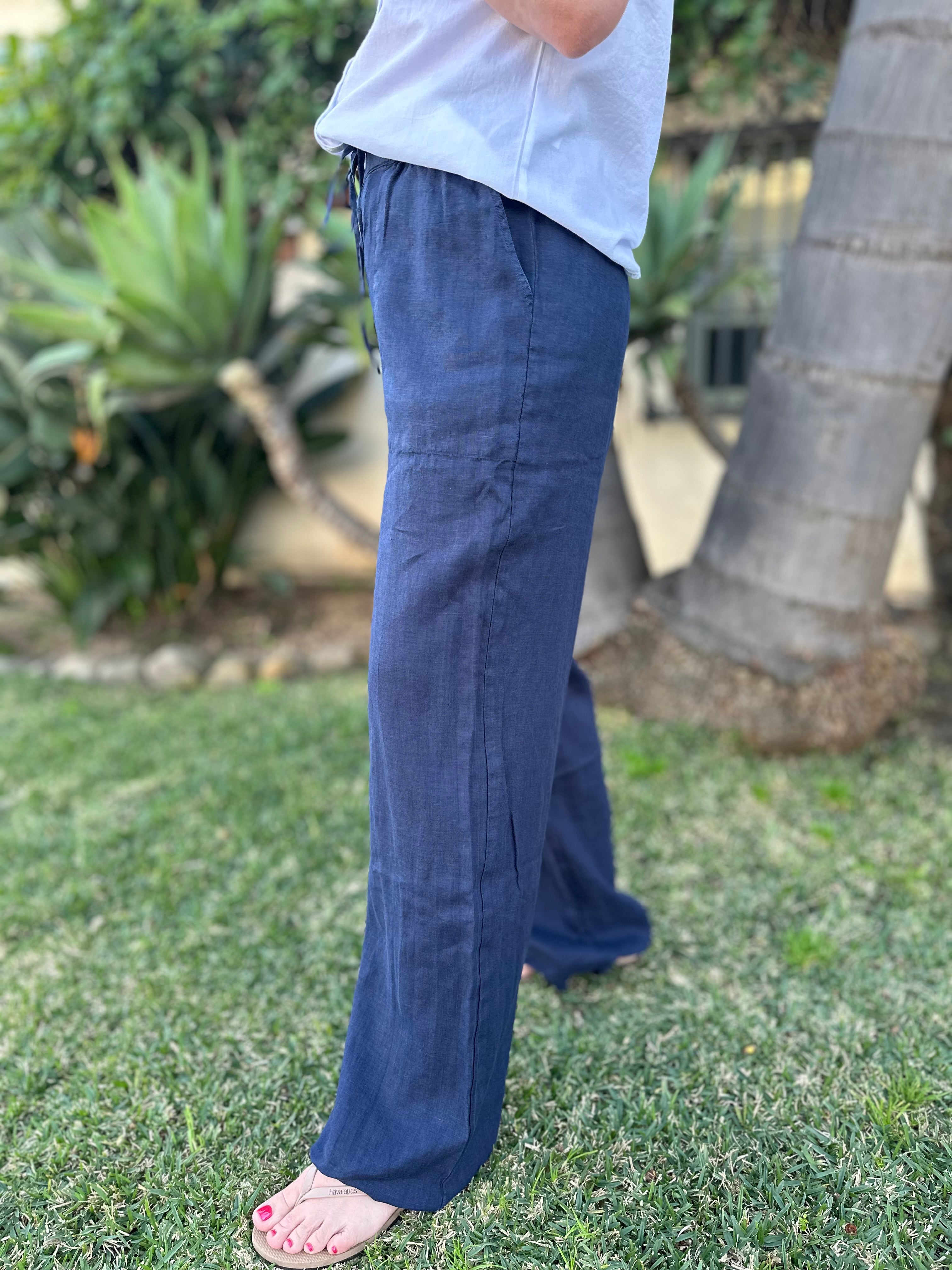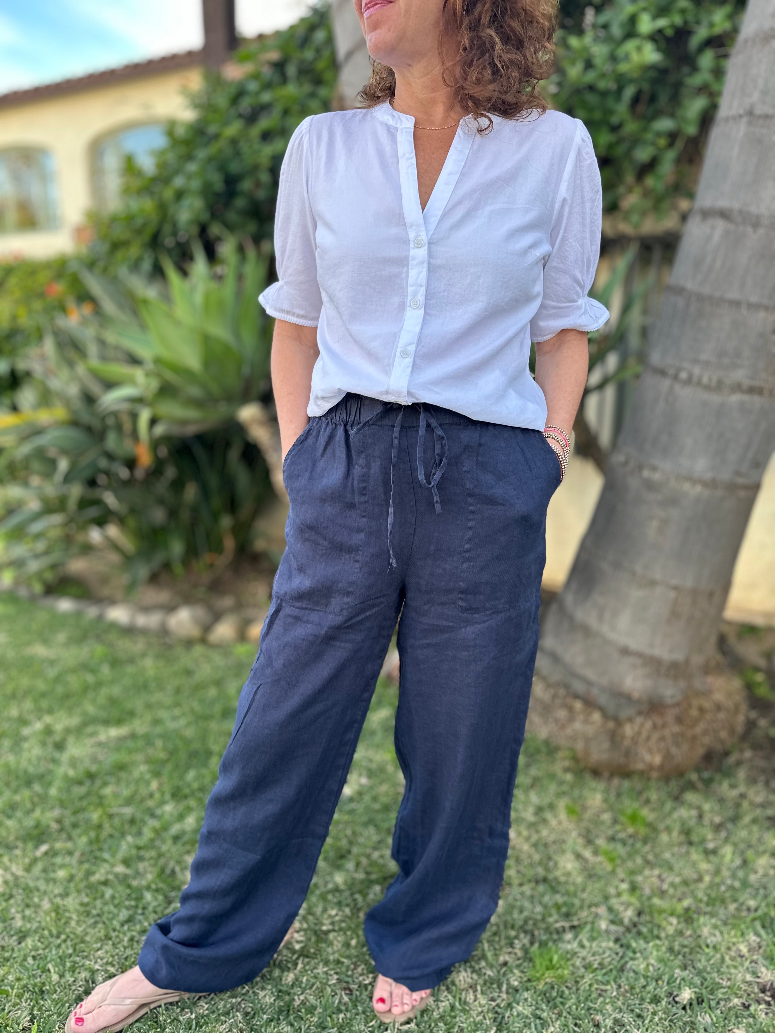 The linen pants you'll want to live in. Jules has a high rise with a relaxed wide leg silhouette and an adjustable tie waist with flirty ruffle details. Made from 100% biodegradable linen that is lightweight and breathable.