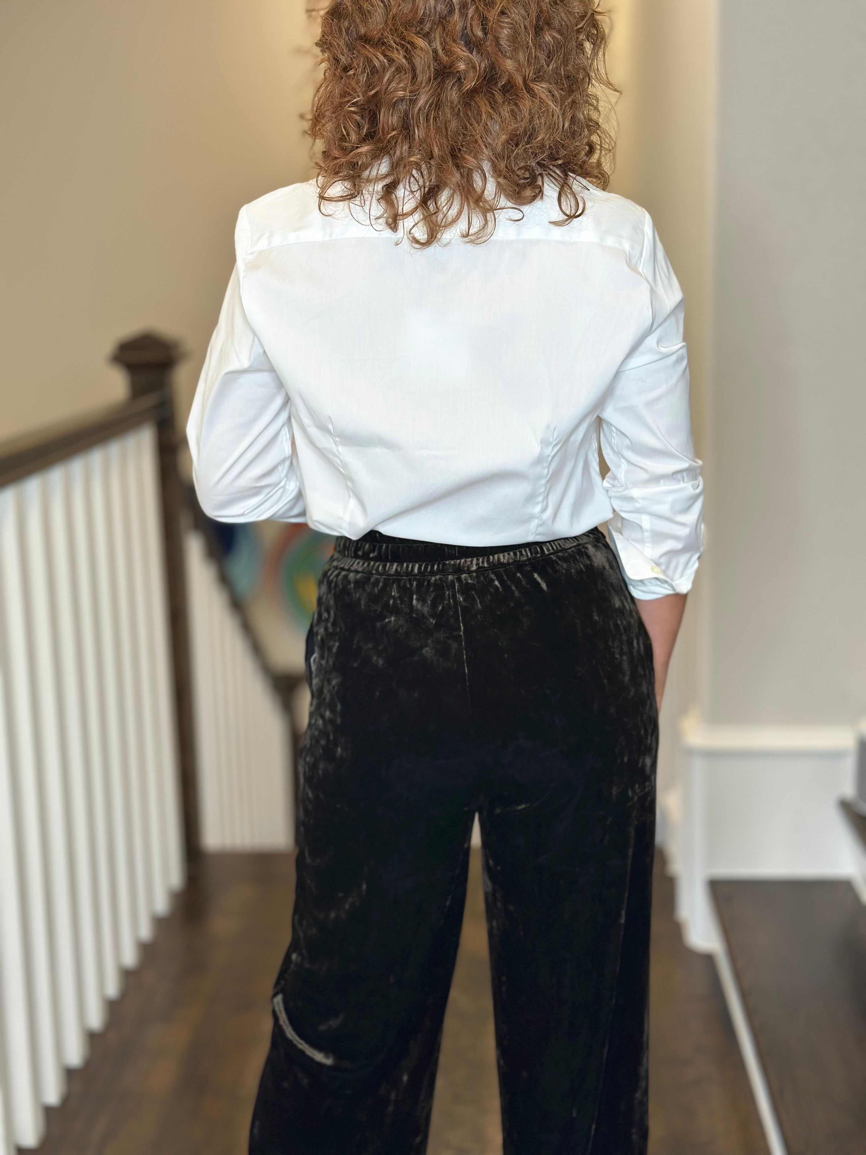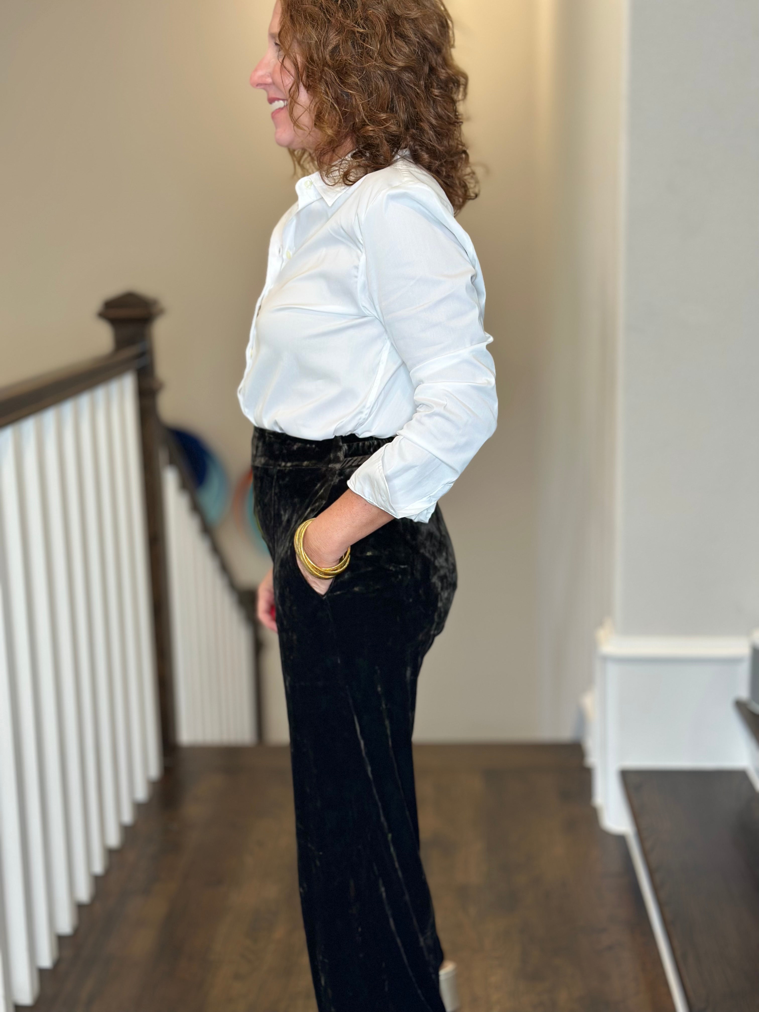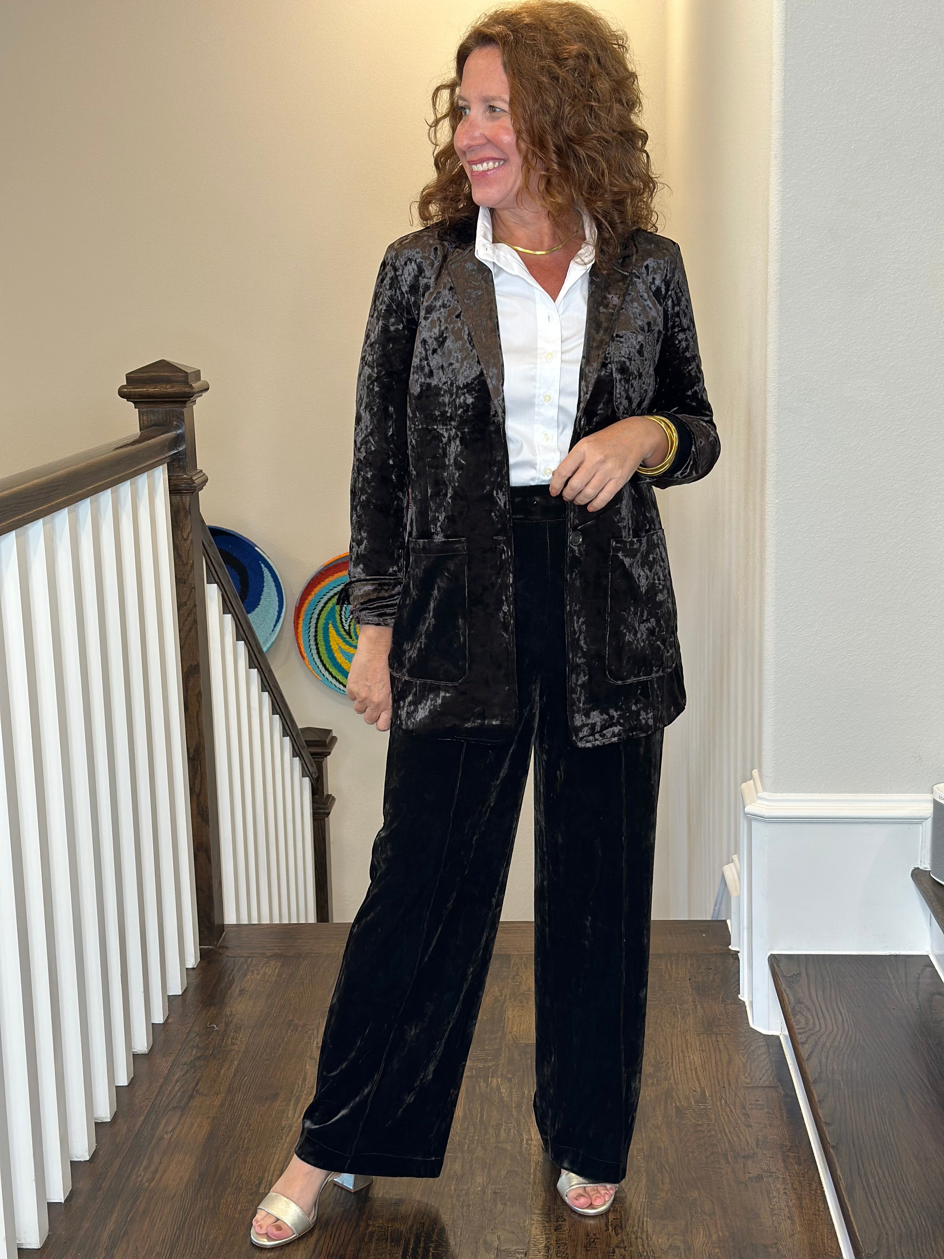 The Shay Crushed Velvet Pant – a holiday season wardrobe staple – is fashioned from 4-way stretch Garment Dyed Crushed Velvet for softness, drape and a slight sheen. Showcasing an elasticated waist, side pockets and front pin tucks, these wide-legged velvet pants are as comfortable as sweats, but perfect for holiday events and gatherings. Pull them on with her matching blazer, a sweater, or tucked satin blouse.