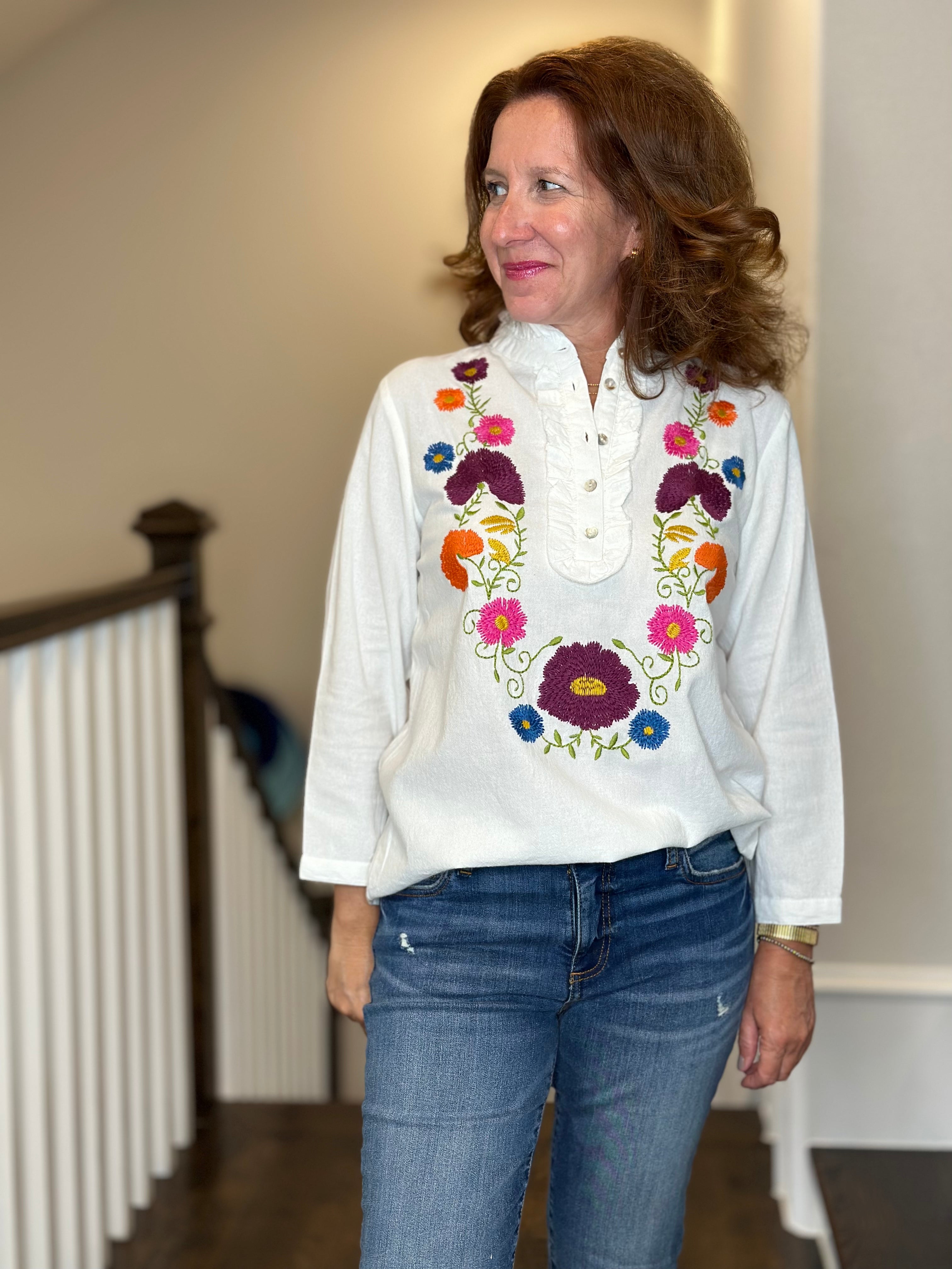 A vintage inspired 3/4 sleeve, half button up in cream with beautiful contrasting floral embroidery. Hits at hip for great coverage.