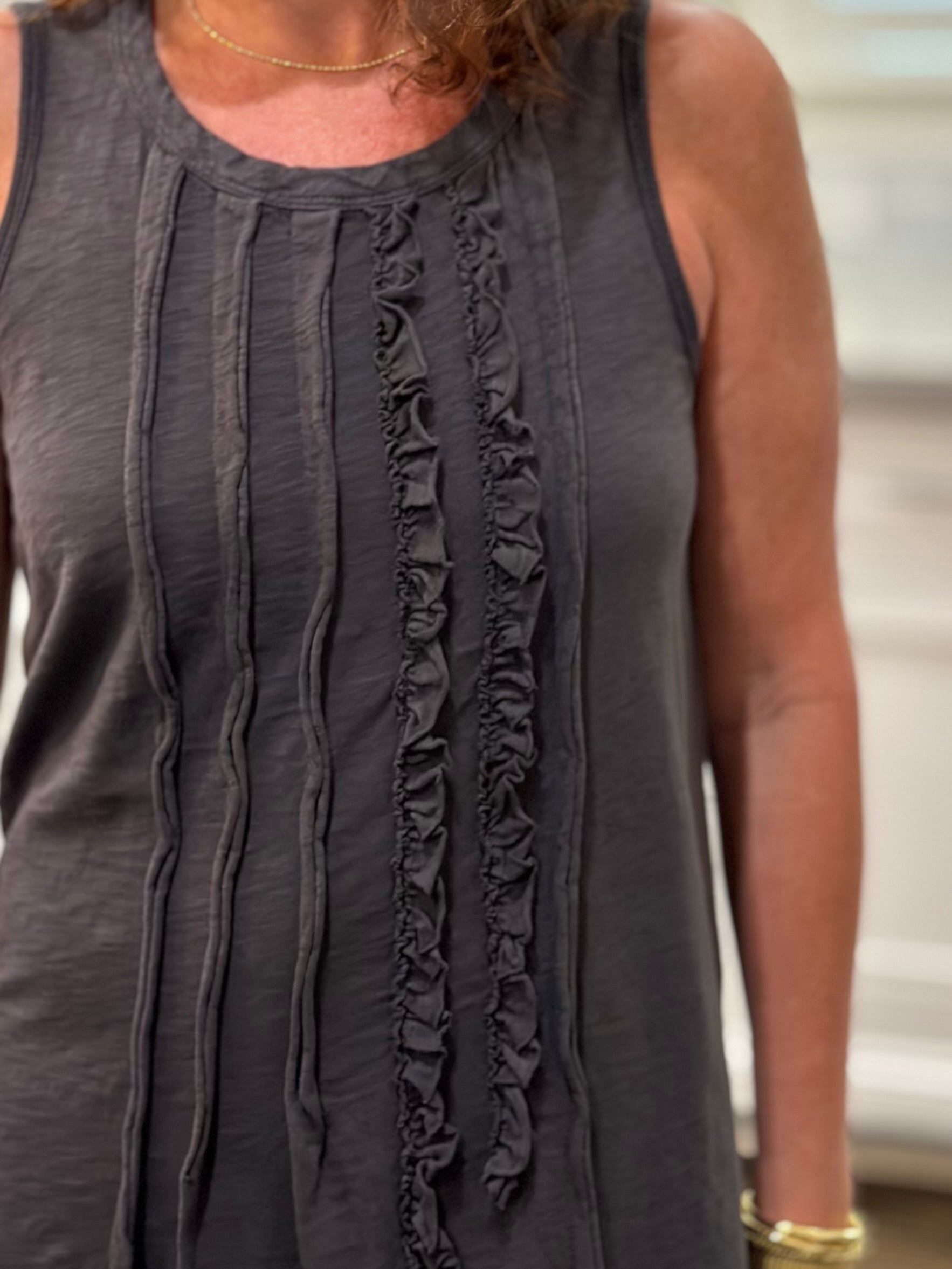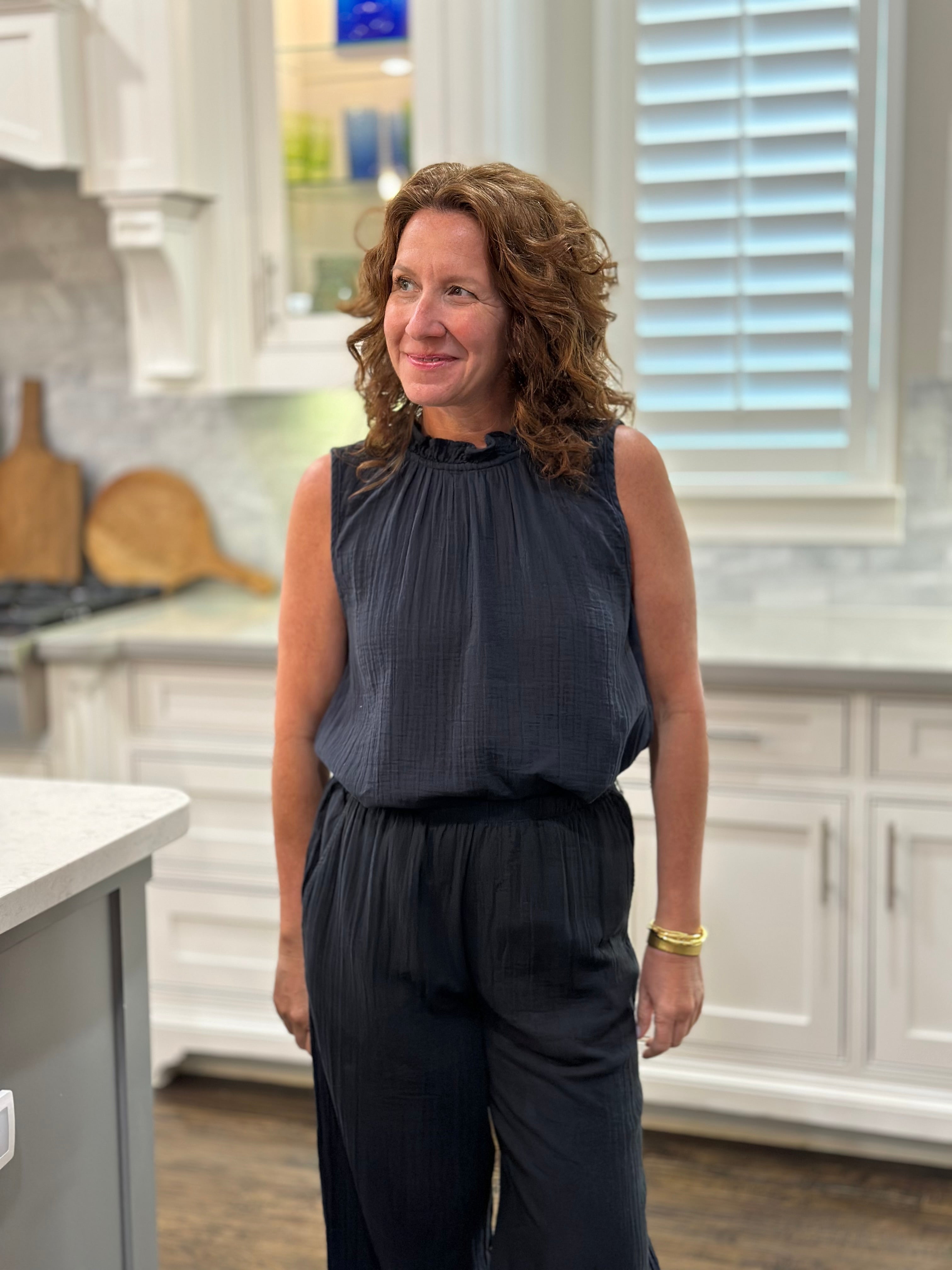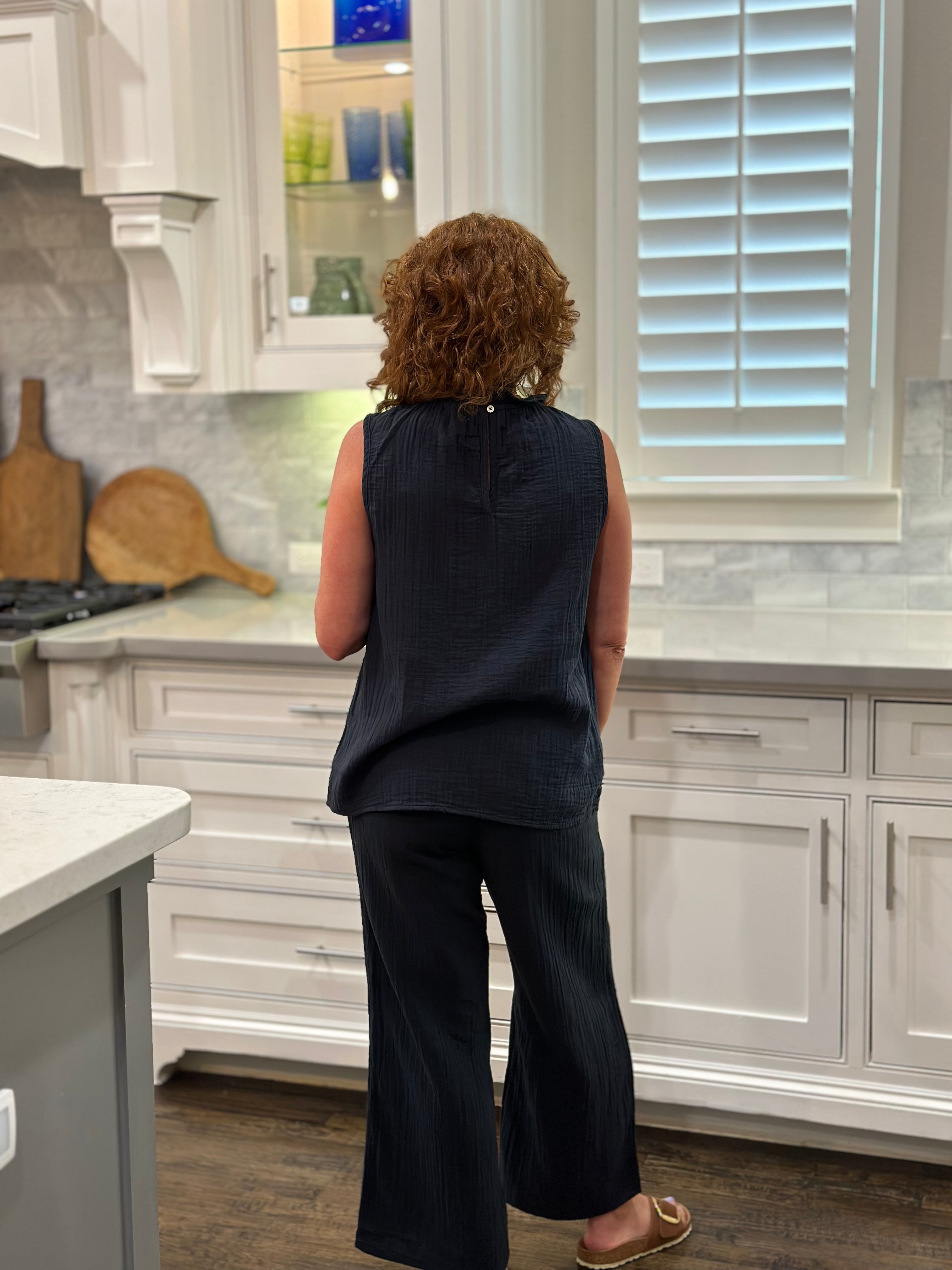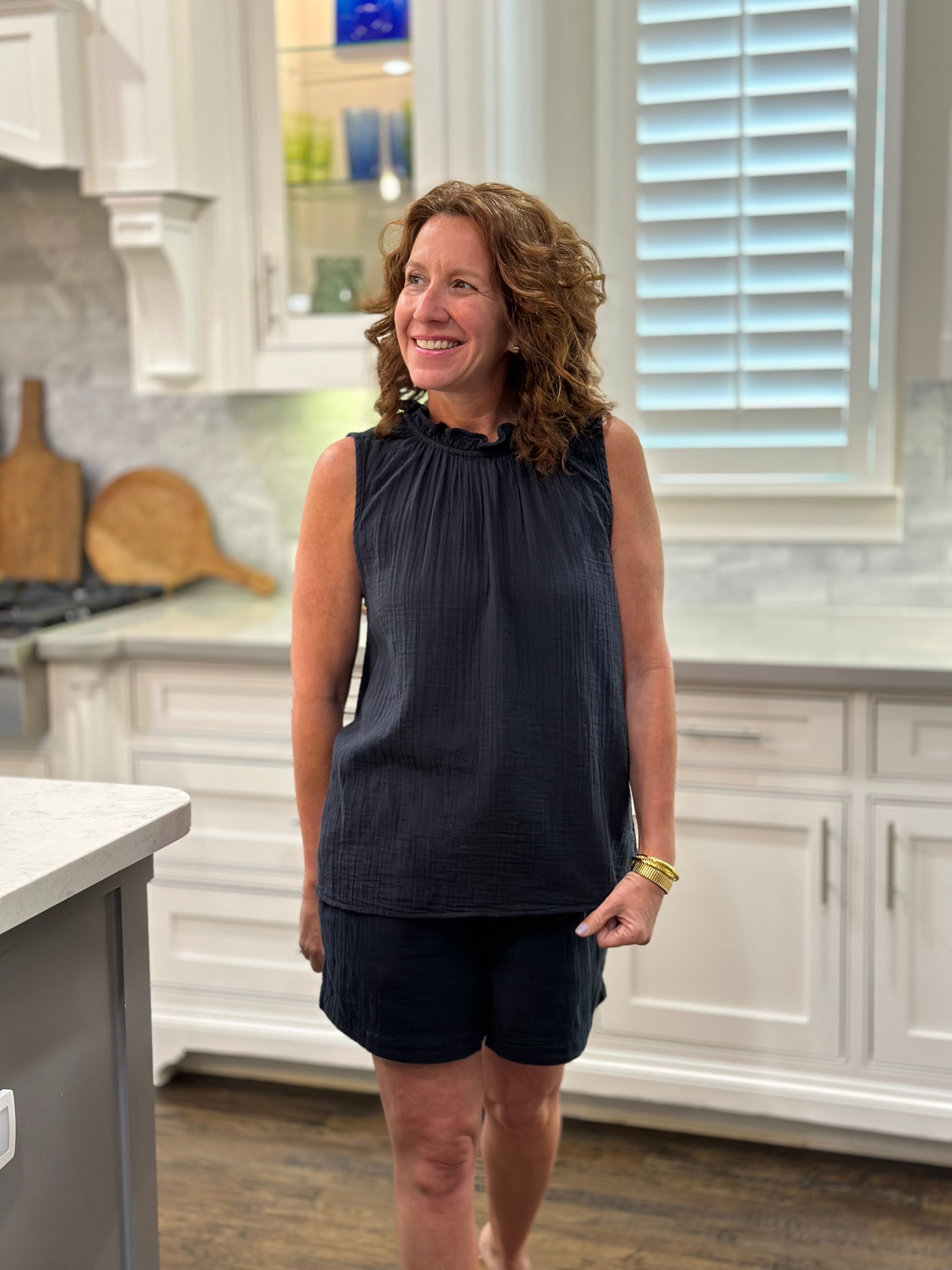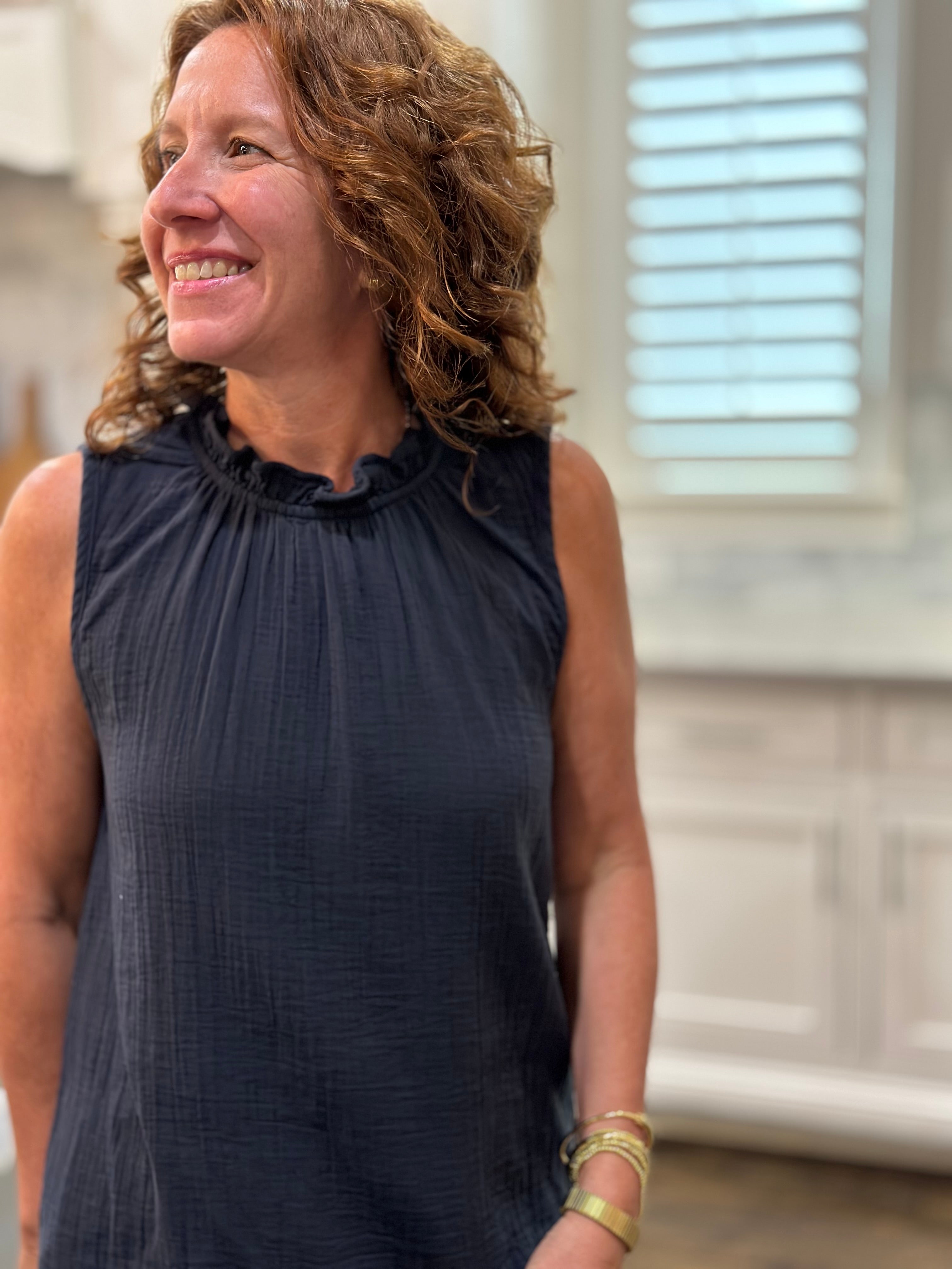 Dylan Gauze Ruffle Neck Sleeveless Top in Soft Black