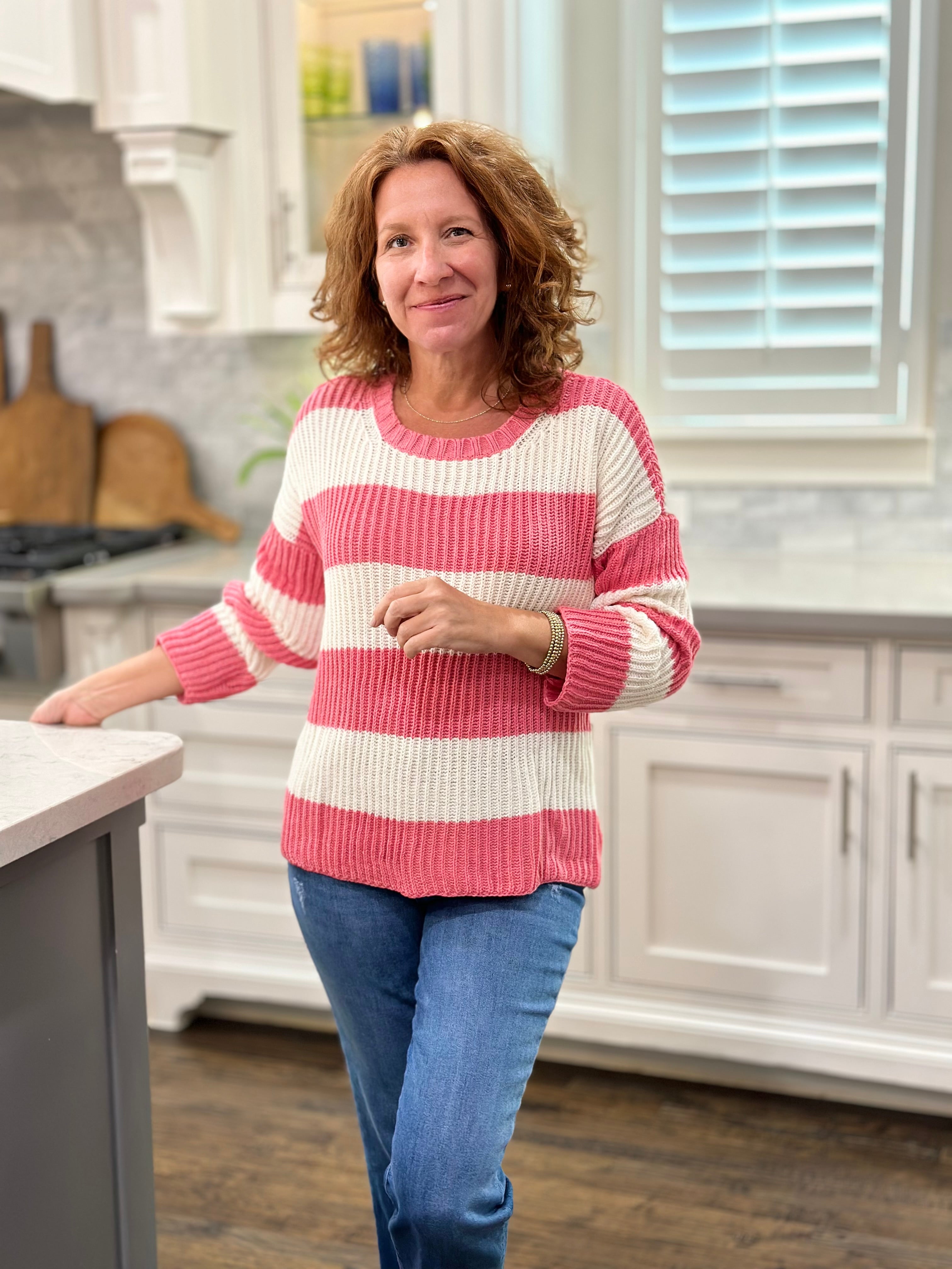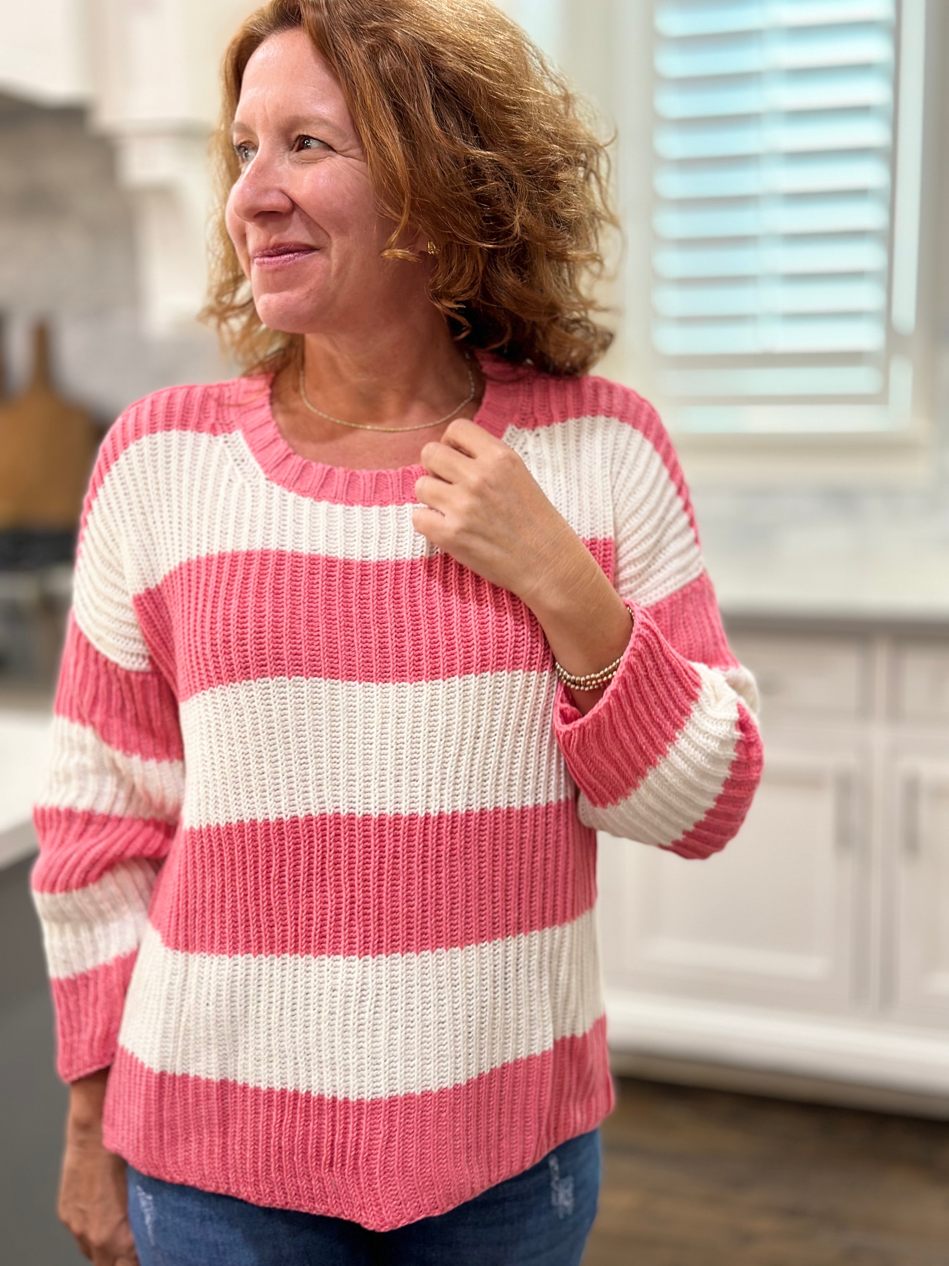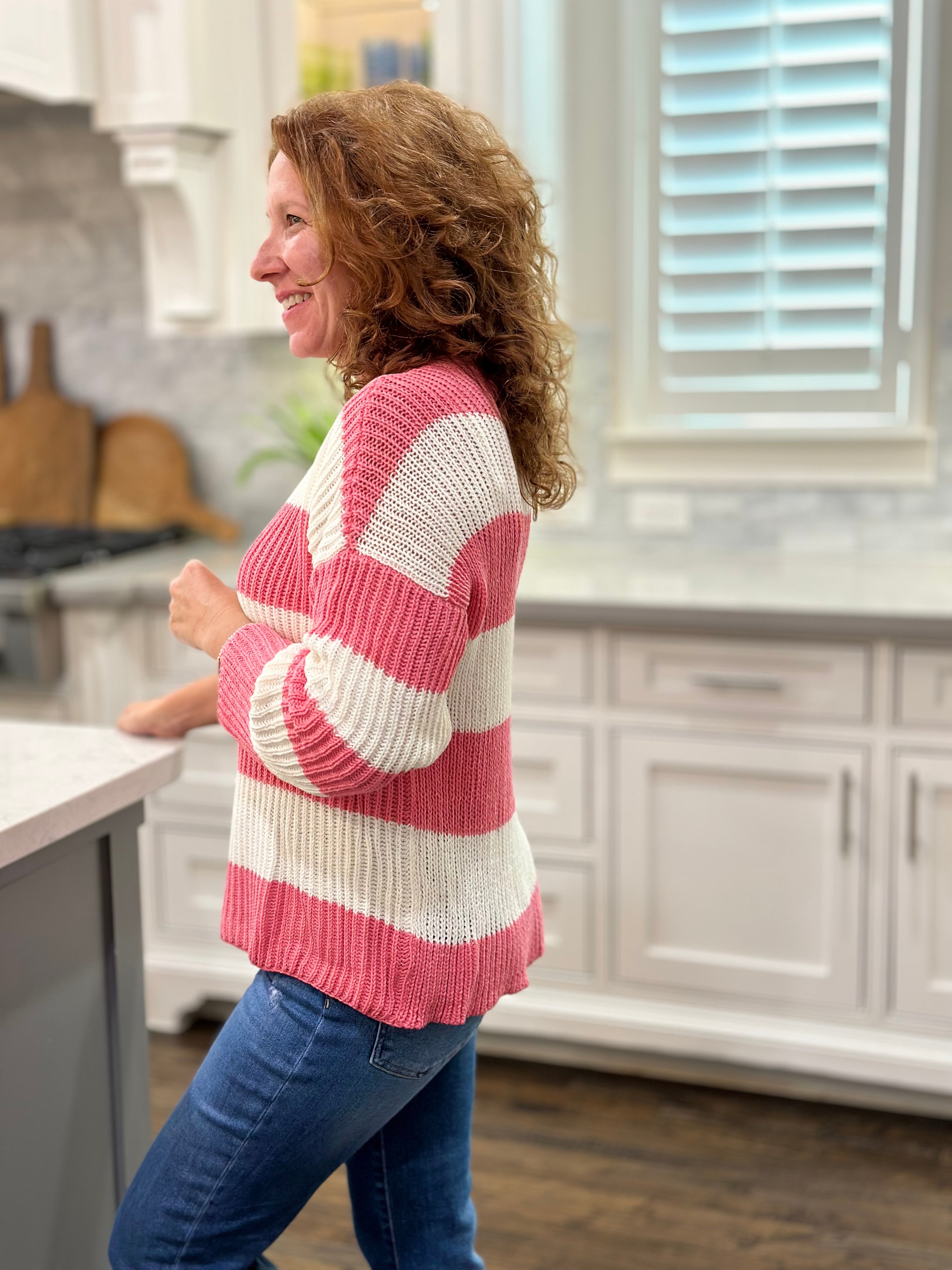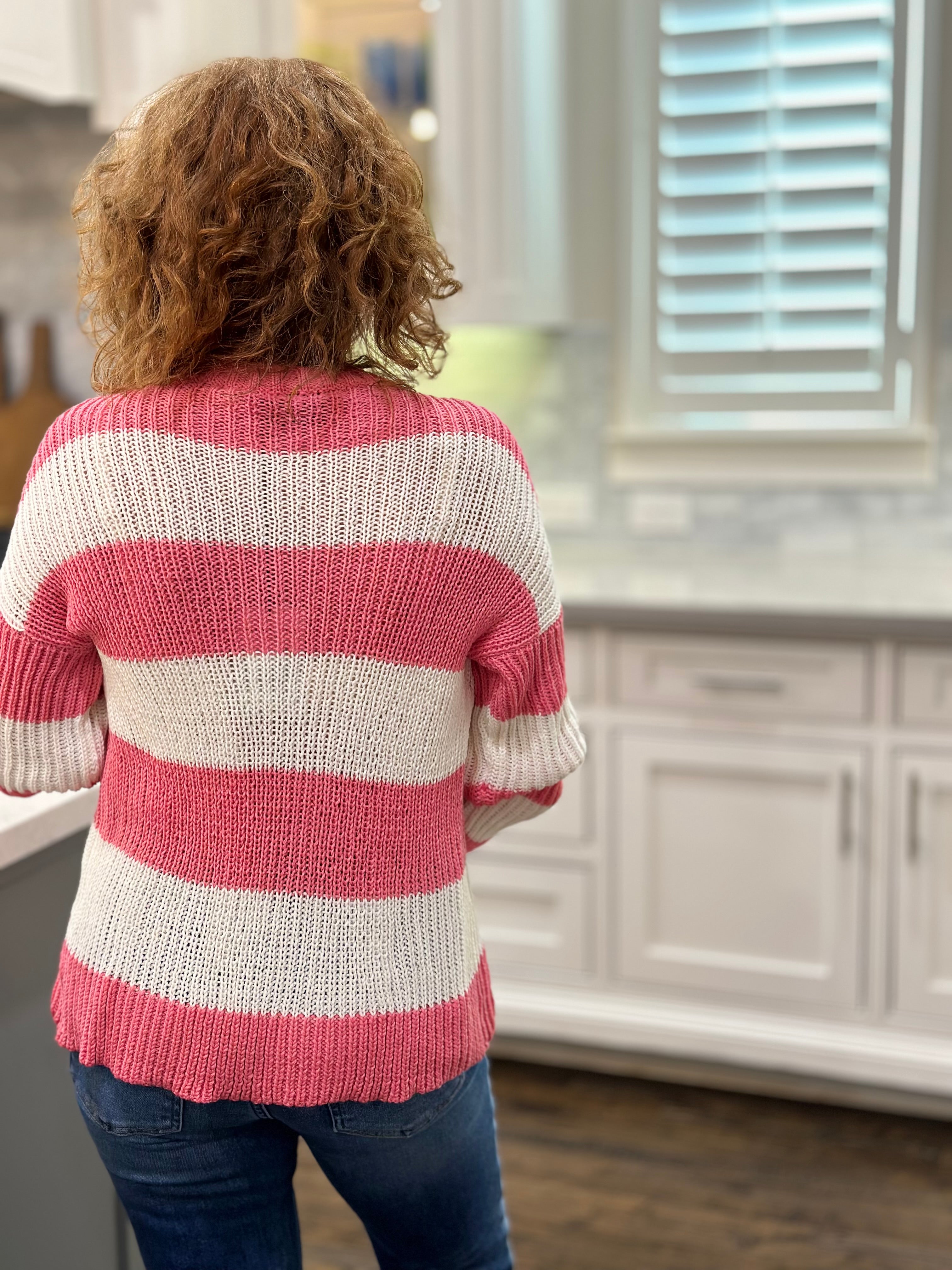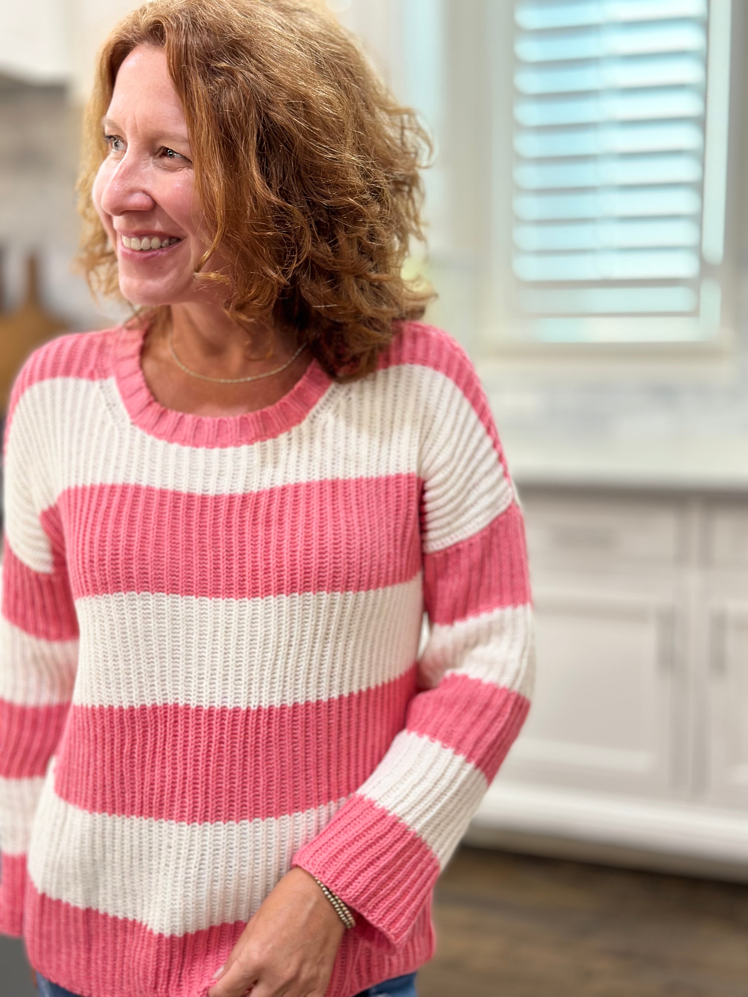Wooden Ships Foster Striped Crew Cotton in Fierce Pink & Breaker White