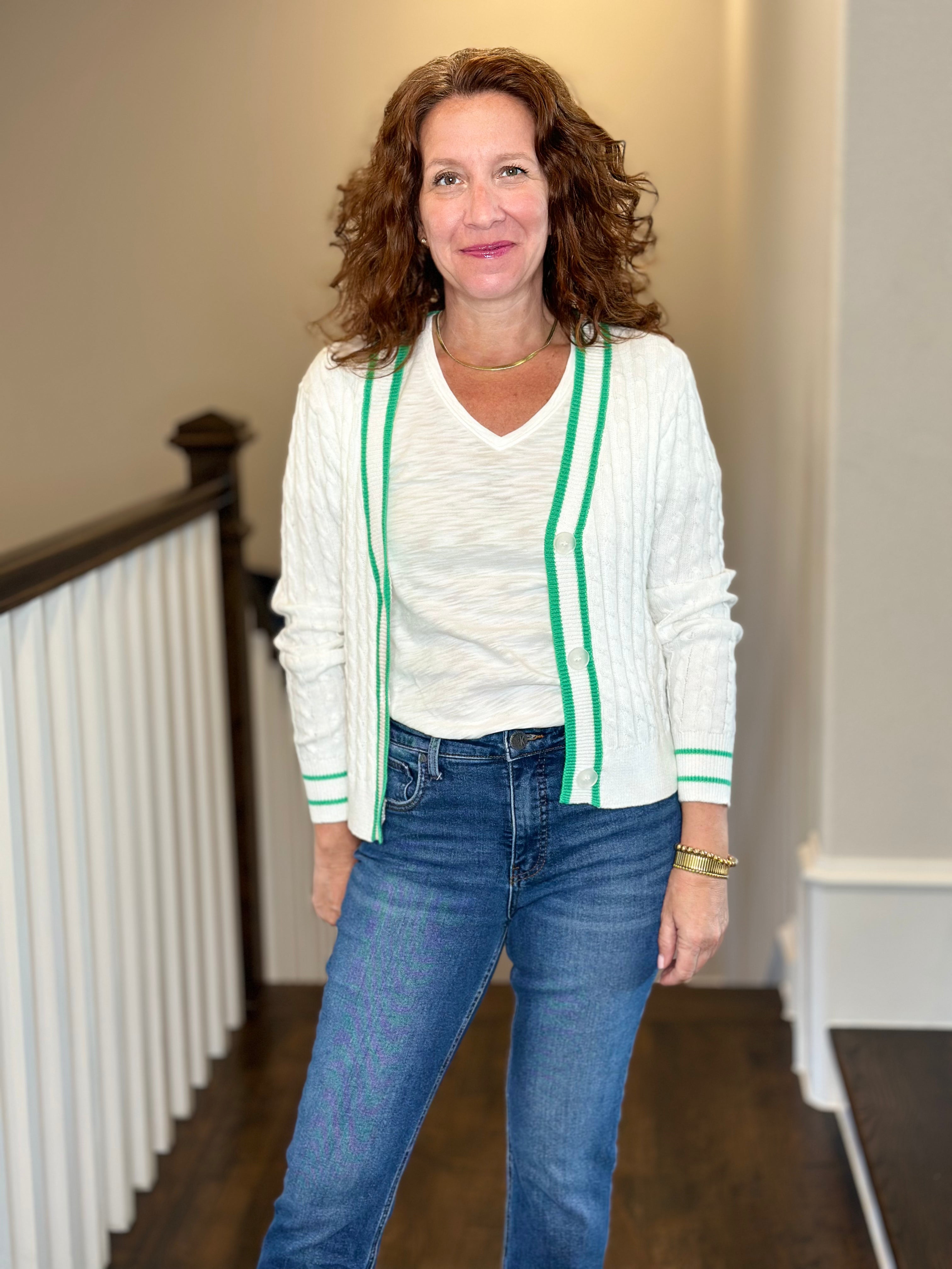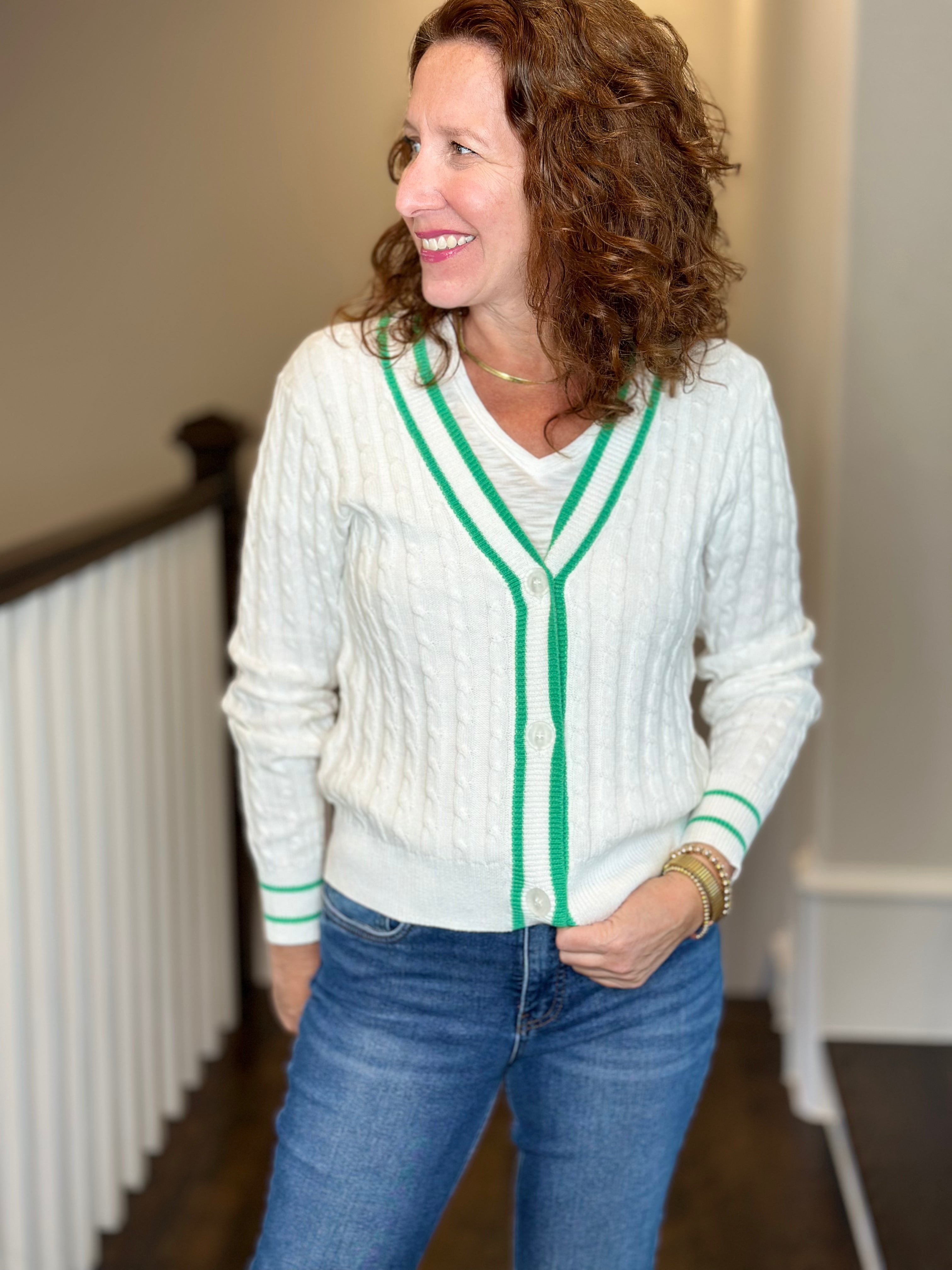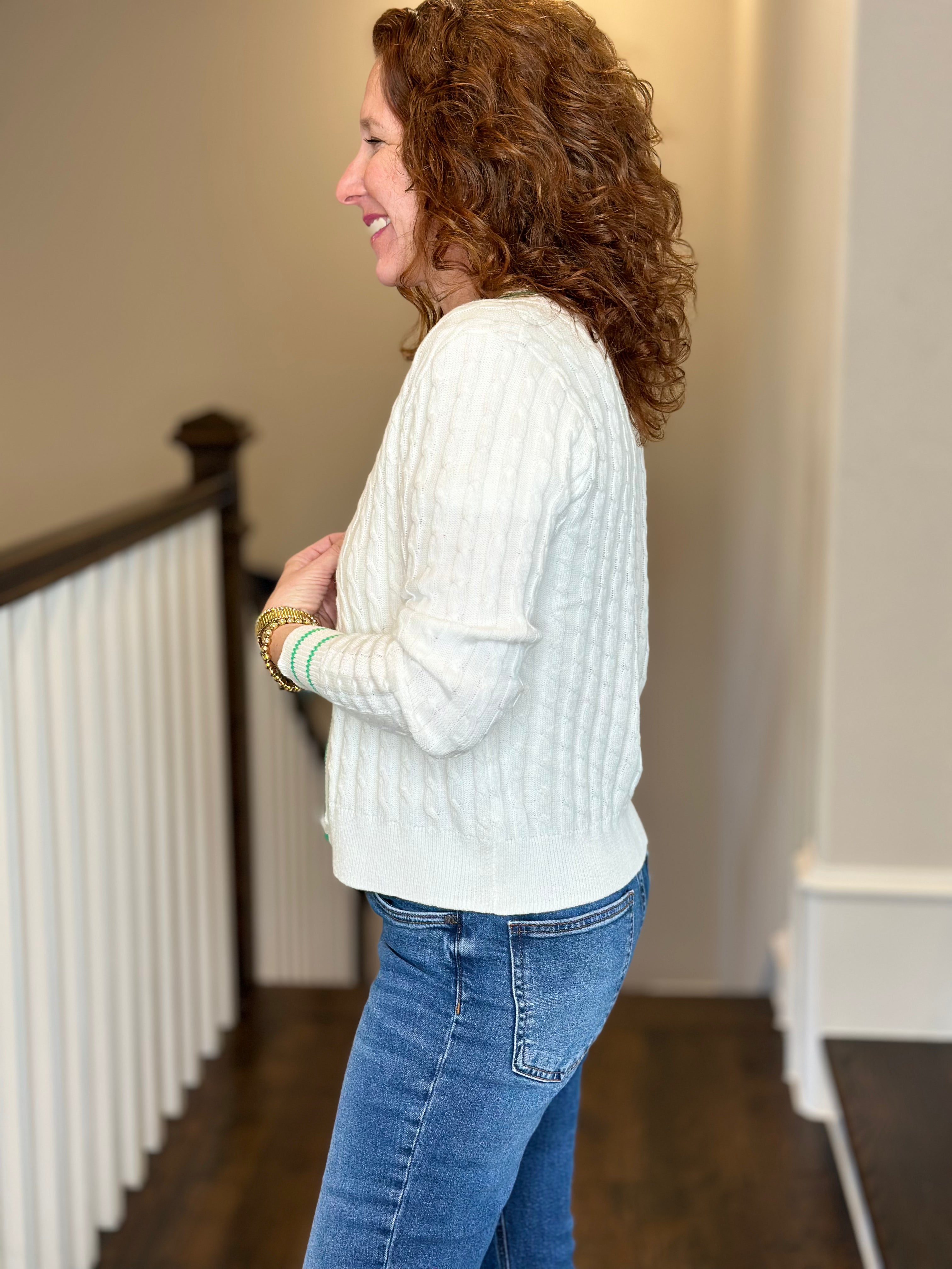 J Society Cable Varsity Cardi in White/Clover