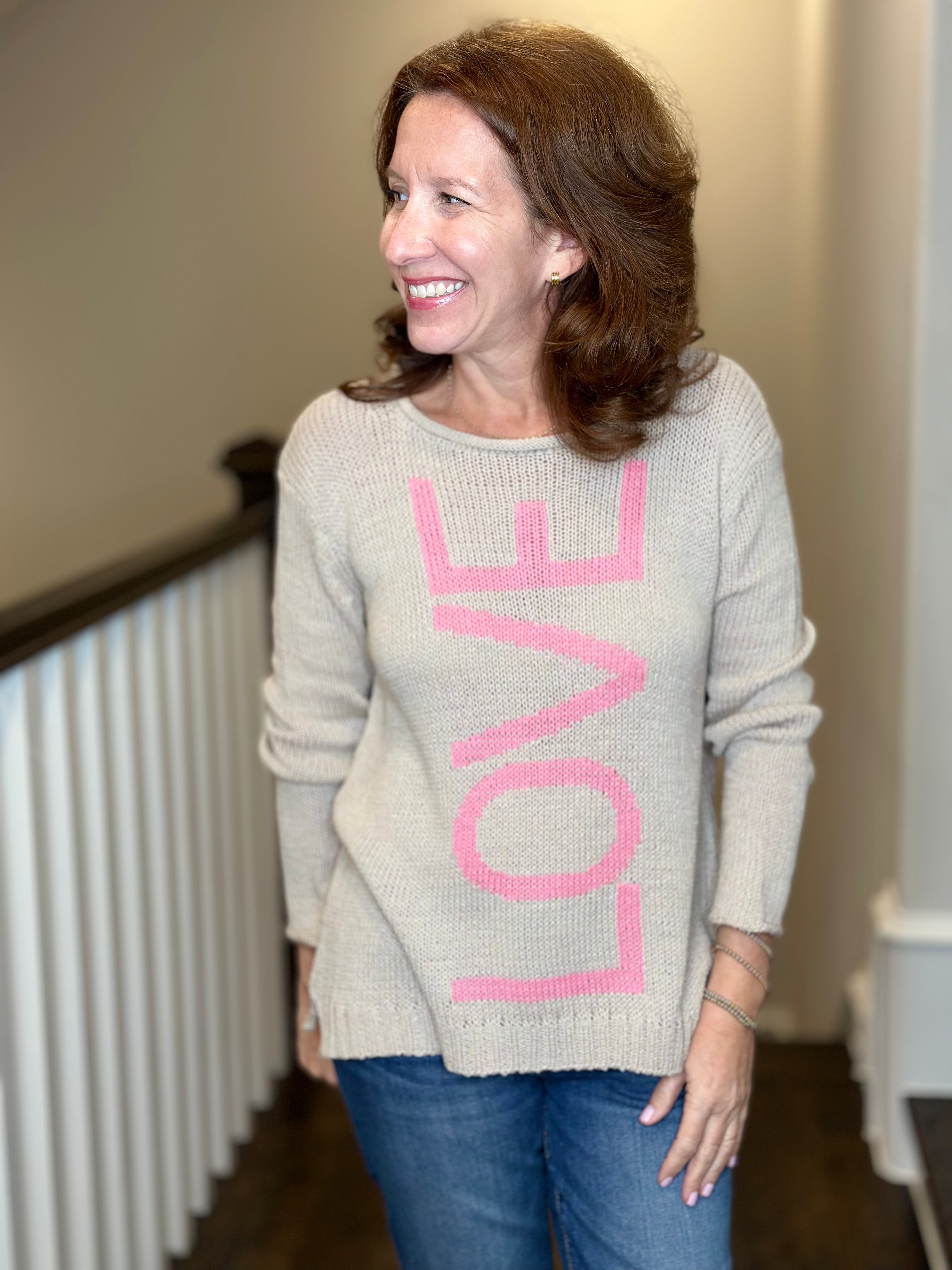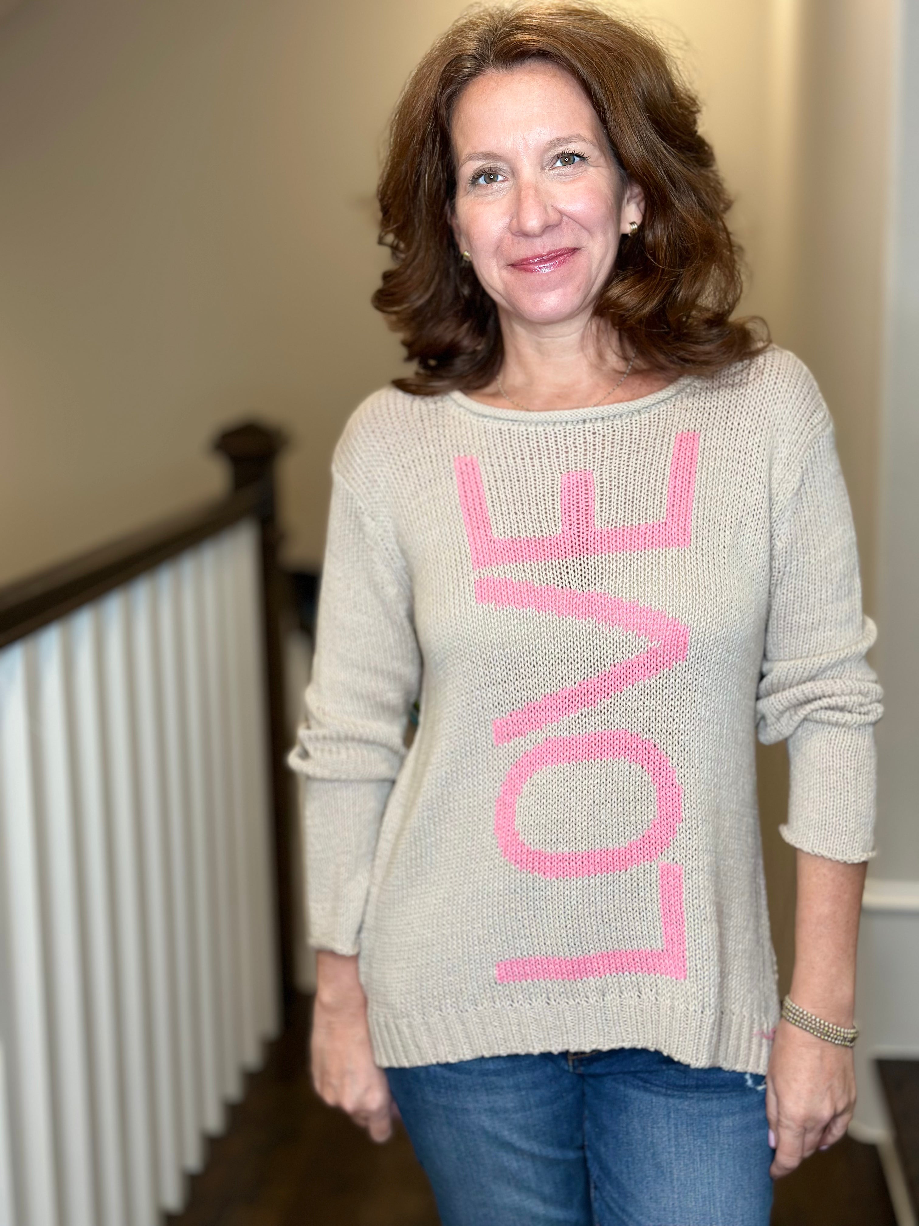 Wooden Ships LOVE Crew Cotton Sweater in Khaki/Pretty Pink