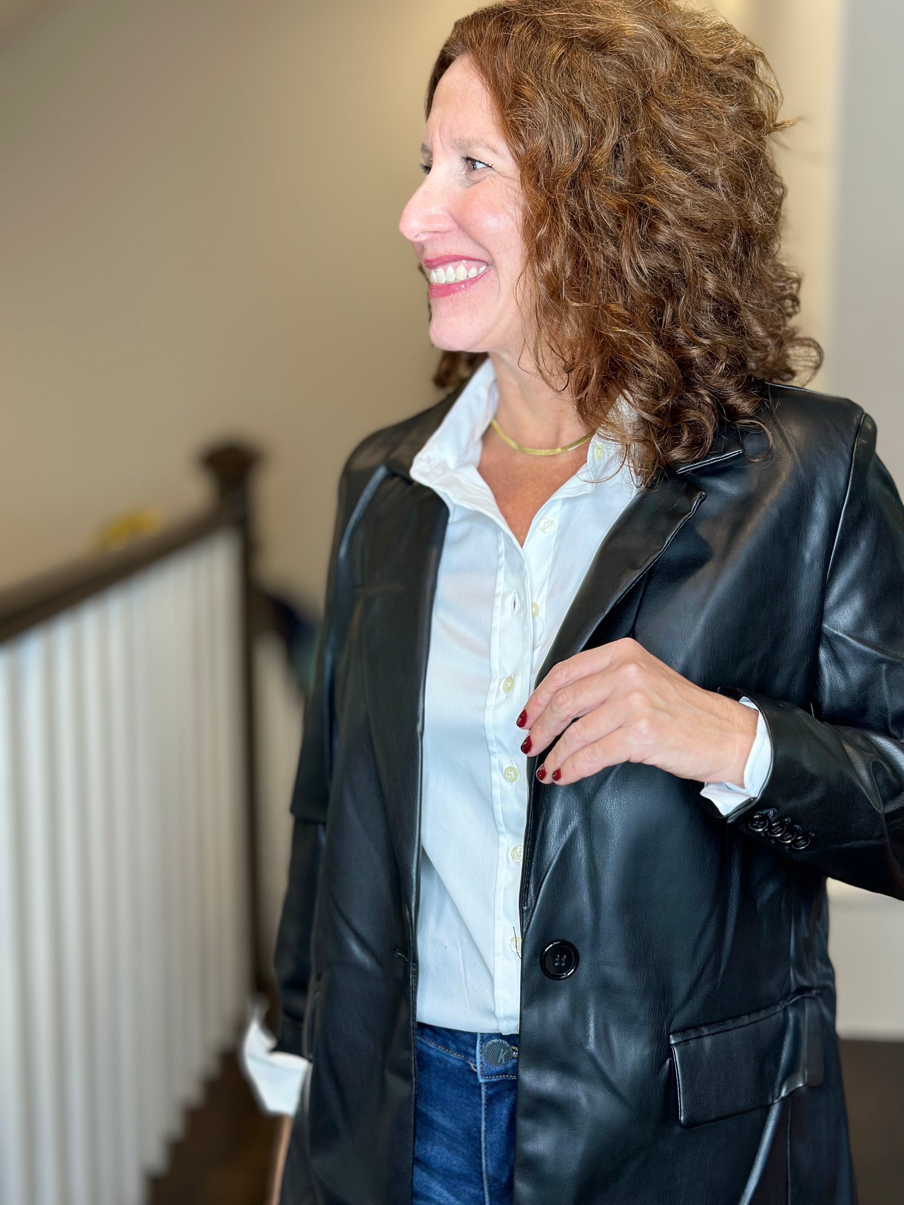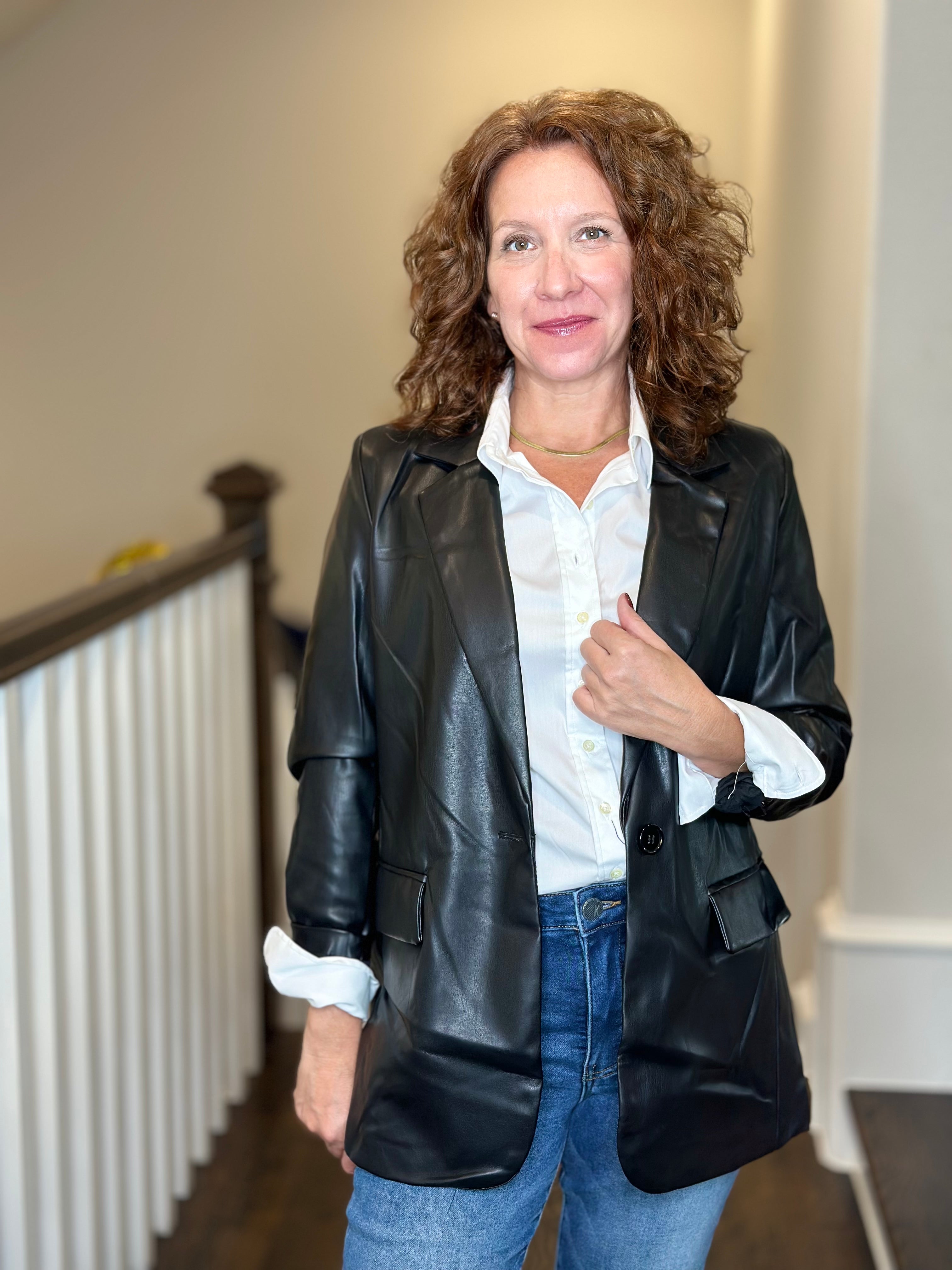 O A T New York Slim Boyfriend Blazer in Black Vegan Leather