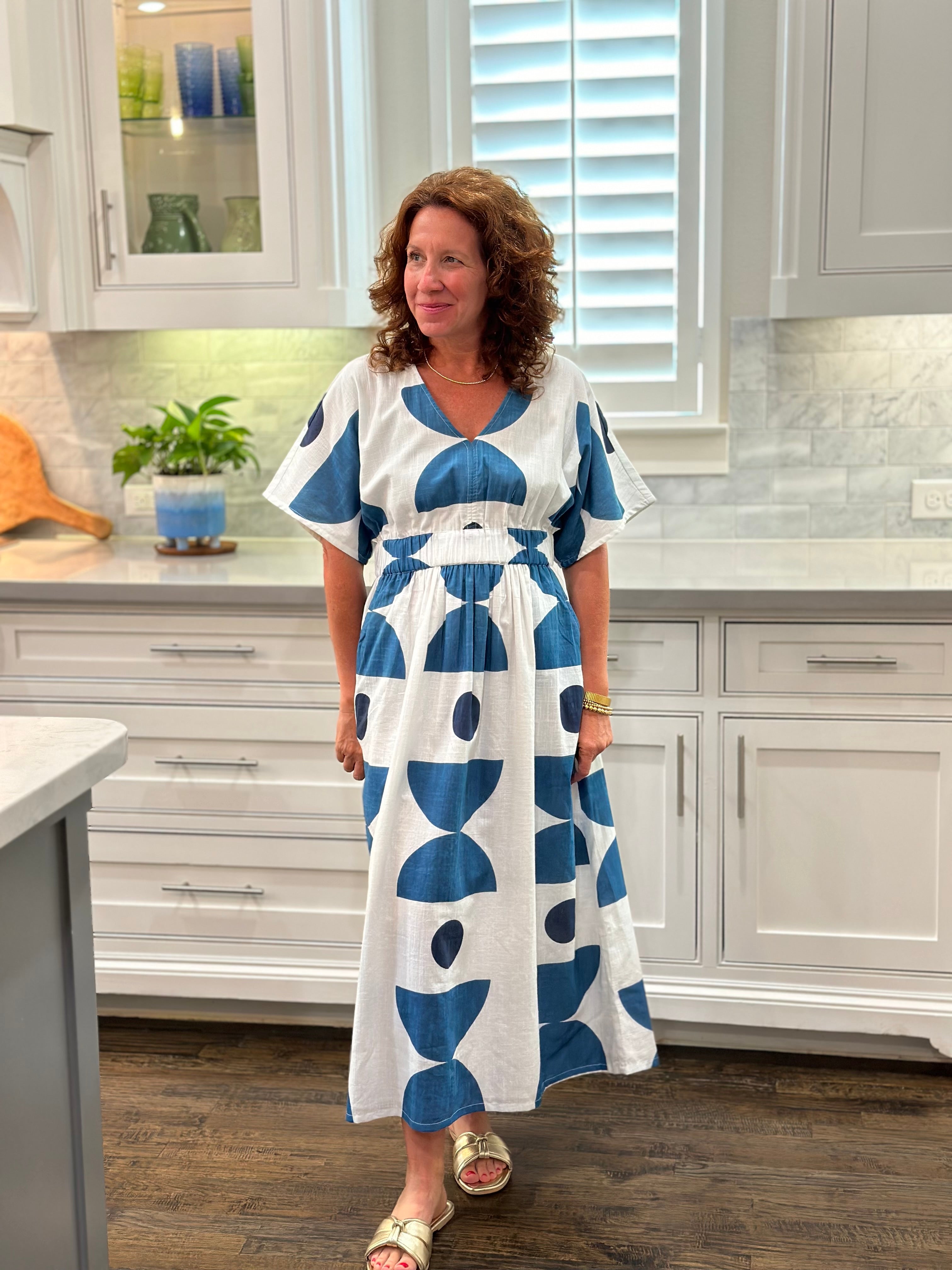 A feminine silhouette and fun vintage style fabric makes this dress a great piece for all your warm weather activities. A V neck, empire waist, cap sleeves and loose body make this cut so flattering and comfortable. And we can't forget that it has pockets! Fully lined.