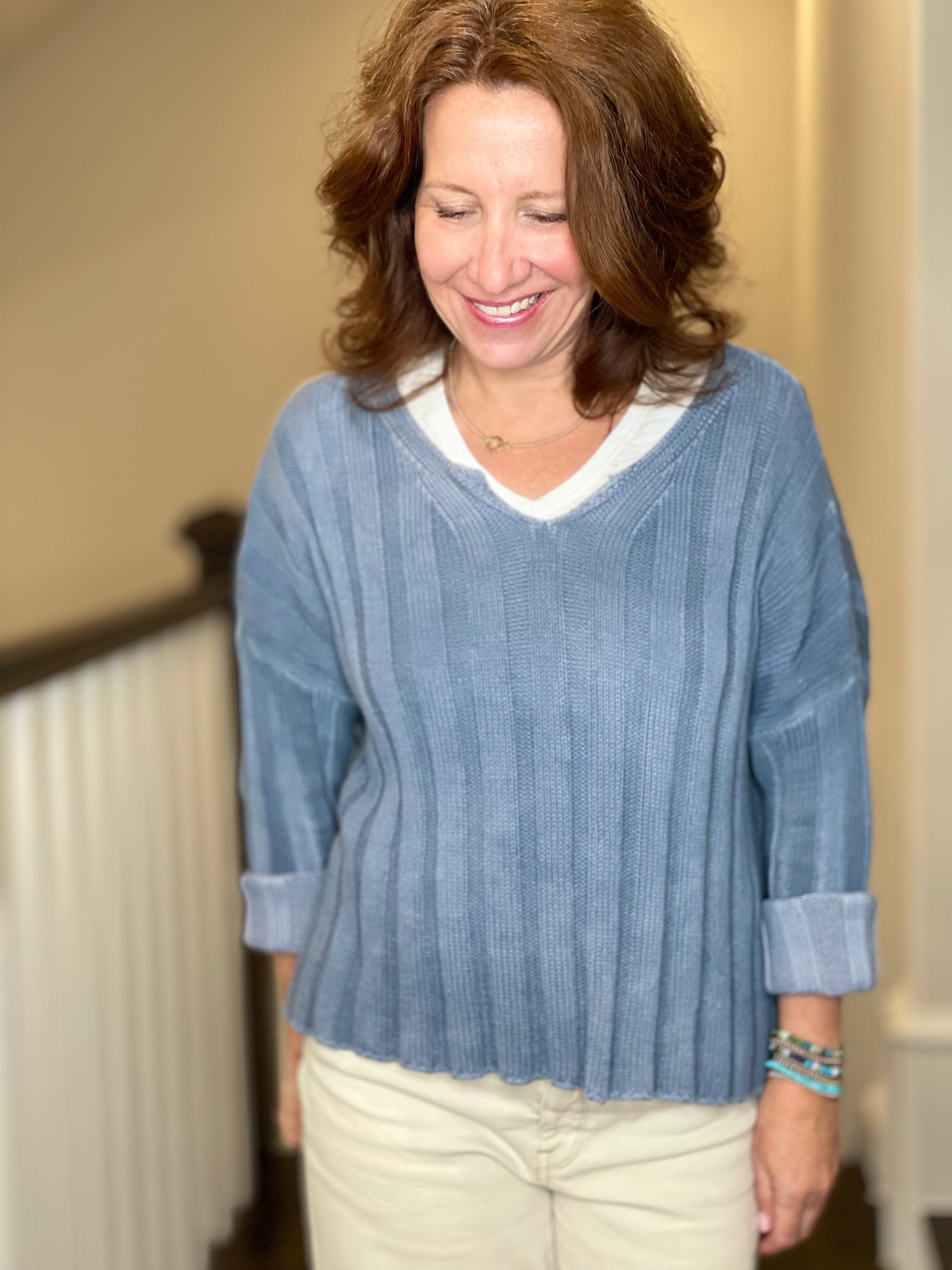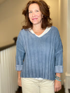 Level up your sweater style with this distressed chunky ribbed knitted pullover v-neck sweater. Easily worn from day to evening. Oversized fit for a relaxed and fashionable style.