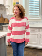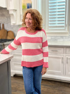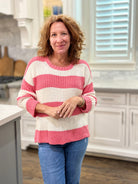 Wooden Ships Foster Striped Crew Cotton in Fierce Pink & Breaker White