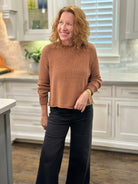 Cropped, stylish and modern. This relaxed fit style is knit with a luxurious and lightweight cotton blend yarn. The classic crewneck and ribbed knit texture create a laid-back, effortless look.