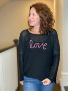 Oh-so-soft and super comfy, this sweater features a flattering, relaxed fit and open neckline. Details include LOVE embroidery, rolled neck, sleeve and bottom hem. Super versatile, this top pairs beautifully over all bottoms.