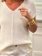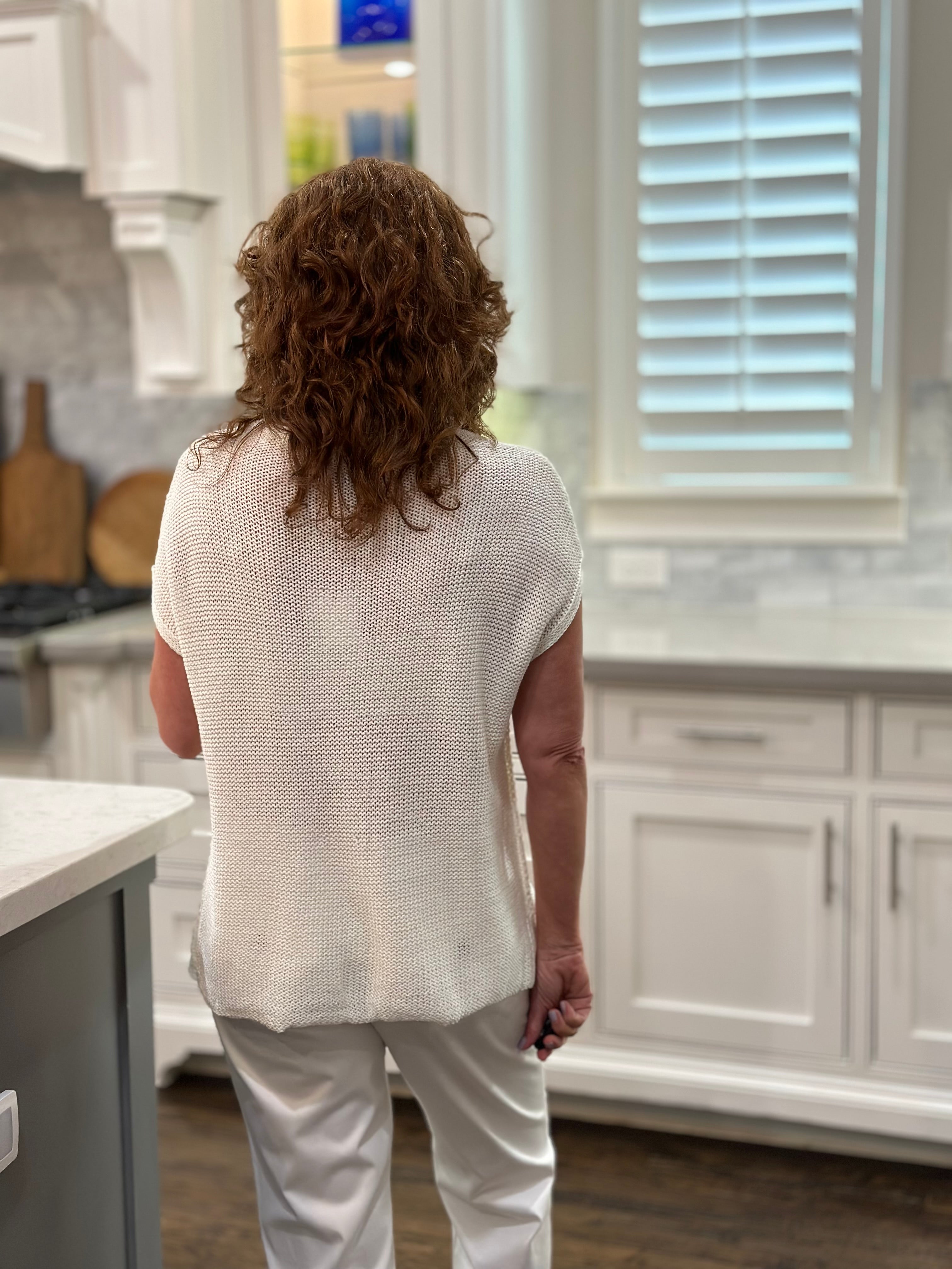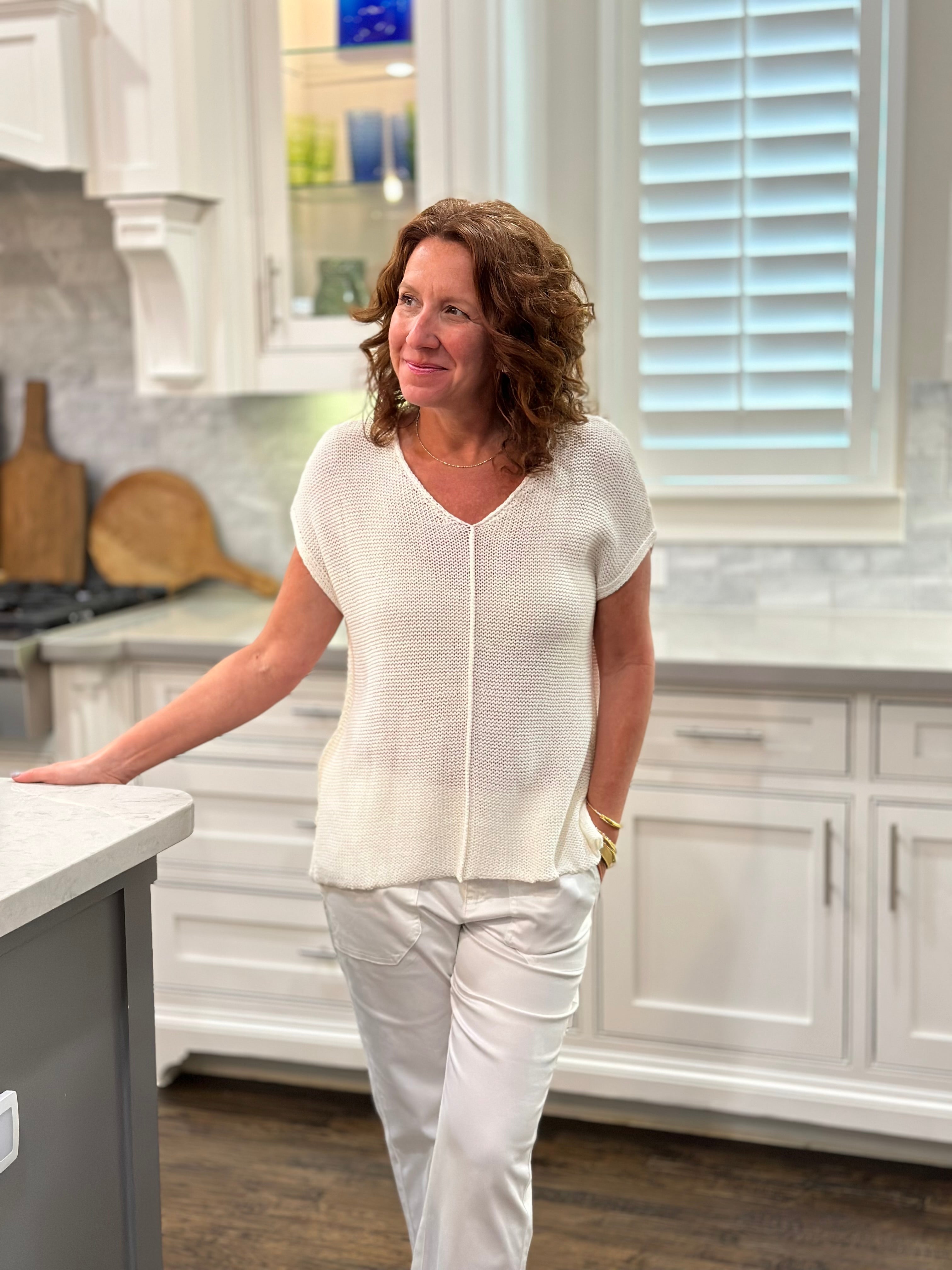 Oh-so-soft and super comfy, this sweater features a flattering relaxed fit and v neckline. Details include front seam, rolled neck, ribbed cap sleeve and split bottom hem. Super versatile, this top pairs beautifully over all bottoms.