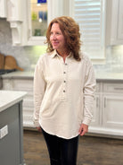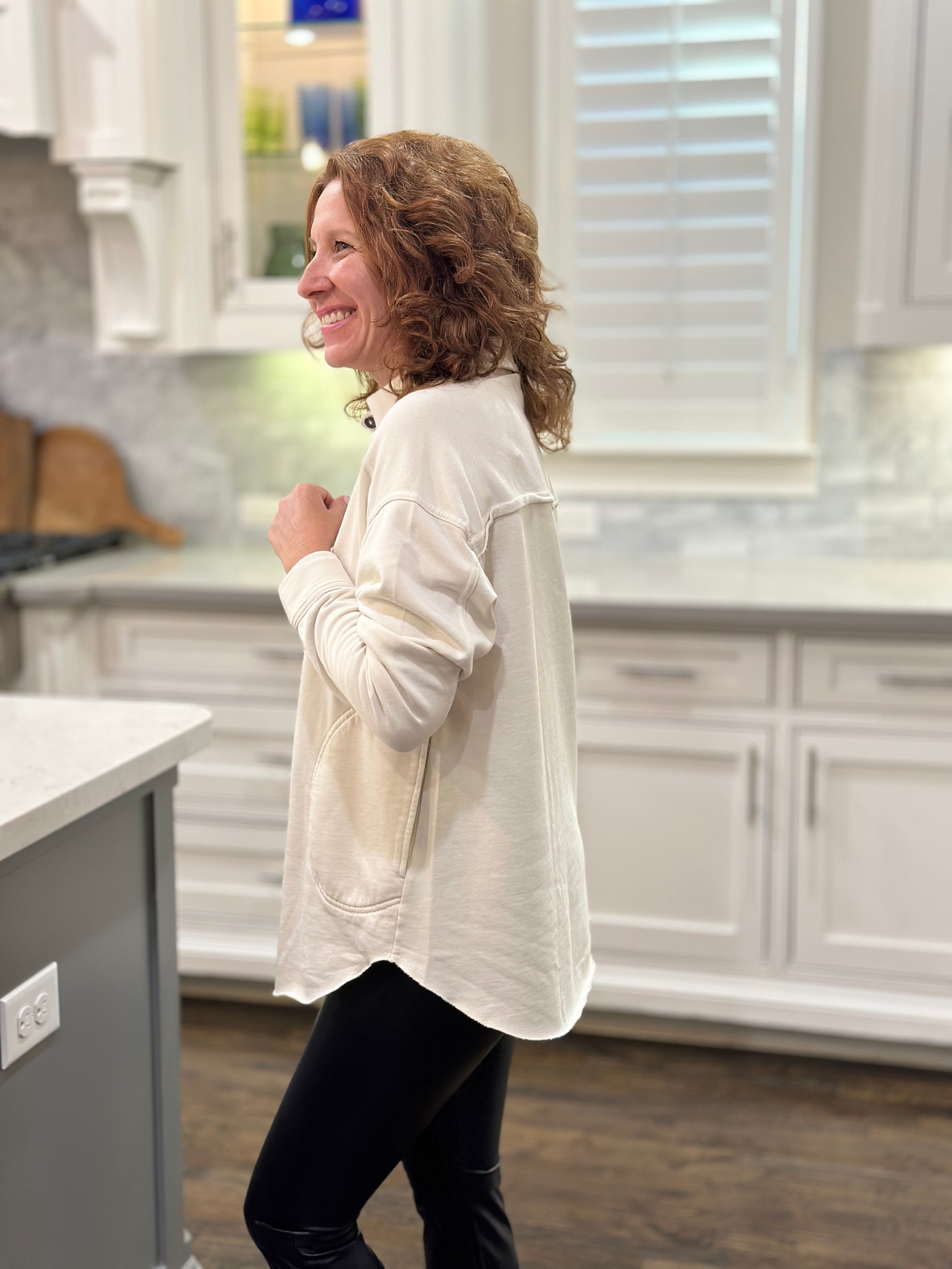 The oh so soft Heritage Pull Over is lightweight, has a slight drop sleeve, 3/4 button down, and raw-cut hem that is slightly longer to add length for coverage. Perfect for wearing over those leggings!