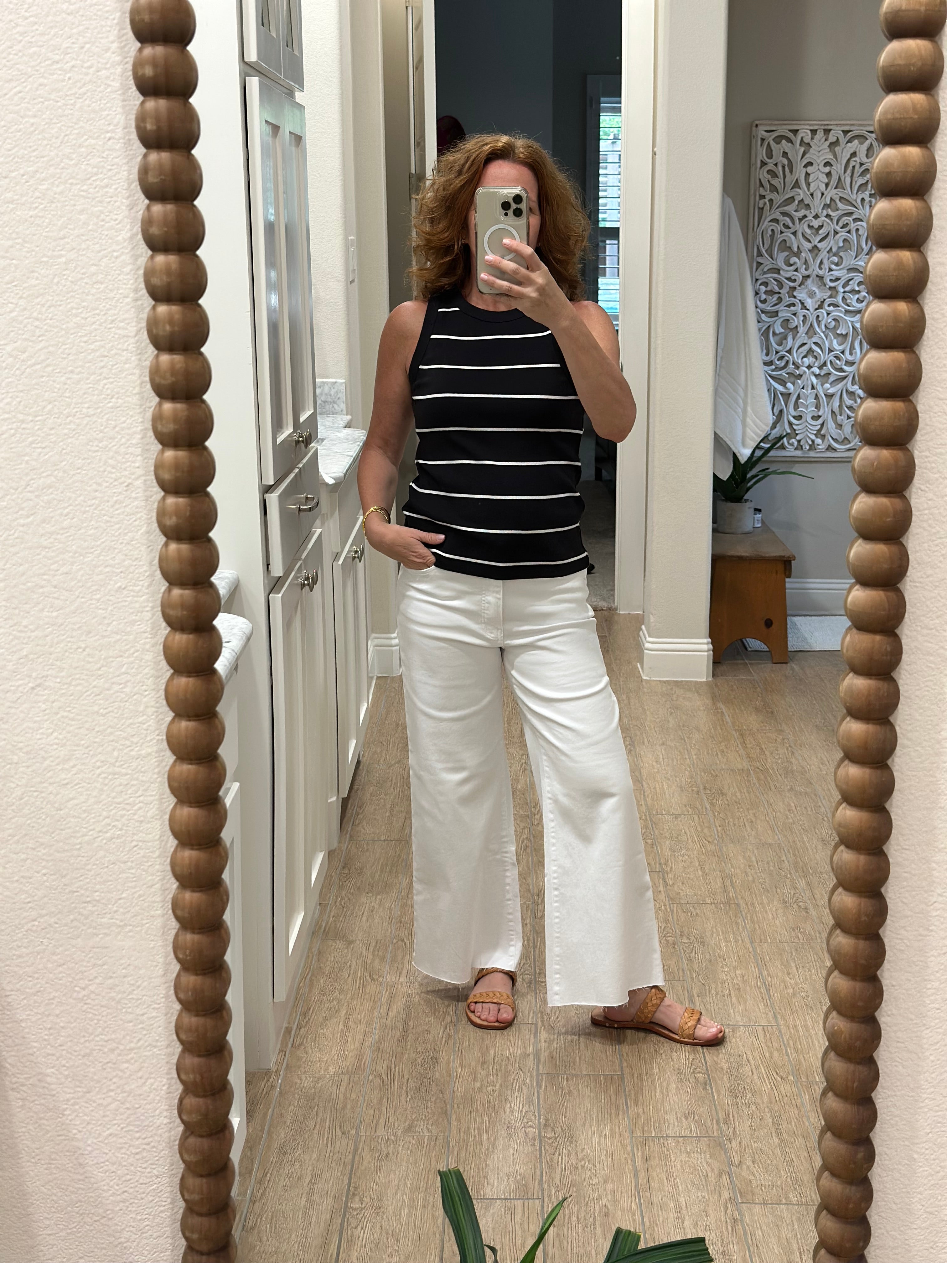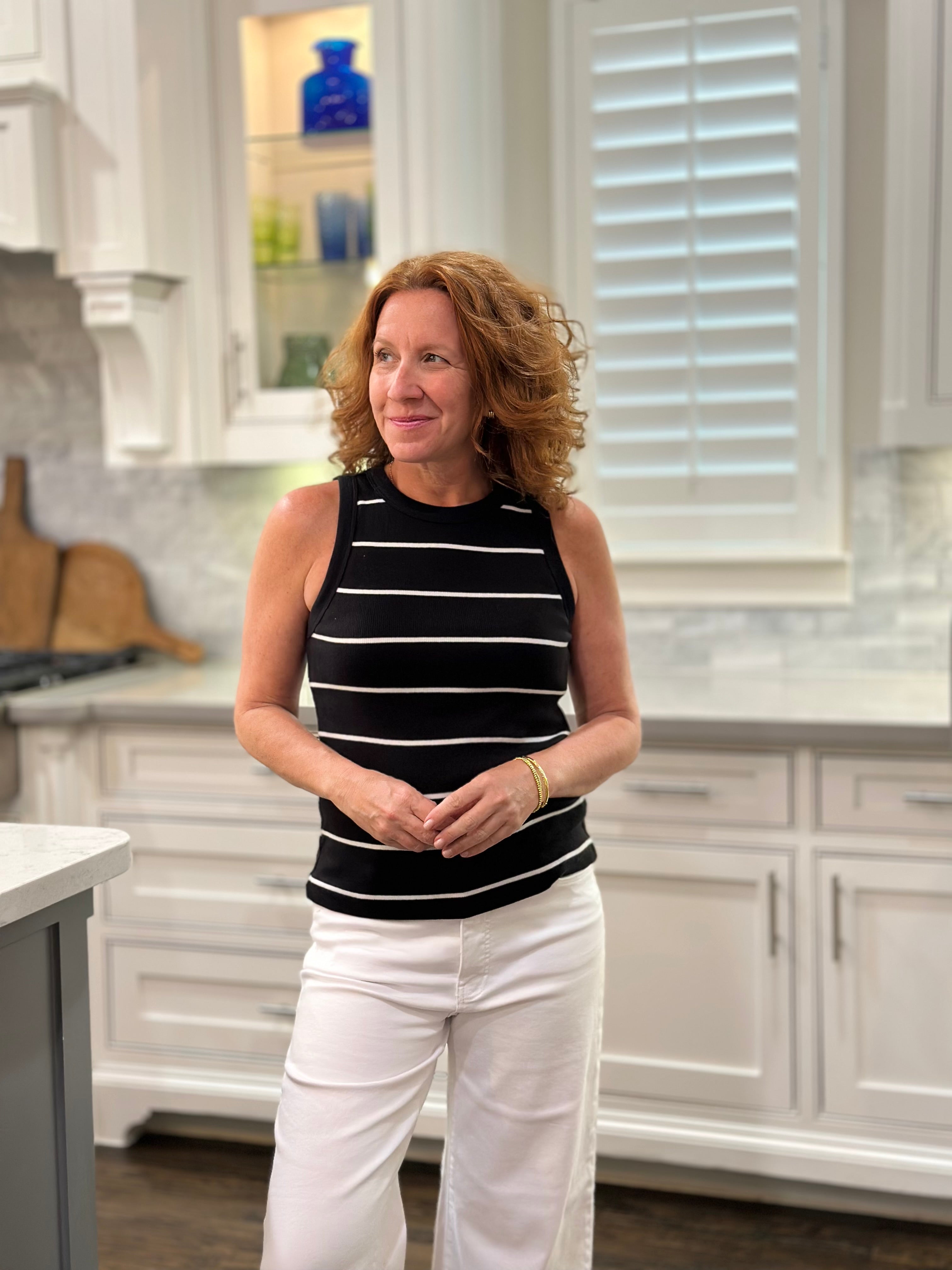The Dylan Jude Stripe Tank features a soft cotton fabric to provide full coverage, accompanied by a classic crew neckline and thick straps for optimal comfort.