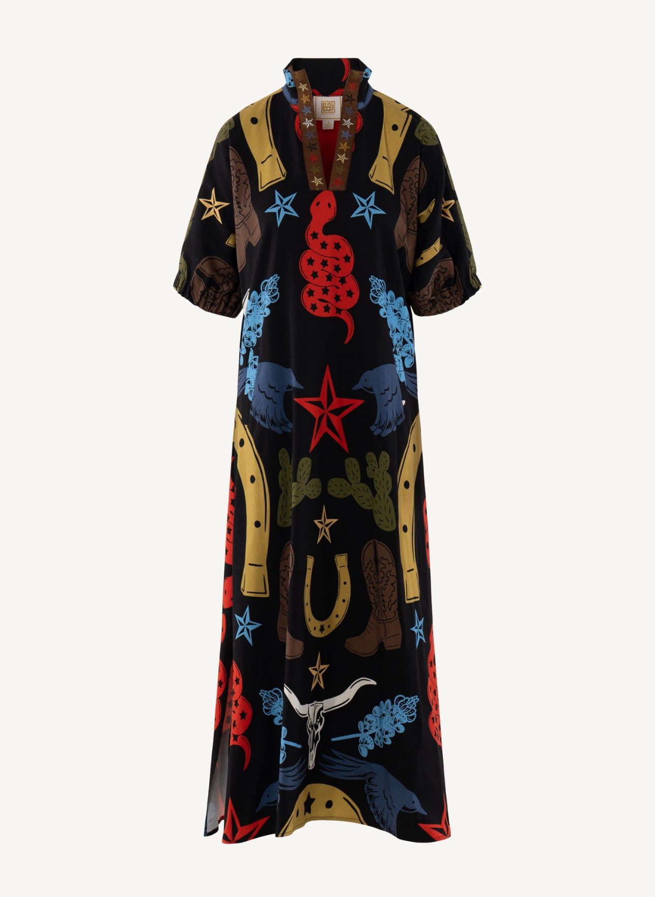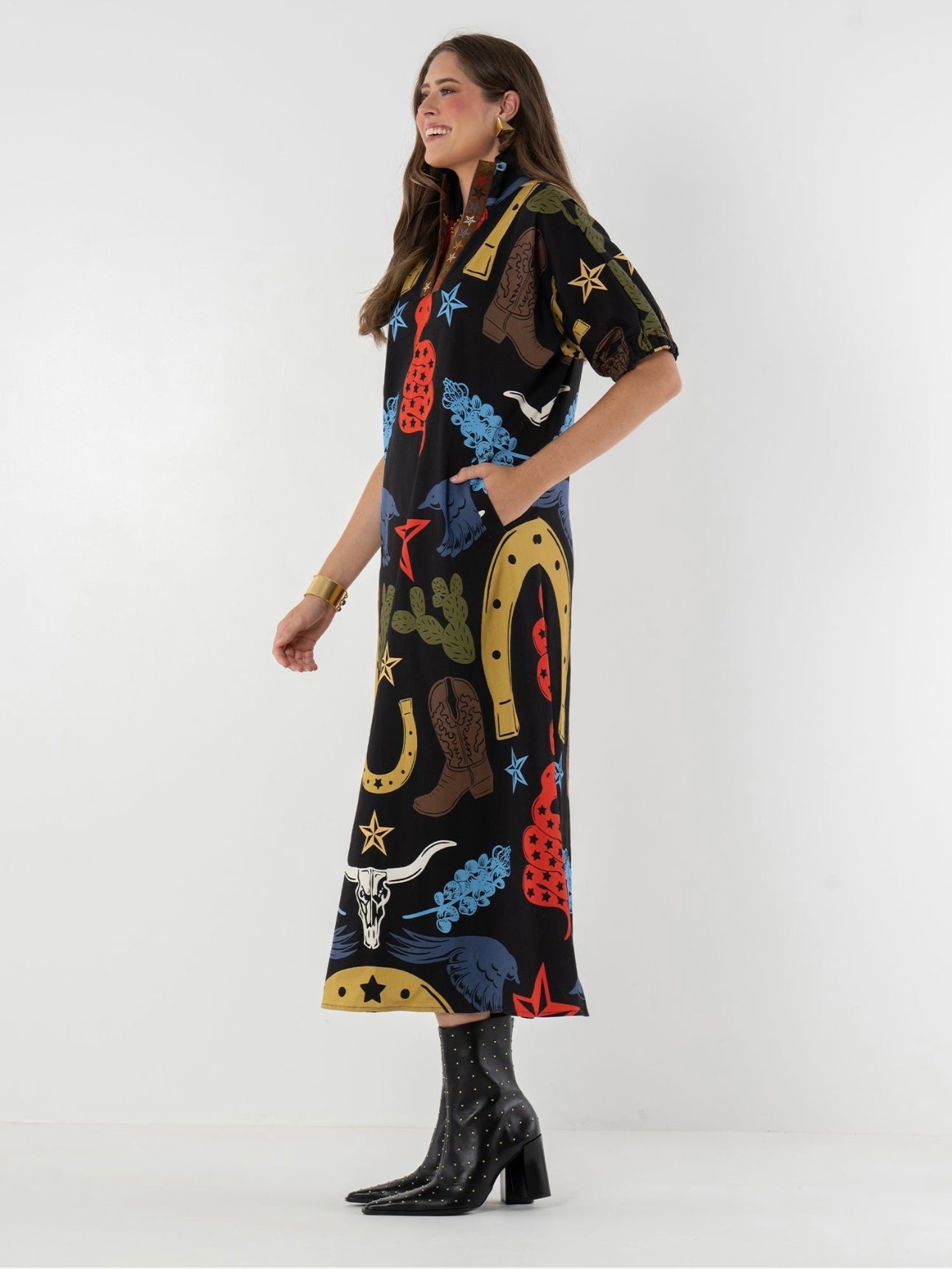 The Poppy Maxi in Lone Star is a bold ode to Texas style, featuring a classic stand collar, loose elastic dolman sleeves, and an effortless, relaxed silhouette that flows into a maxi-length hem. Designed with side slits for ease of movement and subtle allure, this style also includes practical front slit pockets. The Lone Star print captures the spirit of the West with iconic Texan symbols layered in vibrant color for a striking effect. Finished with a curved shirt-tail hem, this maxi brings a touch of western edge while staying true to feminine, easy elegance.